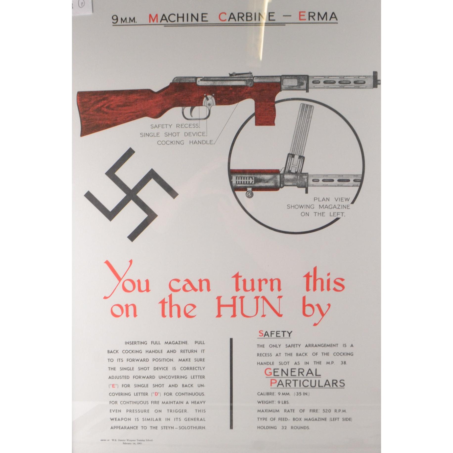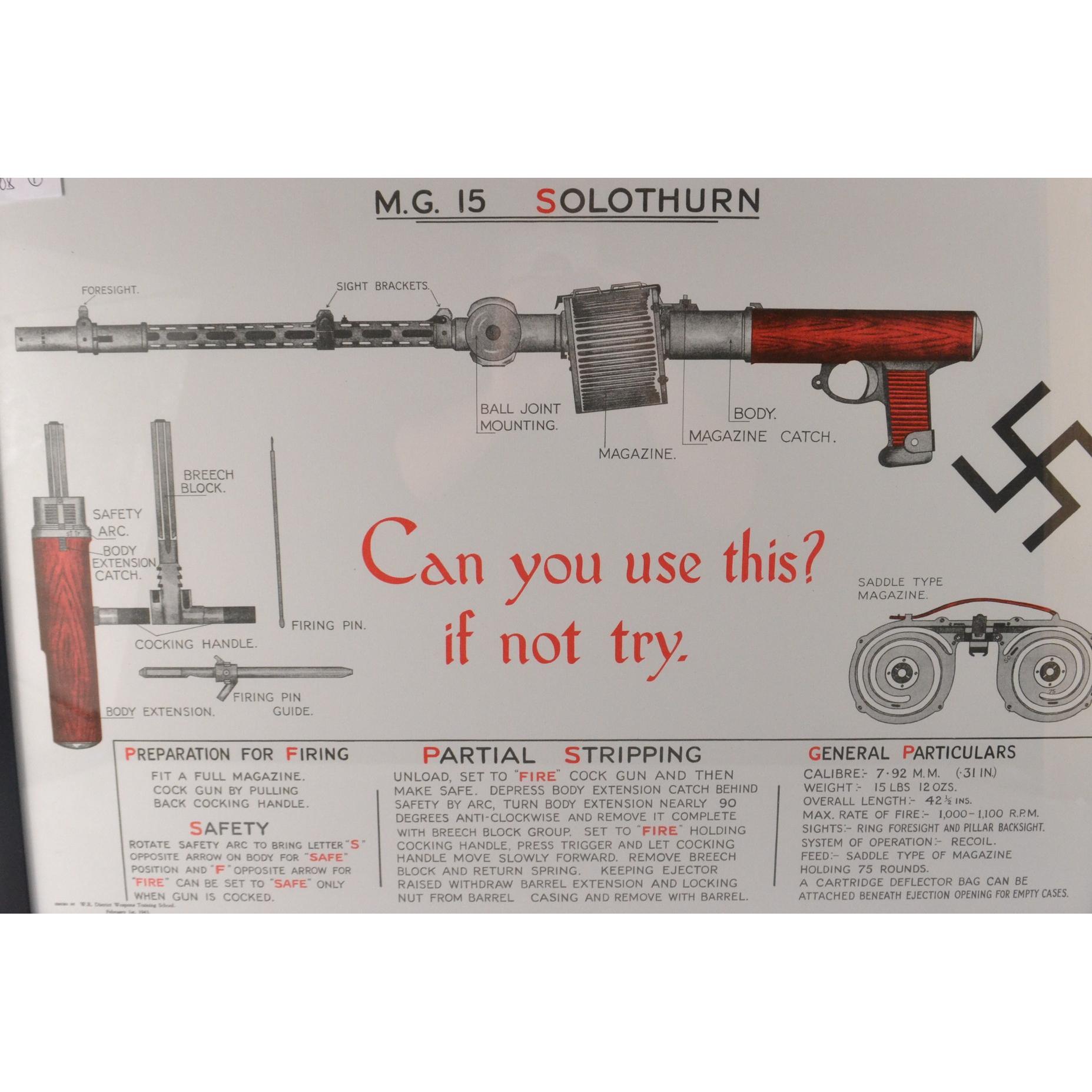 Two framed Posters depicting WW2 Machine Gun Instructions eg MG15 SOLUTHORN and a 9mm Machine Carbine - ERMA frame size 60cm x 48cm approxApprox 2 pieces
