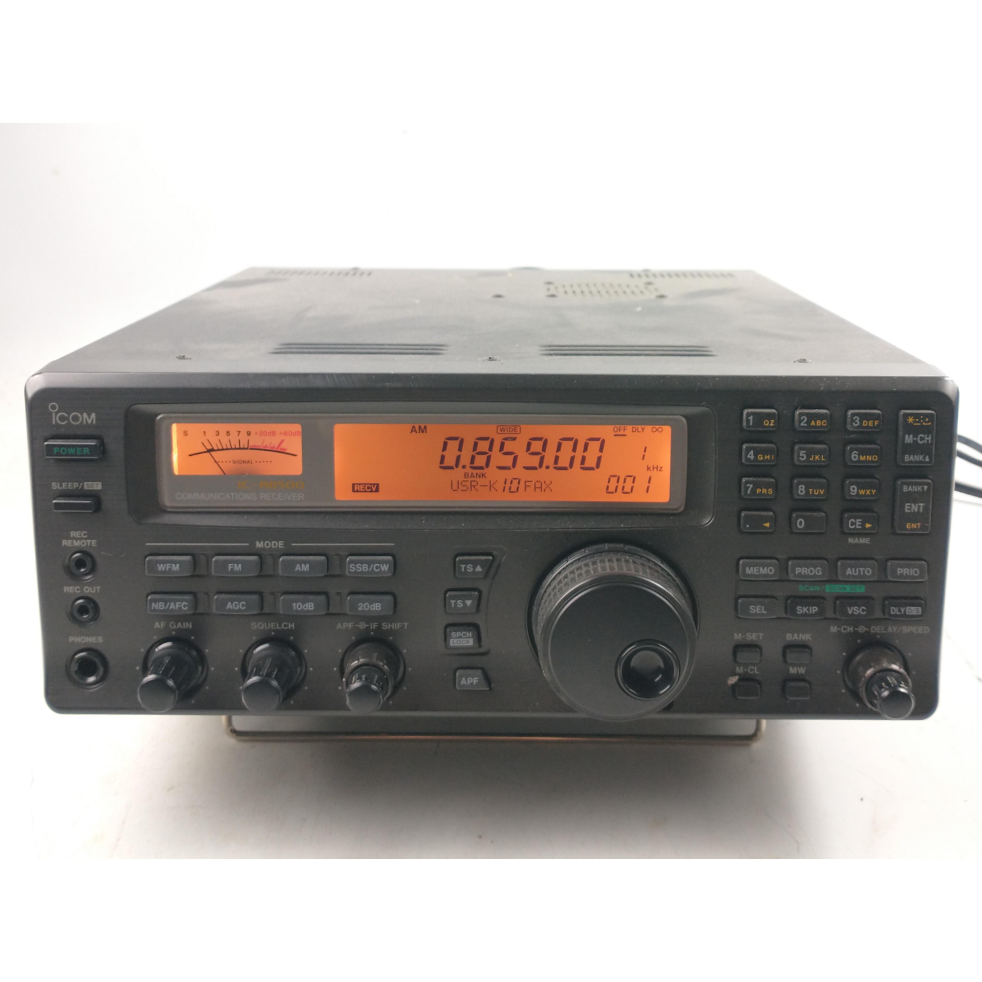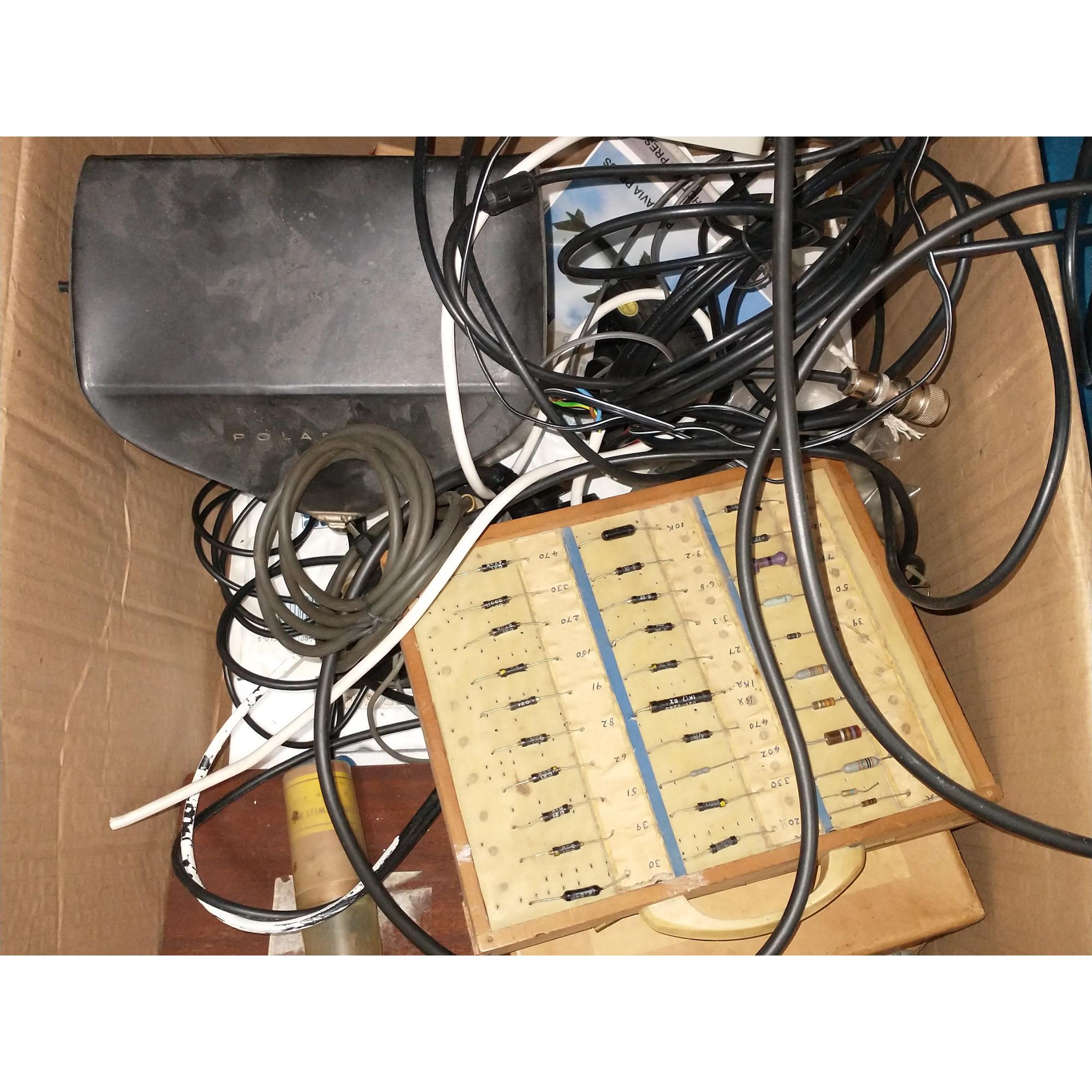 An ICOM IC-R8 500 Communications receiver within a mixed box of electronic curios and cabling etc etc