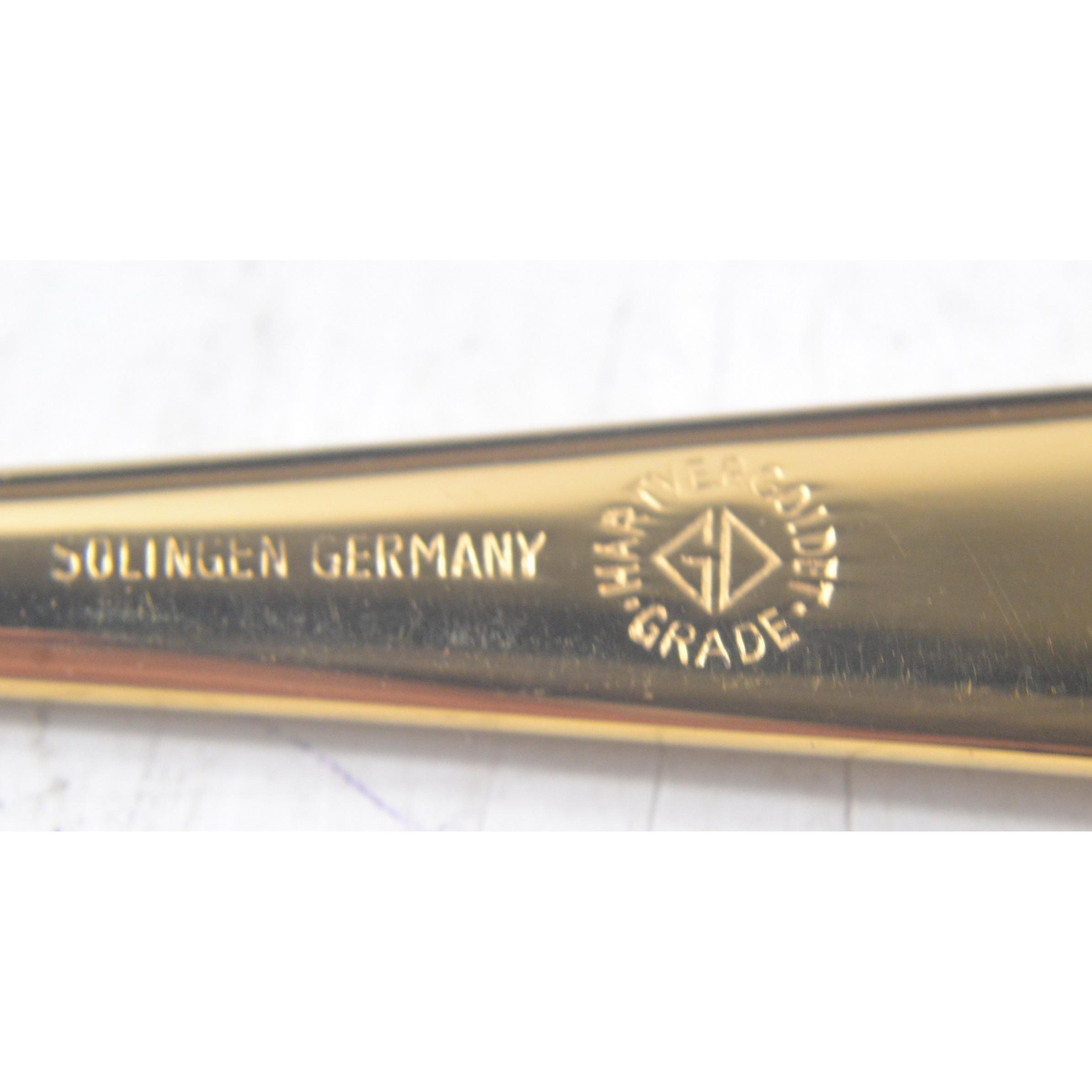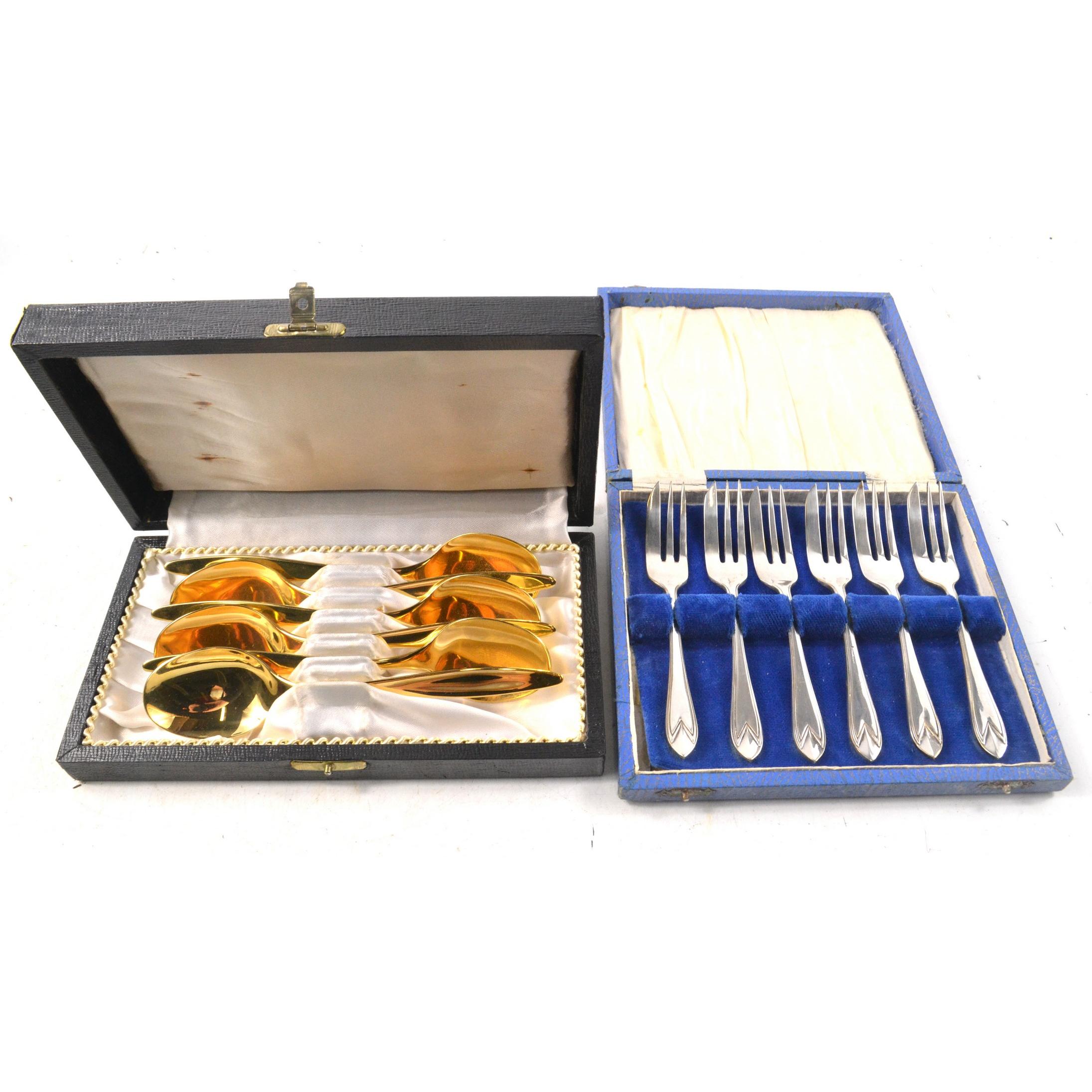 A canteen of 6 gold style tea spoons and a canteen of 6 cake forksApprox 2 pieces