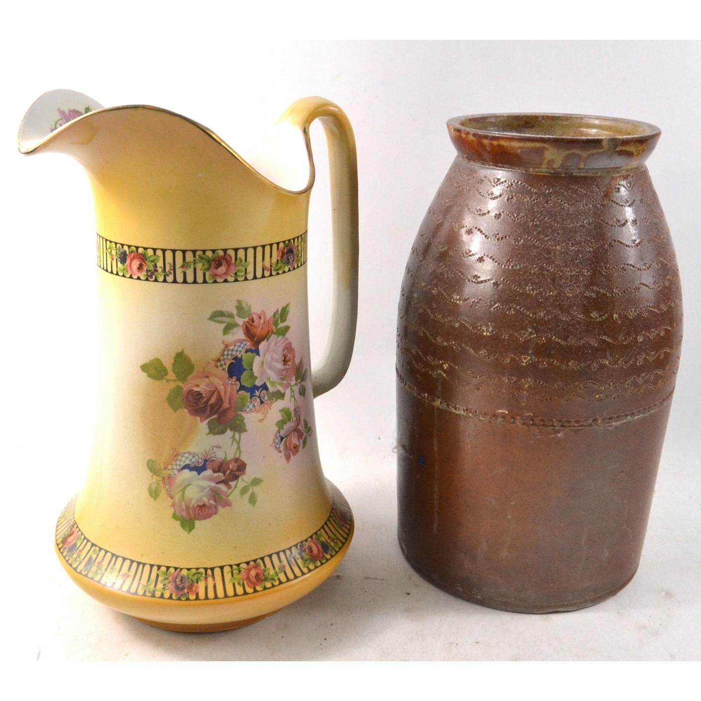 A box with two large jugs one of which is pottery 32cm in height Approx 2 pieces
