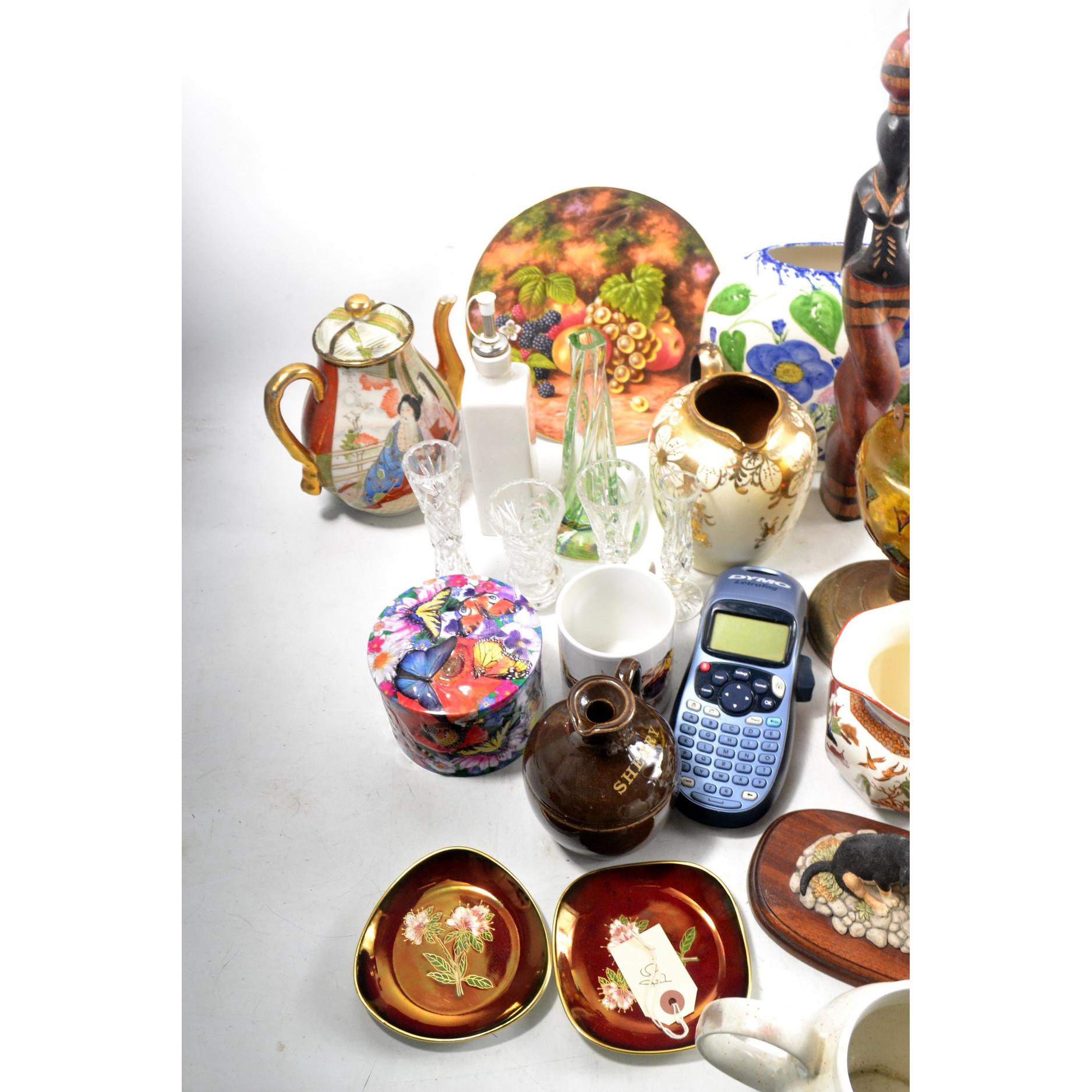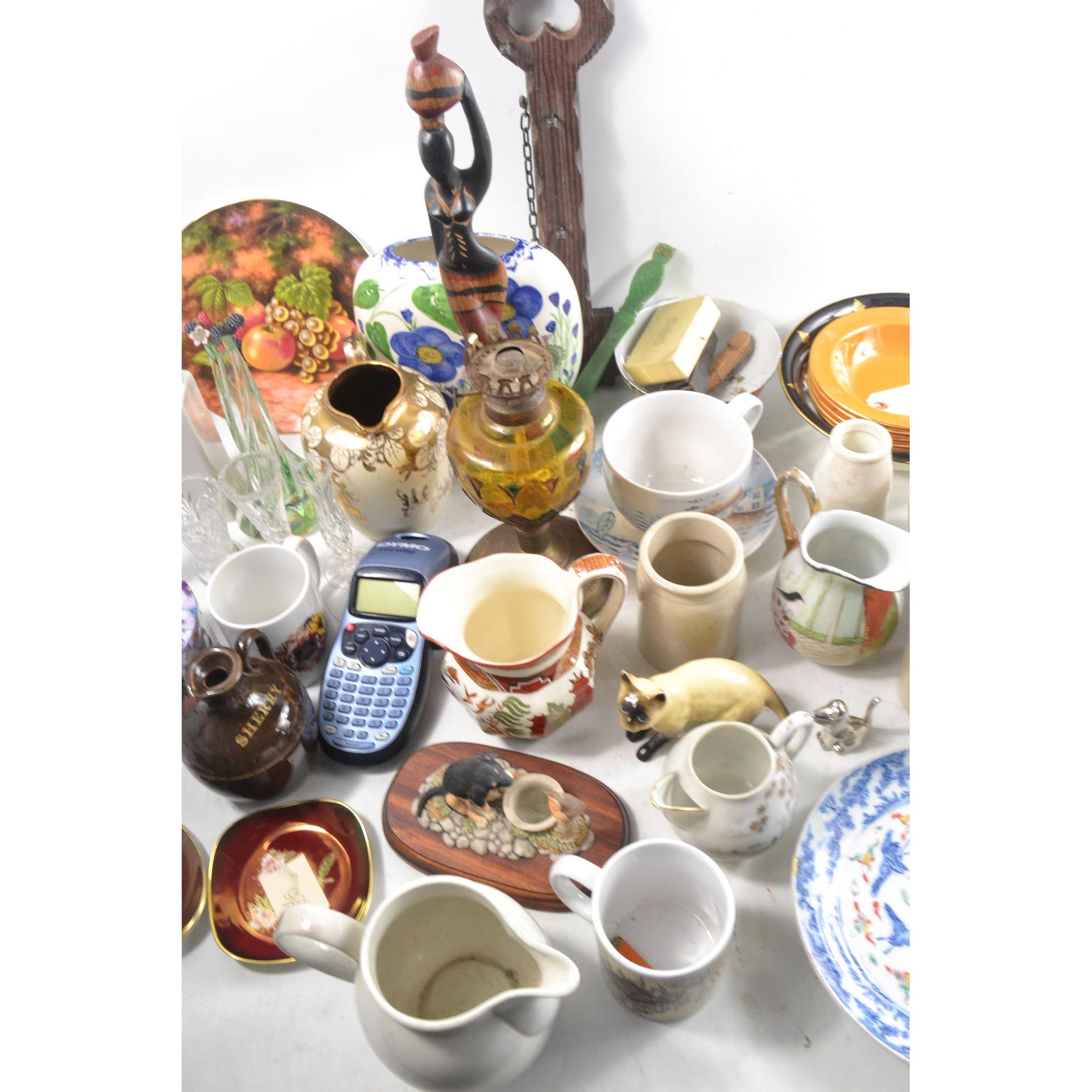 Large box of china and glassware to include oil lamp, jugs, stoneware jugs and much much more