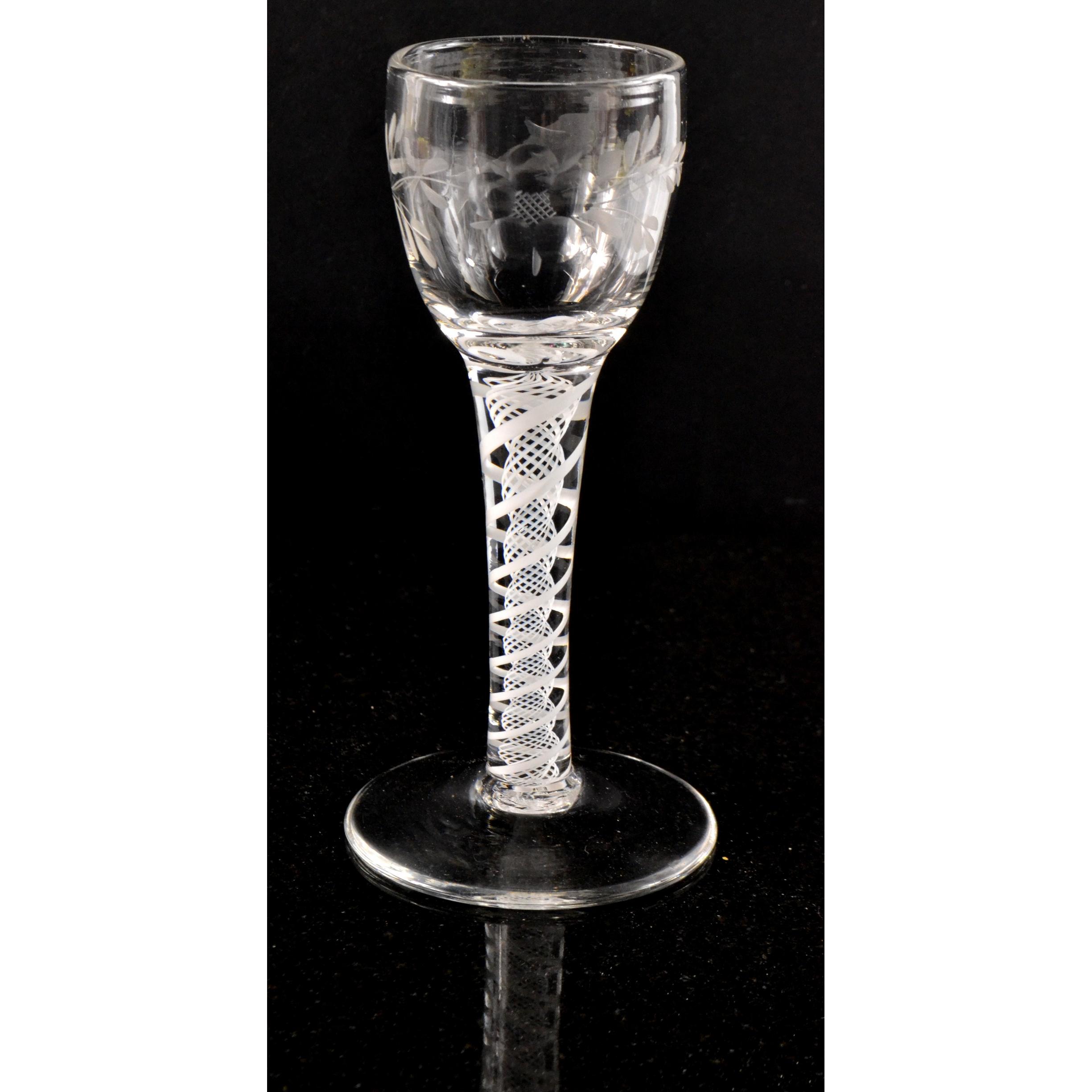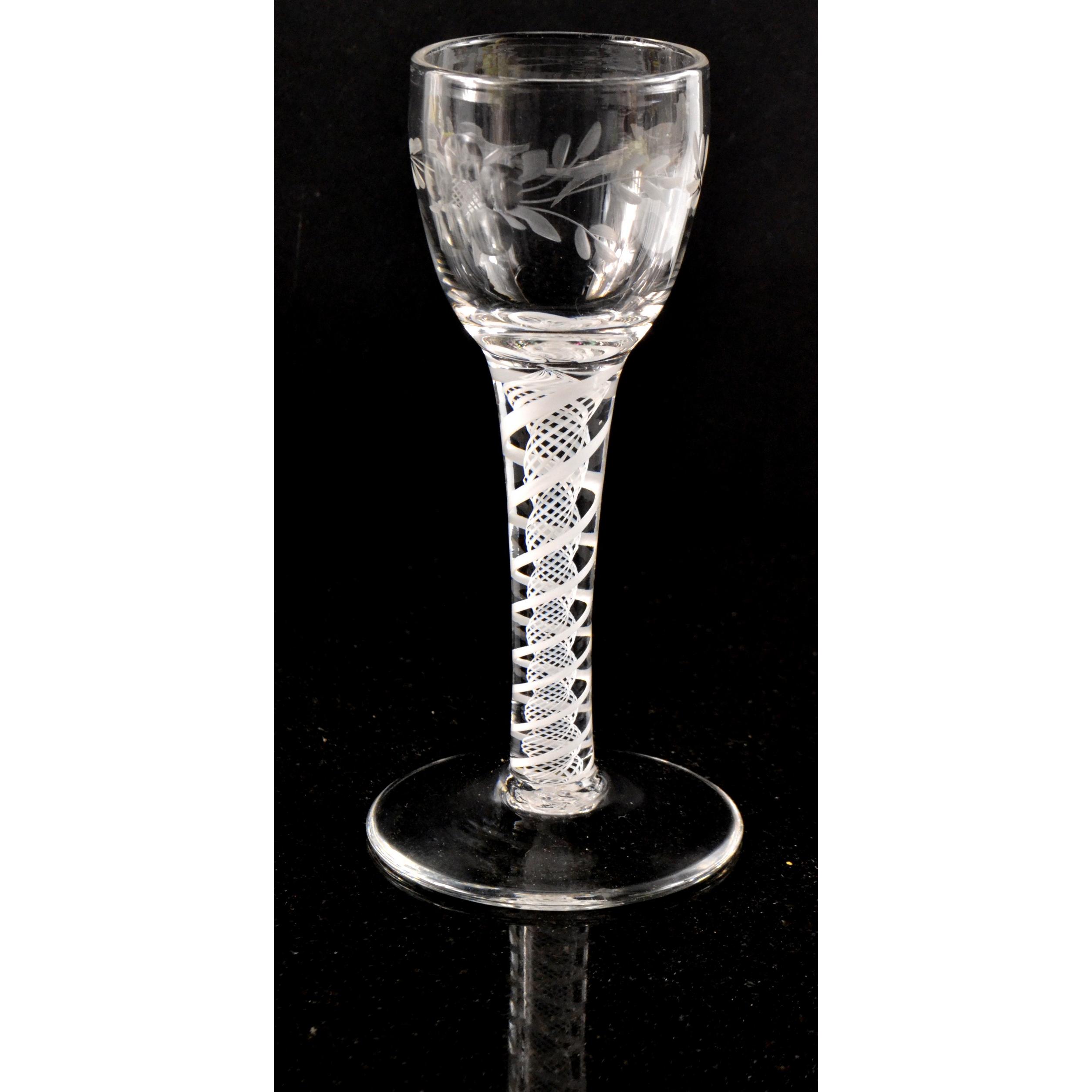 An air-twist Georgian circa1750-1795 wine glass.The stem features two spiral mercury air threads outwith a mercury spiral gauze double series mercury air twist height 14.5cm, diameter of foot 7.1cm and diameter of bowl 5.1cm wine glass with wild birds and fauna etched around the bowl