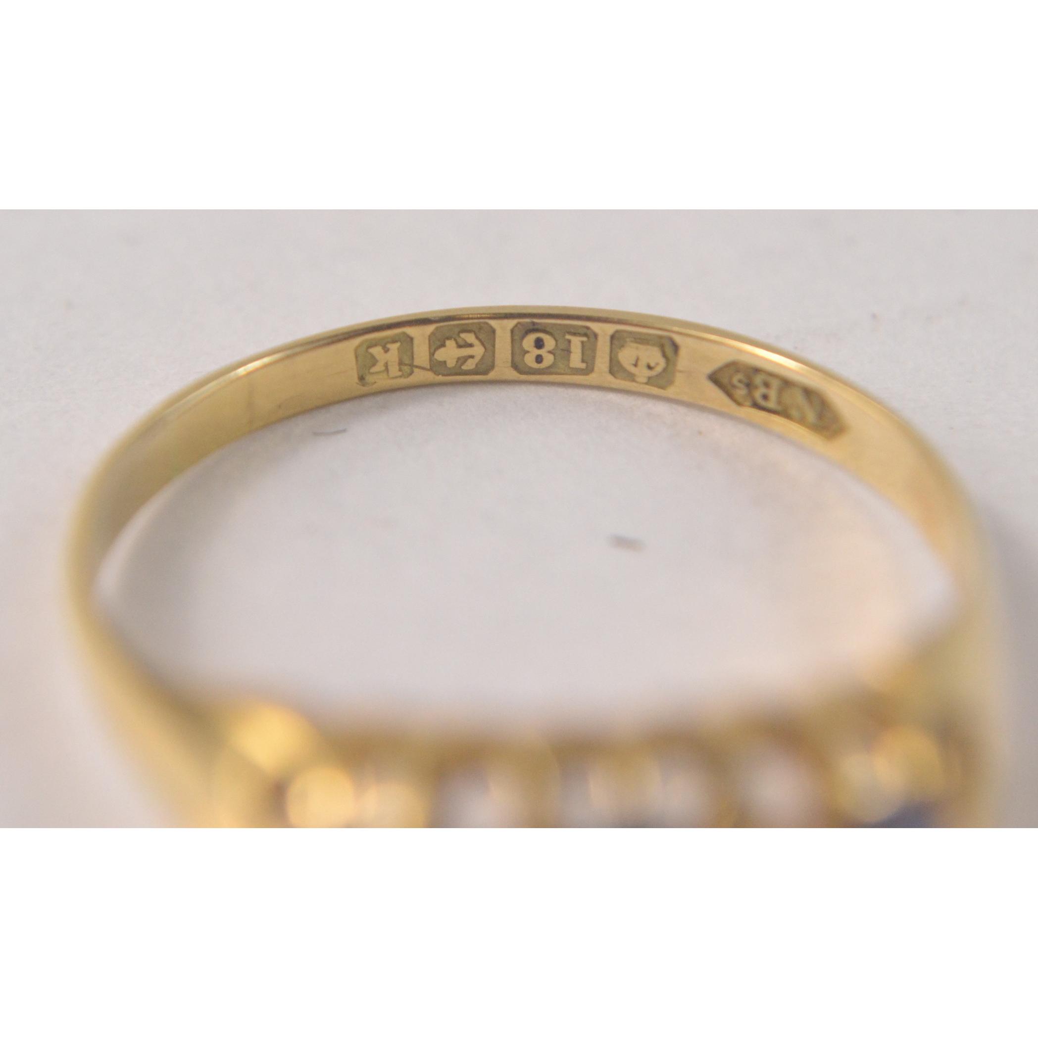 Hallmarked 18ct yellow gold ring set with 3 pale blue stones and 4 diamond spacers [size Q/R ]Gross weight approx 2.5grm
