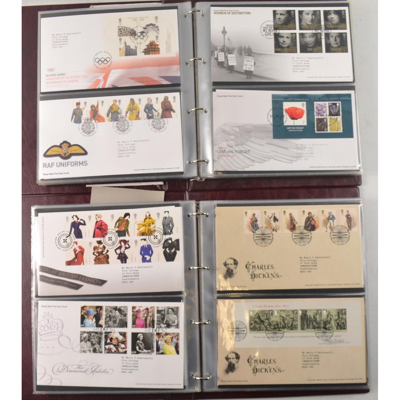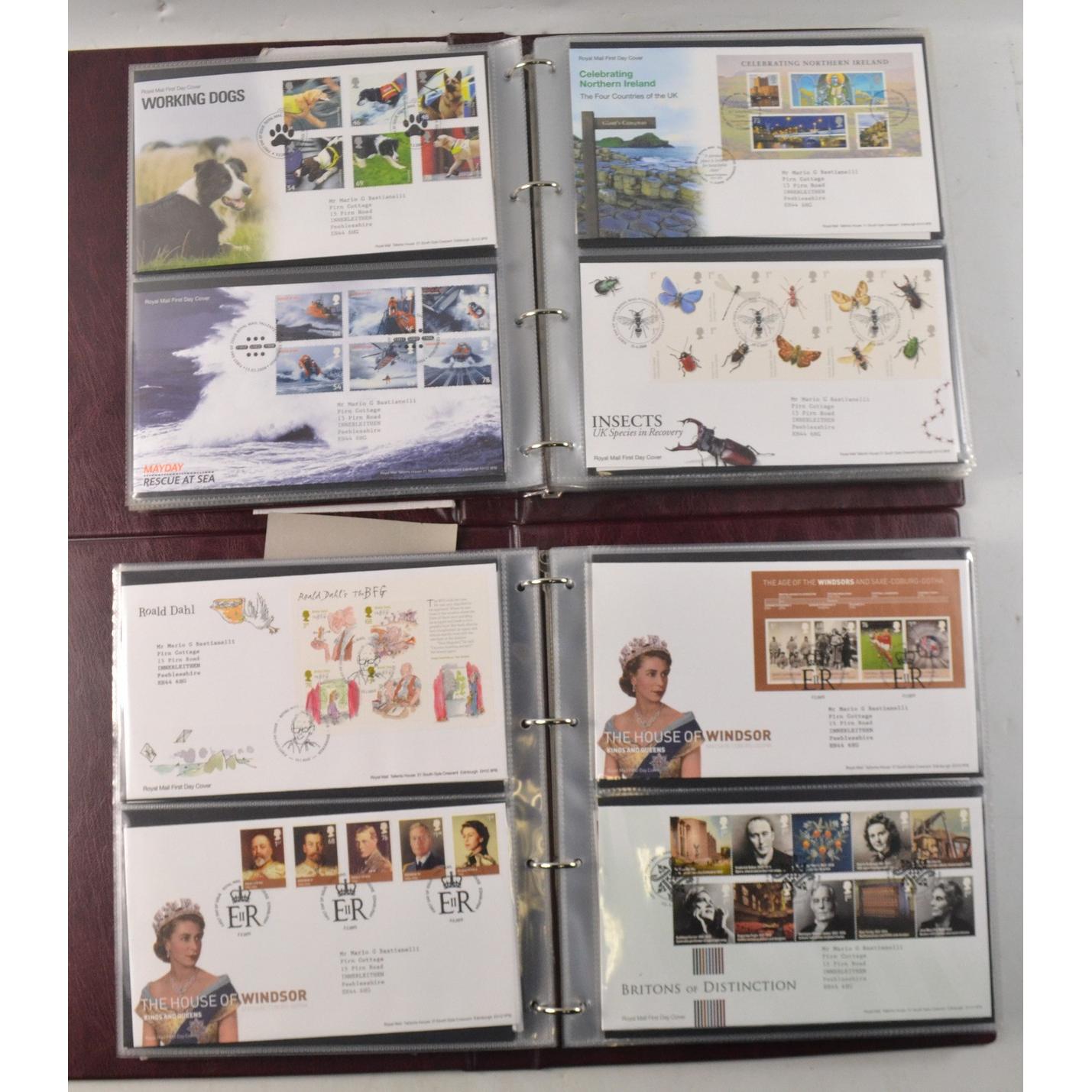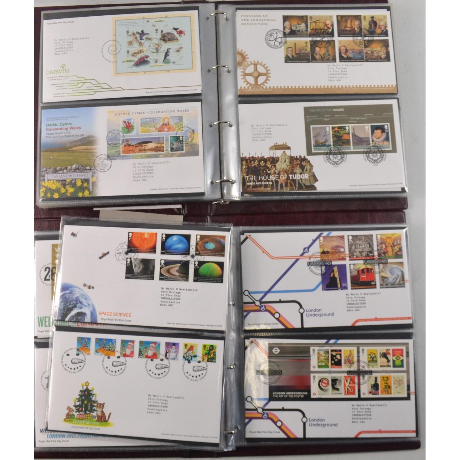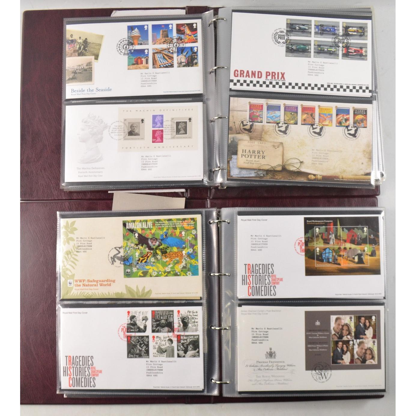 Two books of Royal Mail First Day Covers, to include The Royal Wedding of Prince William and Cathrine Middleton, The House of Hanover, Christmas 2012, and Football Heroes, Harry Potter, Darwin, and Winnie the Pooh.