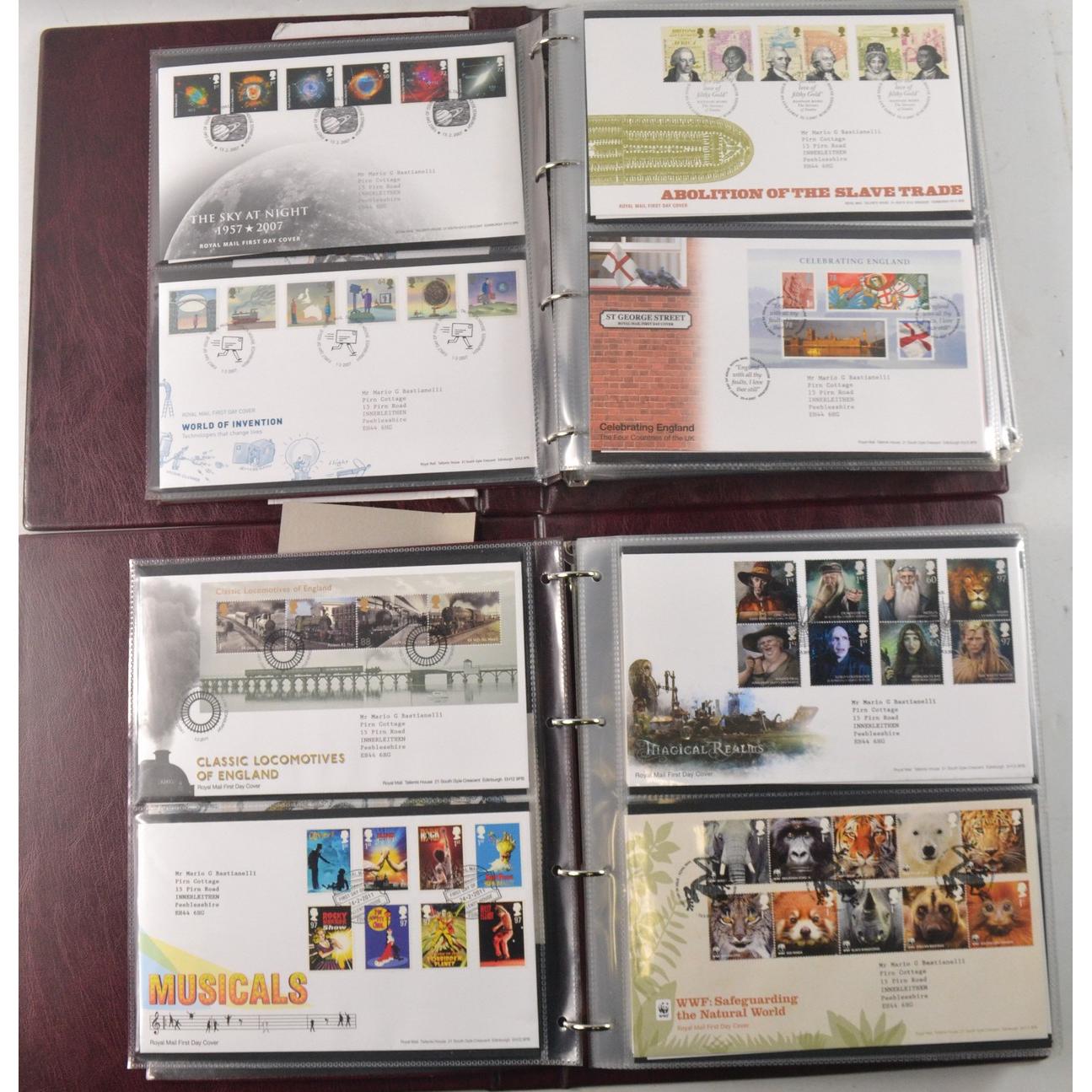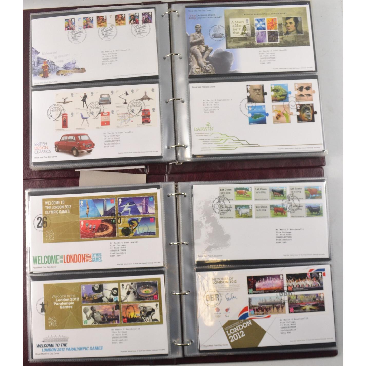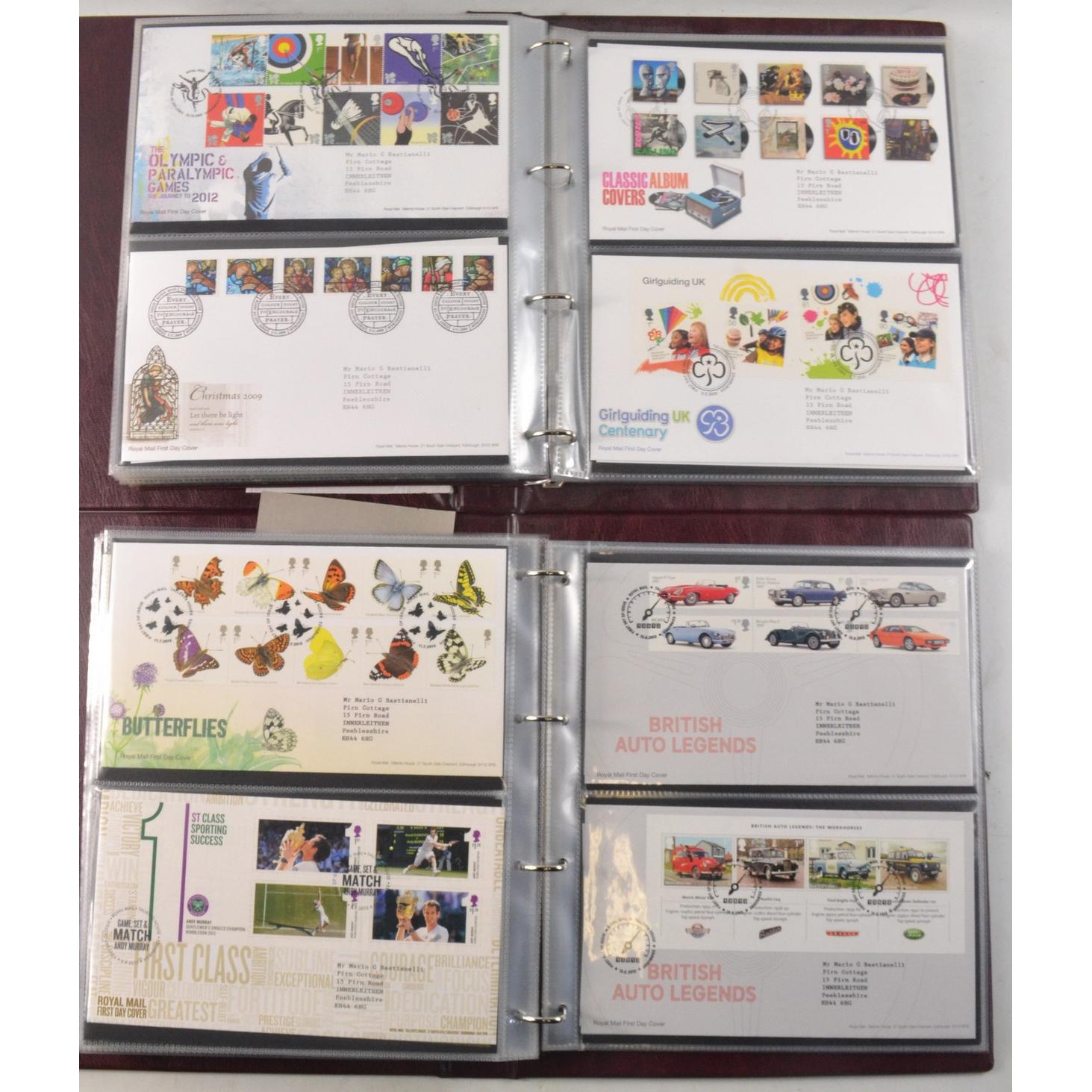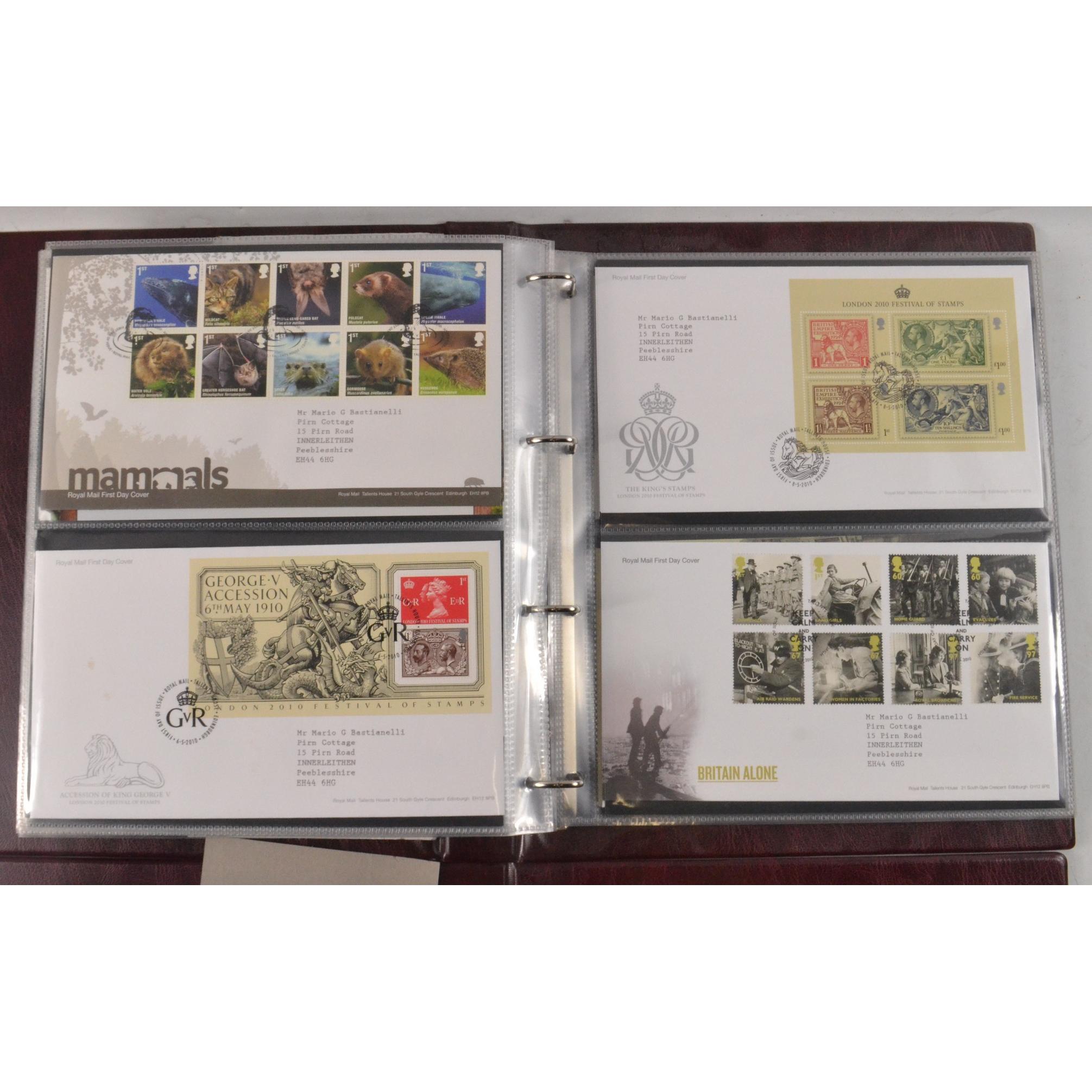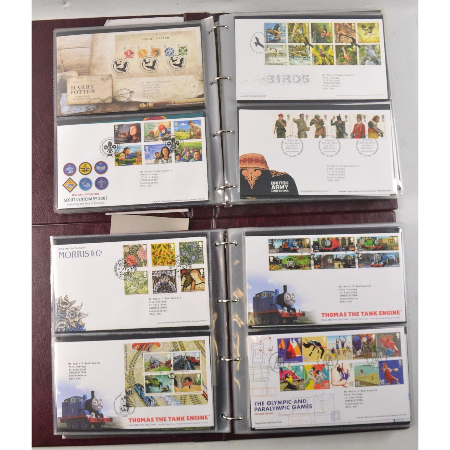 Two books of Royal Mail First Day Covers, to include The Royal Wedding of Prince William and Cathrine Middleton, The House of Hanover, Christmas 2012, and Football Heroes, Harry Potter, Darwin, and Winnie the Pooh.
