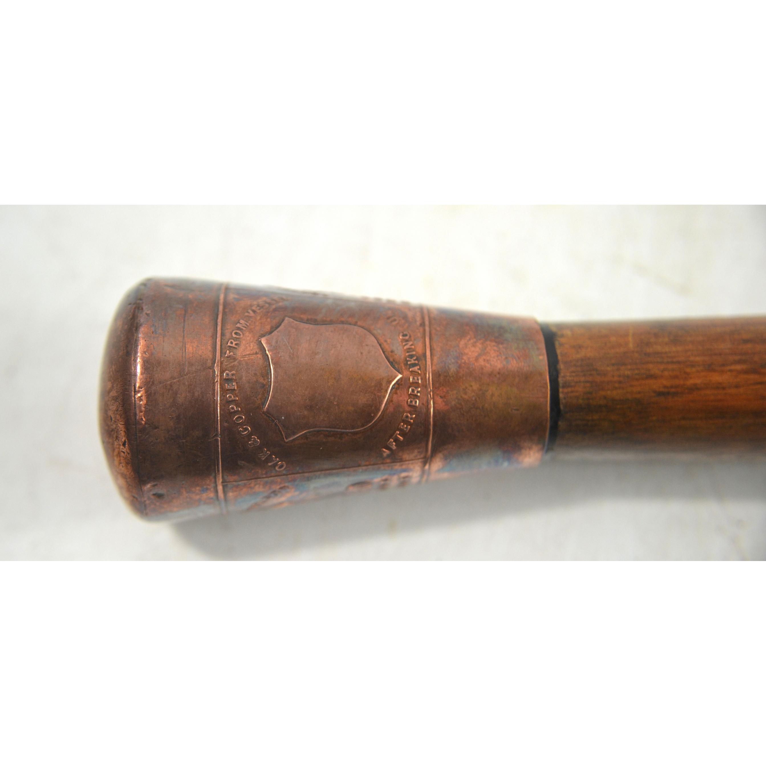 Horatio Viscount Nelson oak and copper walking stick. The copper head on the stick engraved with the facts that the oak and copper came from Nelson's Flagship 'H.M.S. FOUDROYANT' [1799-1801] after its breaking in Blackpool 1897. { Reg no 311490}