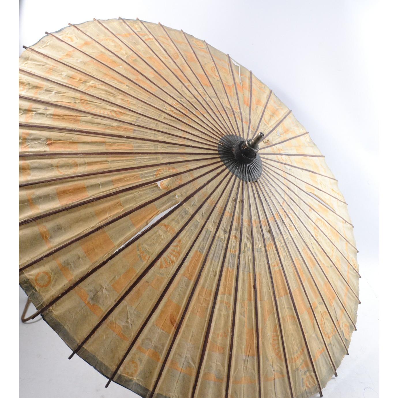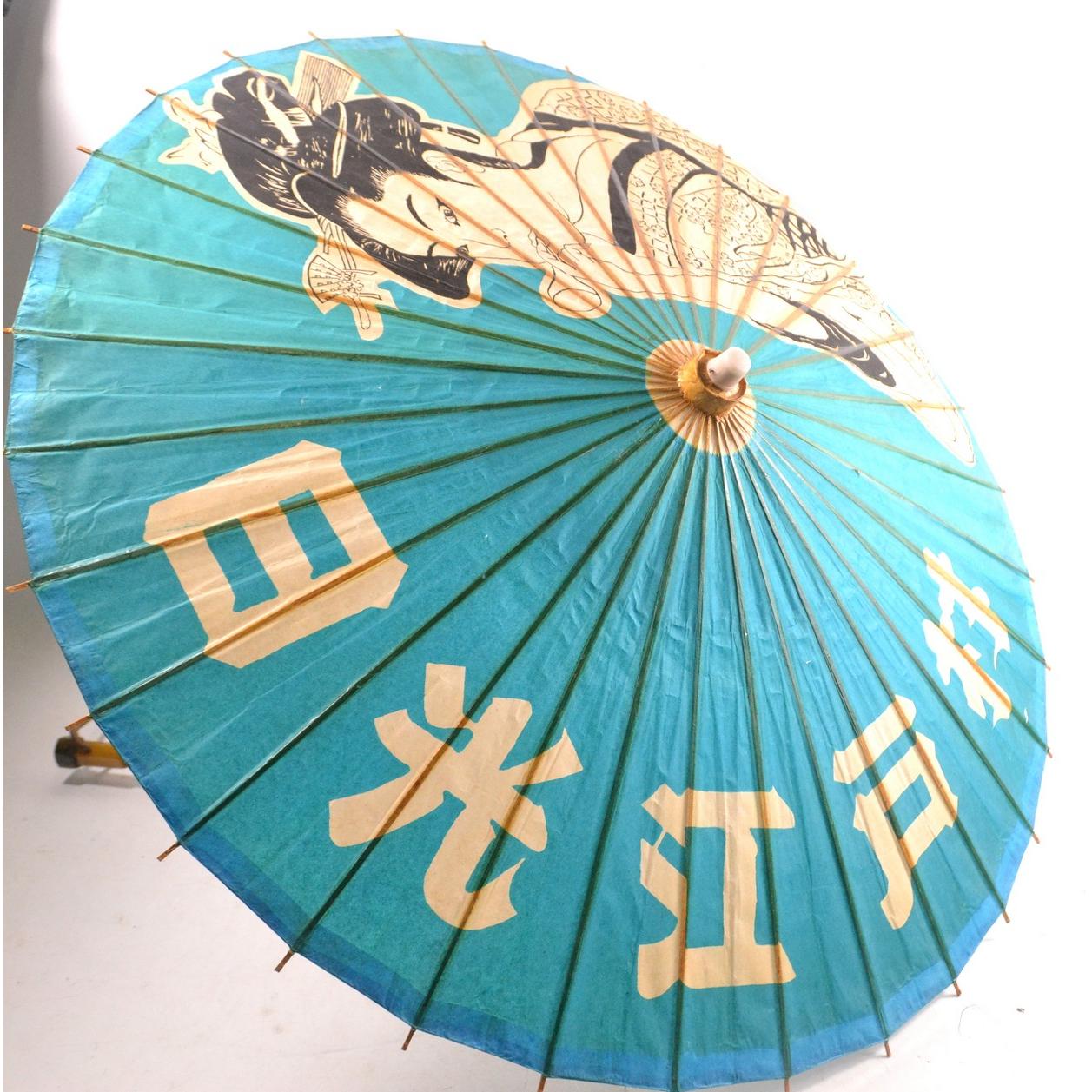 Collection of 3 Japanese style parasols to include blue based with Geisha lady (W: 78cm extended approx), blue rimmed with swirl pattern (W: 80cm extended approx) (some rips to paper) and blue scenes of various Japanese icons on each panel (W: 96cm extended approx) (some taped rips)