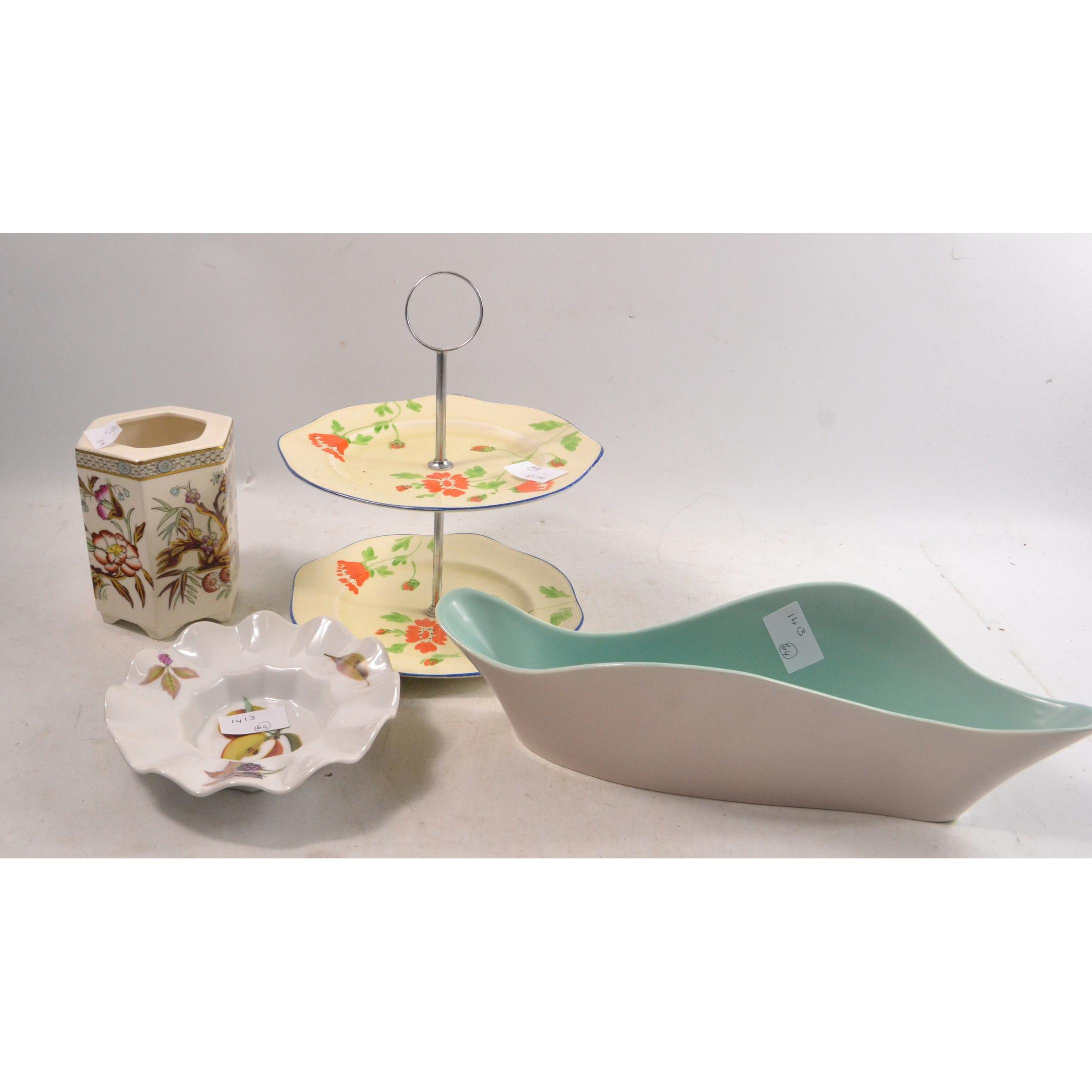 Selection of named china to include Poole wavy design aqua holder(L:34.5 cm W: 11cm approx), Masons 'Harrods' hexagonal flower holder (H: 13cm approx), Evesham style footed dish and James Kerr two tier cake stand (H: 22cm approx)