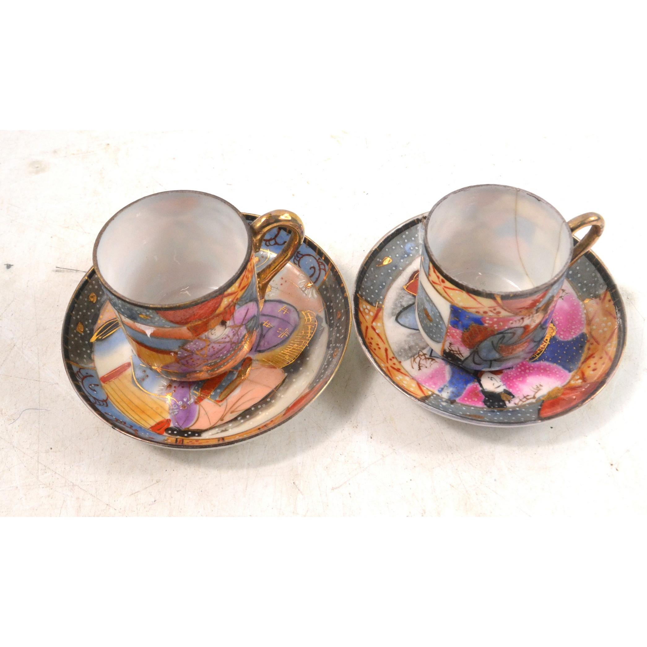 Two beautiful oriental cups and saucers. A repaired crack is on one of the cups. Signed to base.
