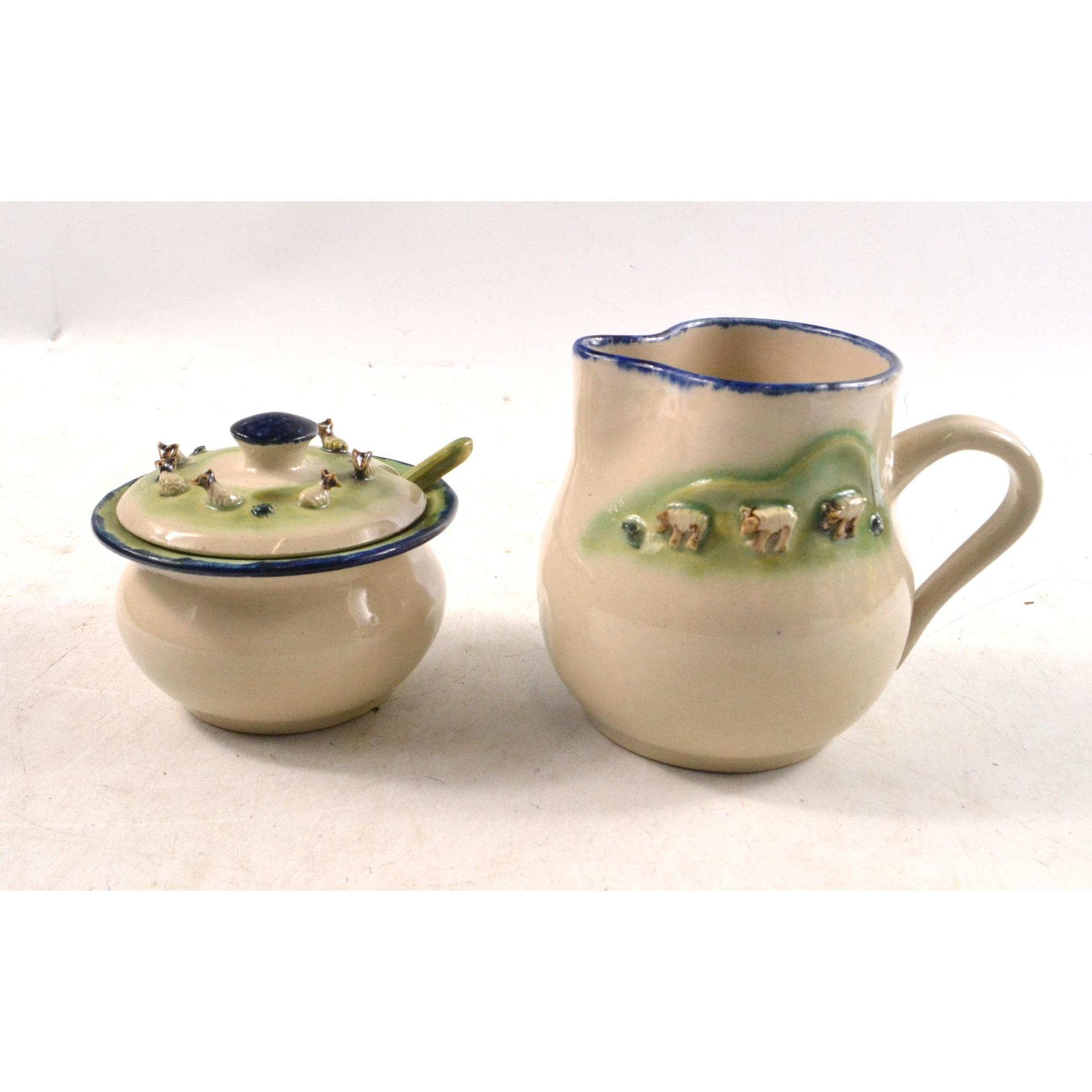 LOCAL INTEREST! A MARIANNE Finlayson STOW studio pottery milk jug 10.5cm tall x 8cm diameter, with also a nice lidded sugar bowl 8cm tall x 10cm diameter approx and pottery matching spoon with sheep and fields rural form design