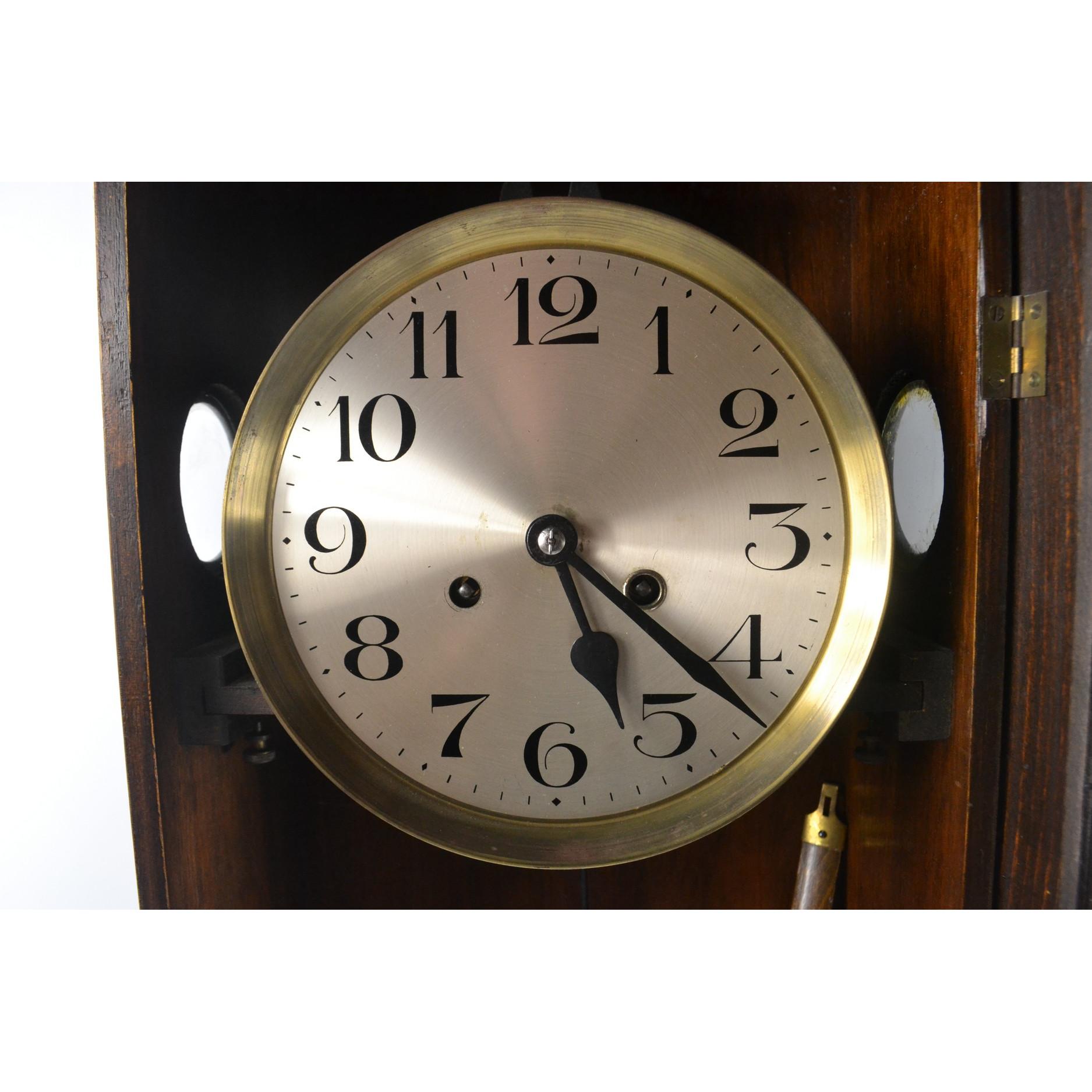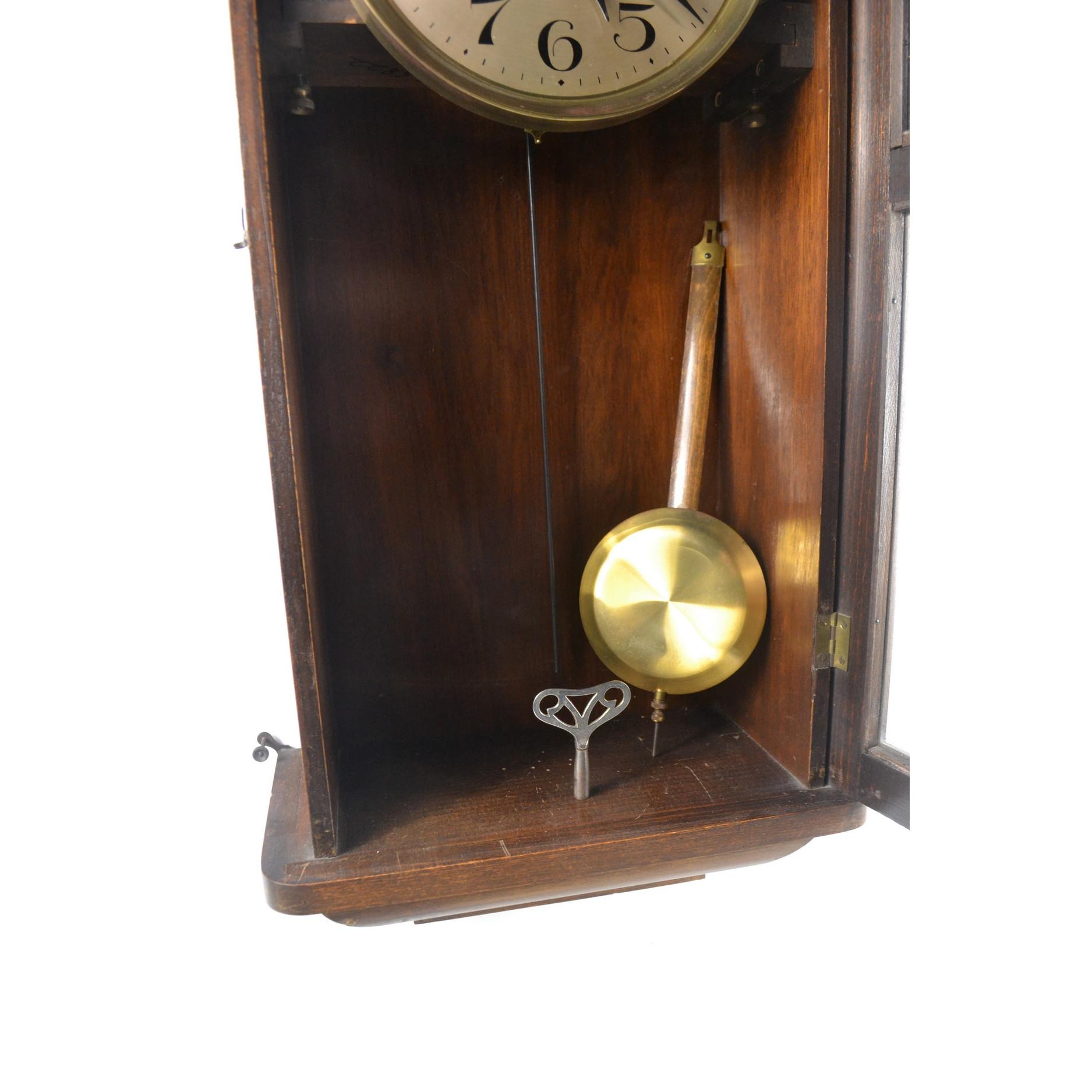 A c1930's wall chiming clock with pendulum and original key W: 33cm approx H: 80cm approx Approx 1 pieces
