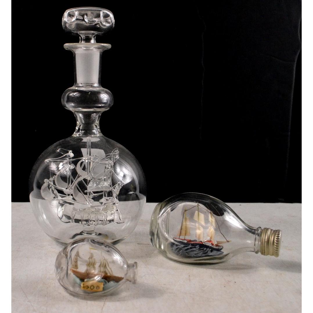 Three ‘SHIPS IN A BOTTLE(s) x3 one in miniature, one smaller one length 9cm x 5cm height and a larger glass galleon ship in a bottle with stopperApprox 3 pieces