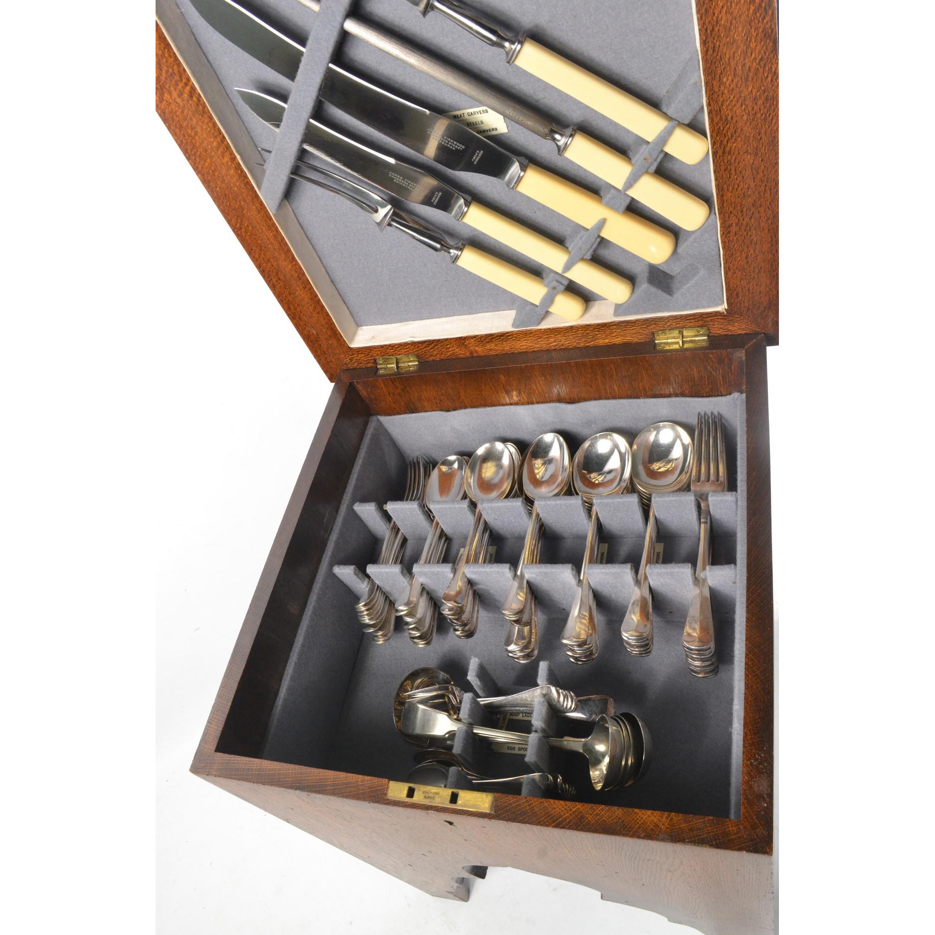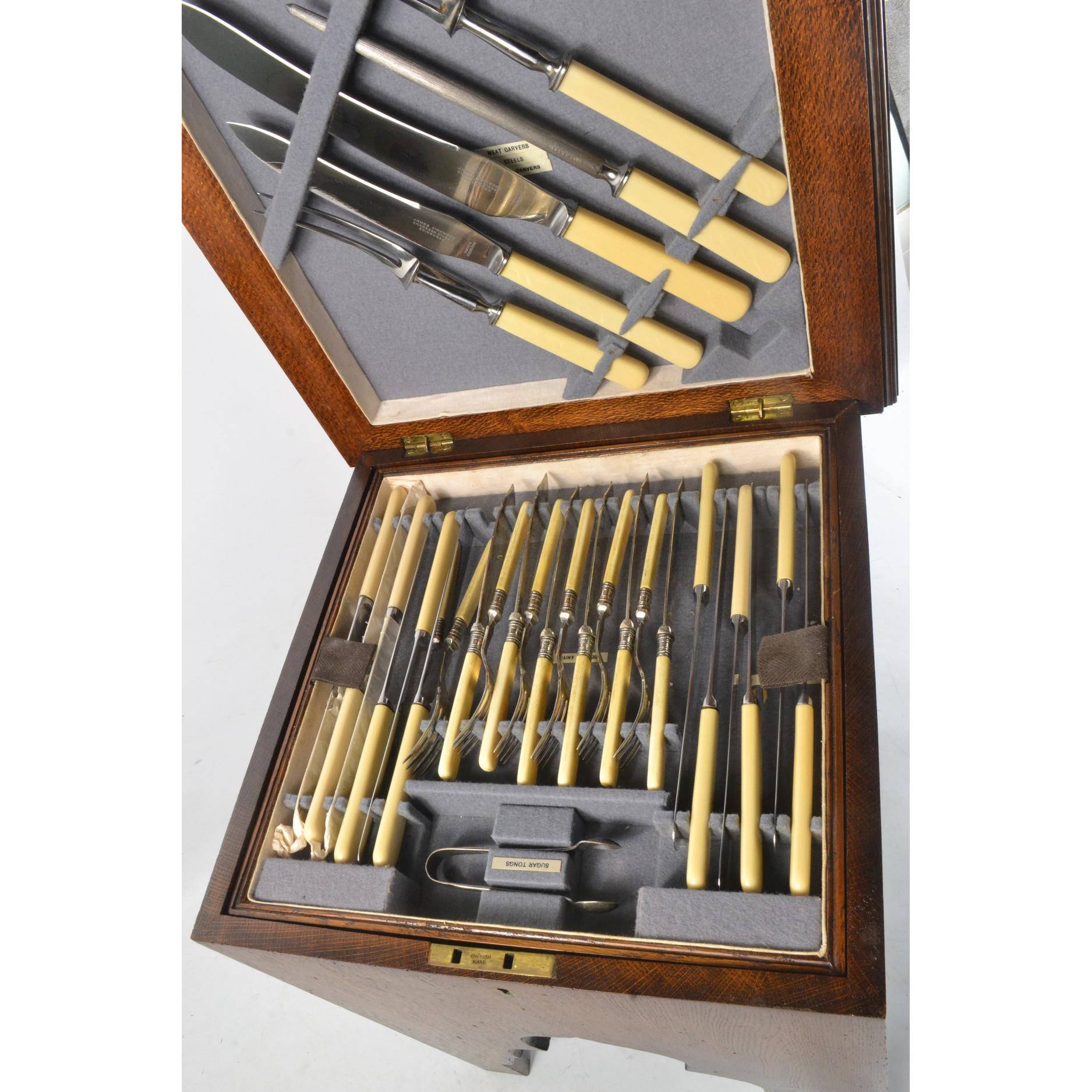 An EDWARDIAN oak cutlery canteen/chest full of nice quality cutlery and carving set