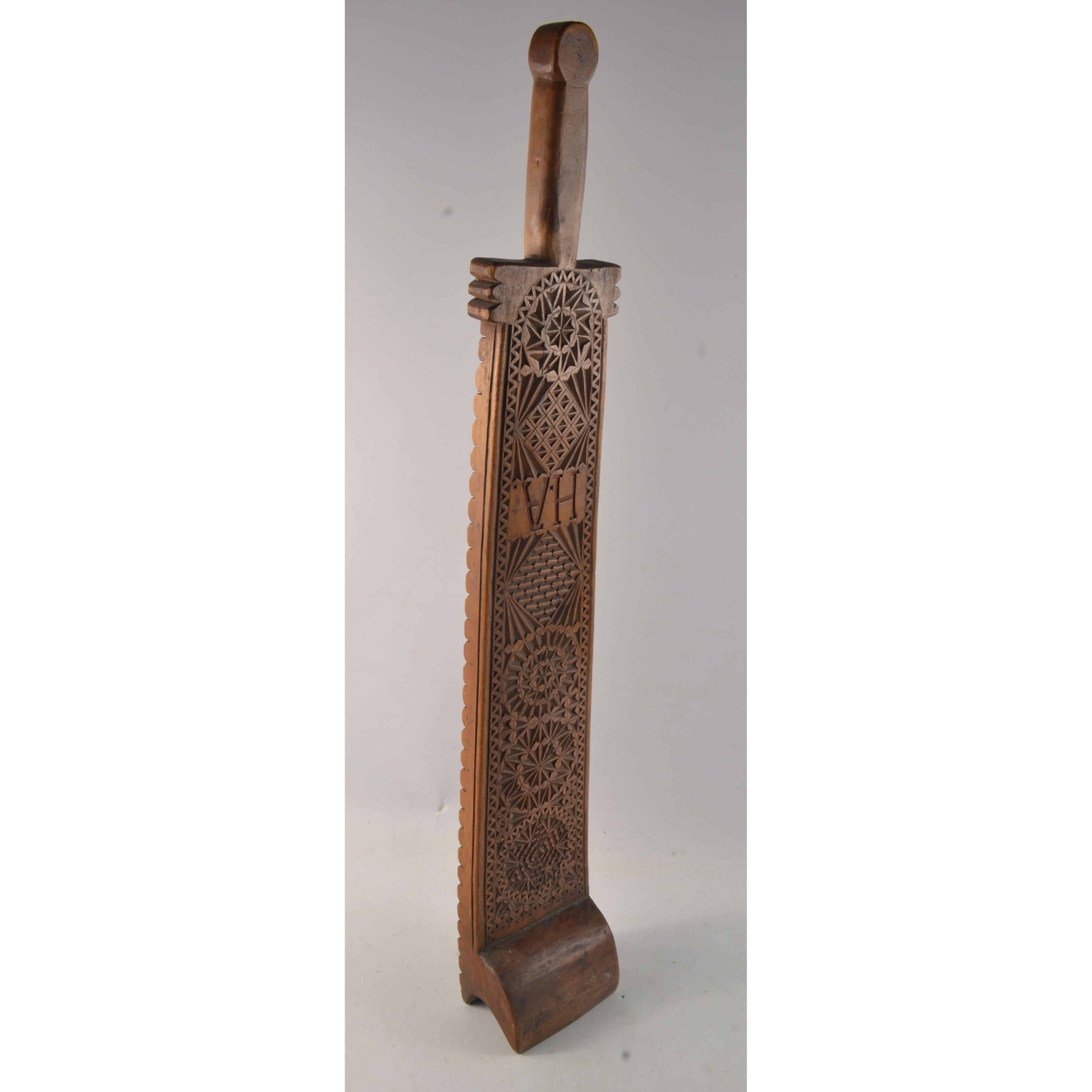 Very UNUSUAL carved wooden laundry paddle with washboard to back. Has Arabian style carved design and is self standingW: 12cm approx H: 72cm approx
