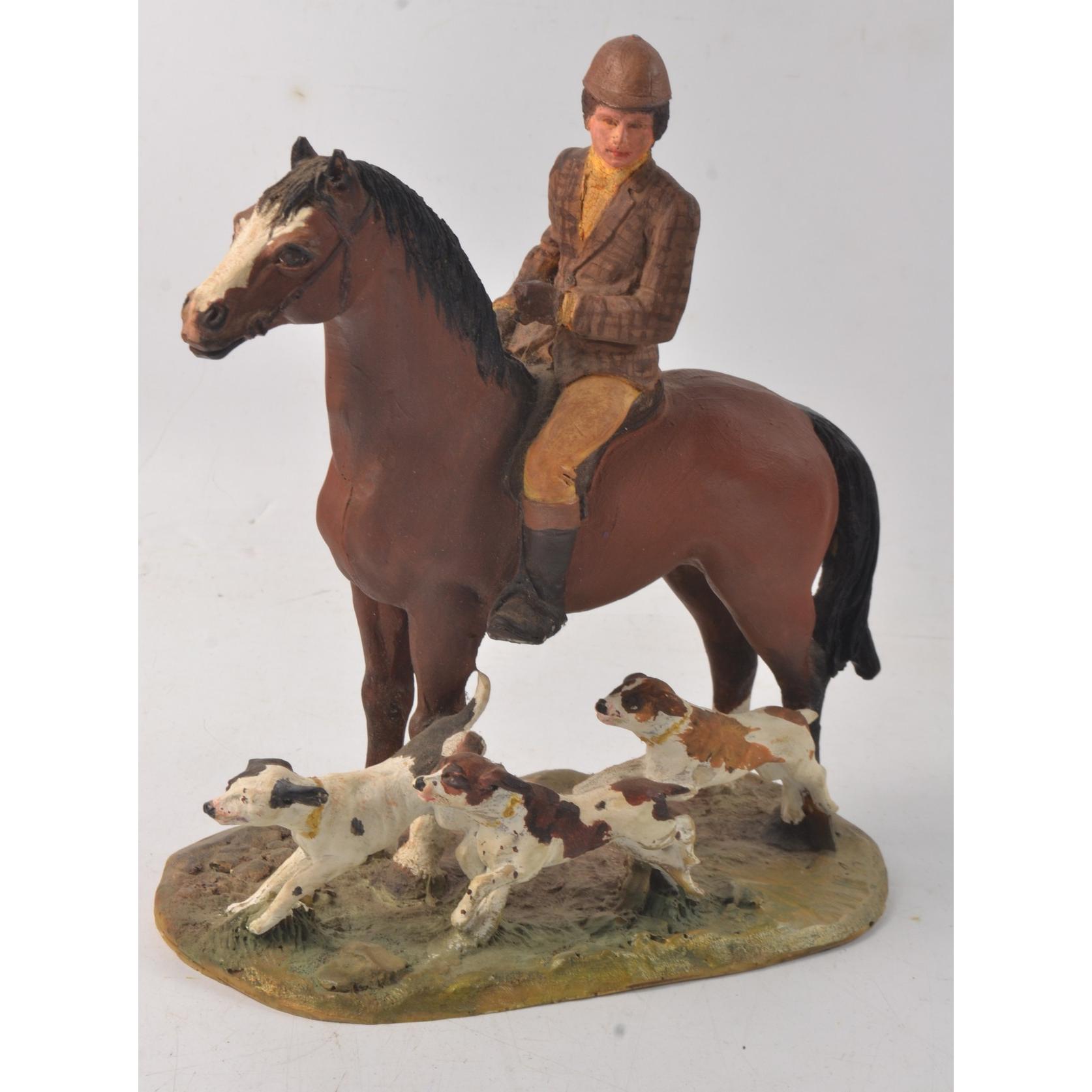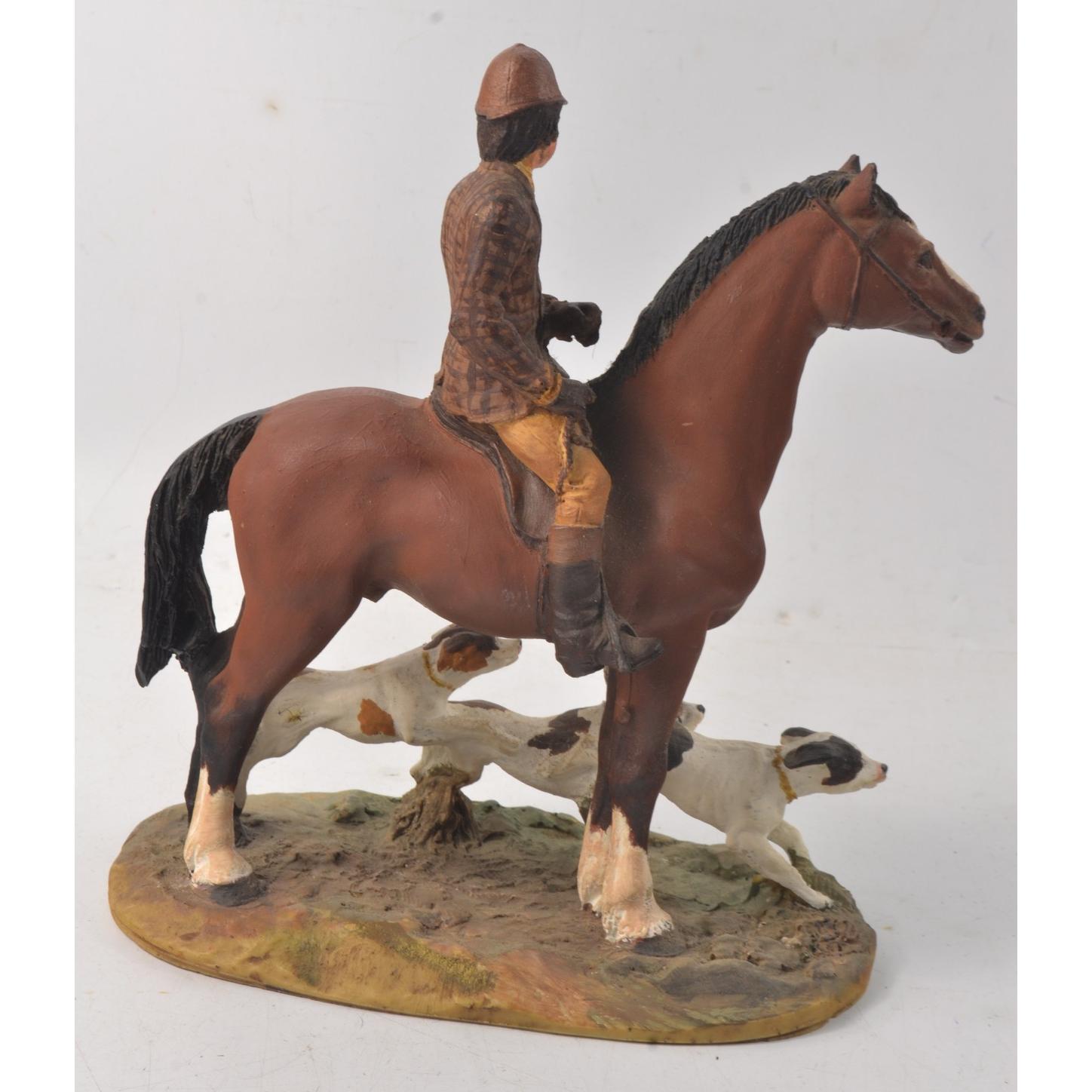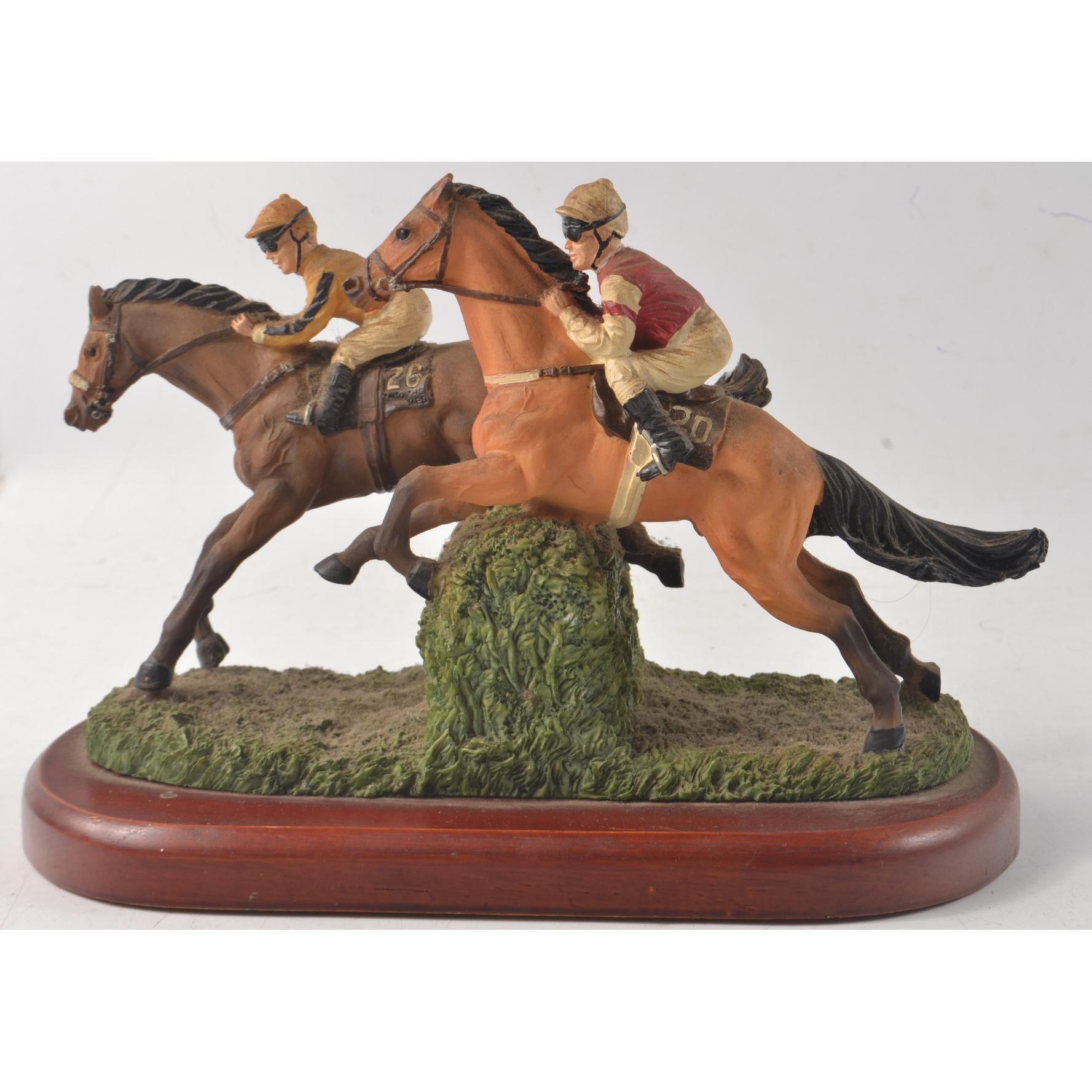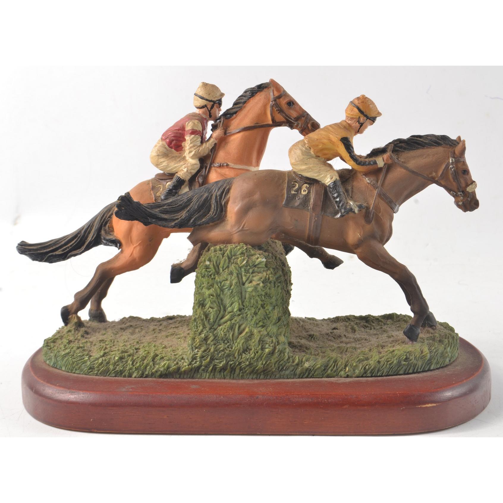 Two horse themed figurines, no names on bases, one a hunting scene, the other a horse racing theme, the tallest one 21cm x 18cm lengthApprox 2 pieces
