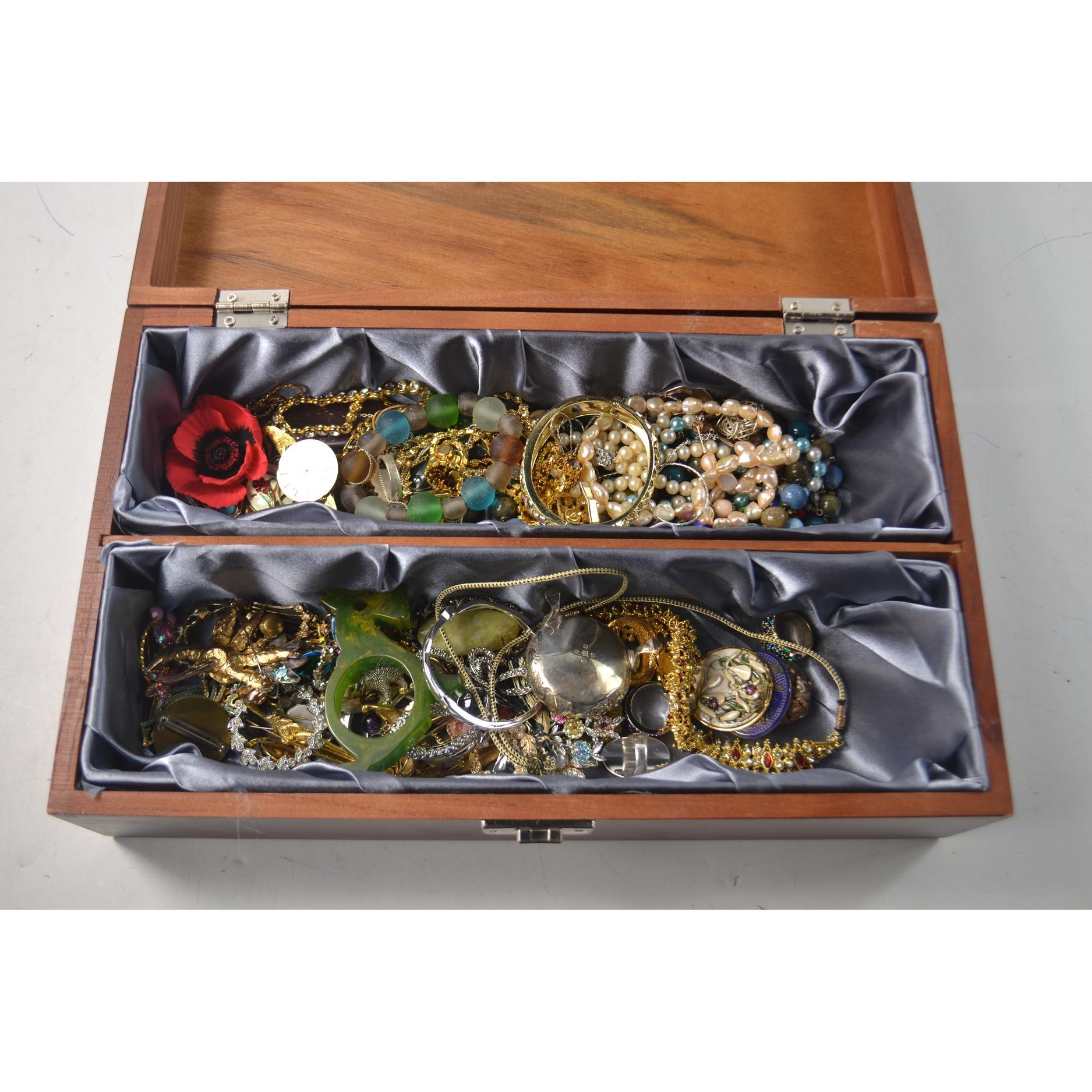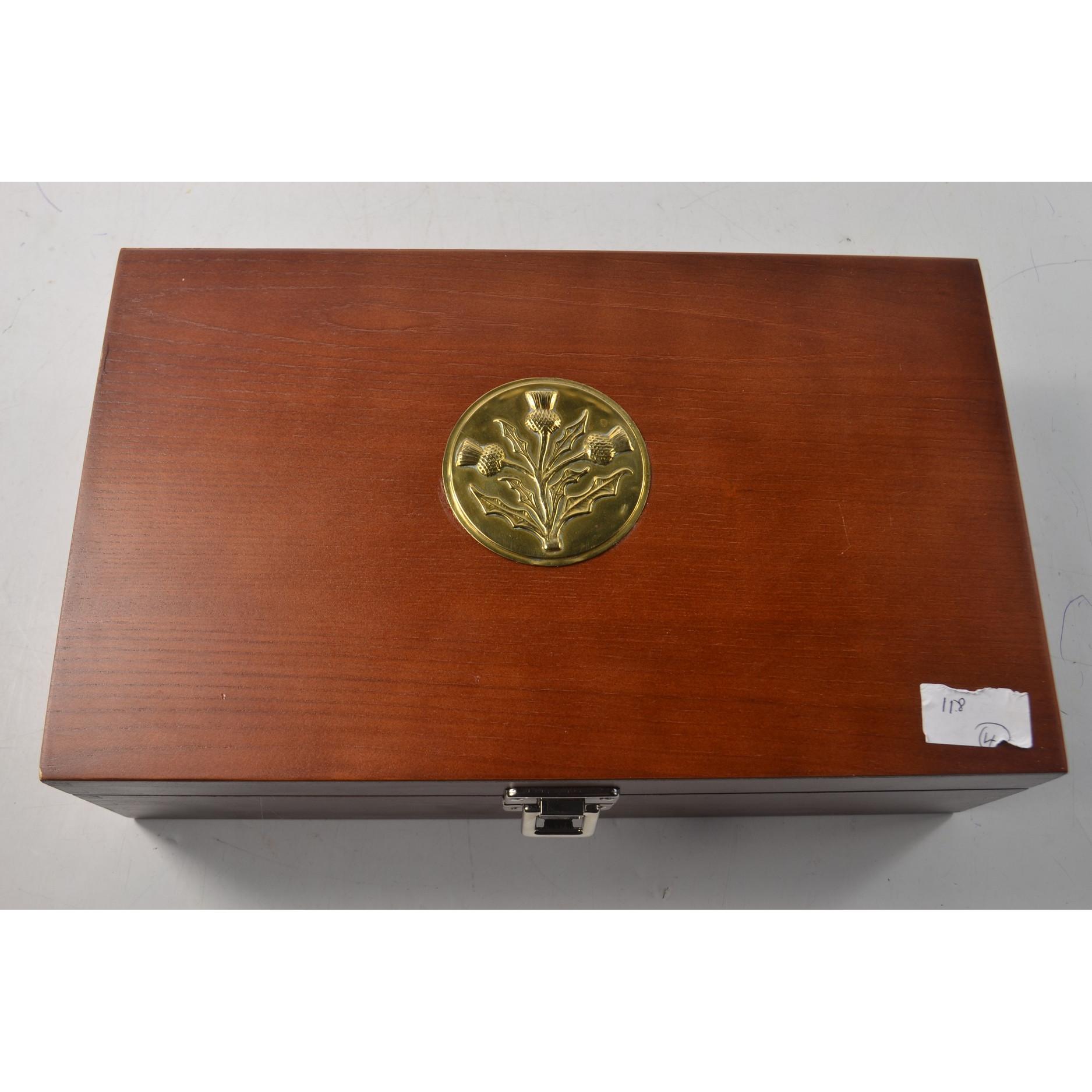 Large wooden box FILLED with Thistle motif on top, containg a quantity of costume jewelery ie, brooches, and strings of beads etcL: 35cn approx W: 21.5cm approx H: 10cm approx