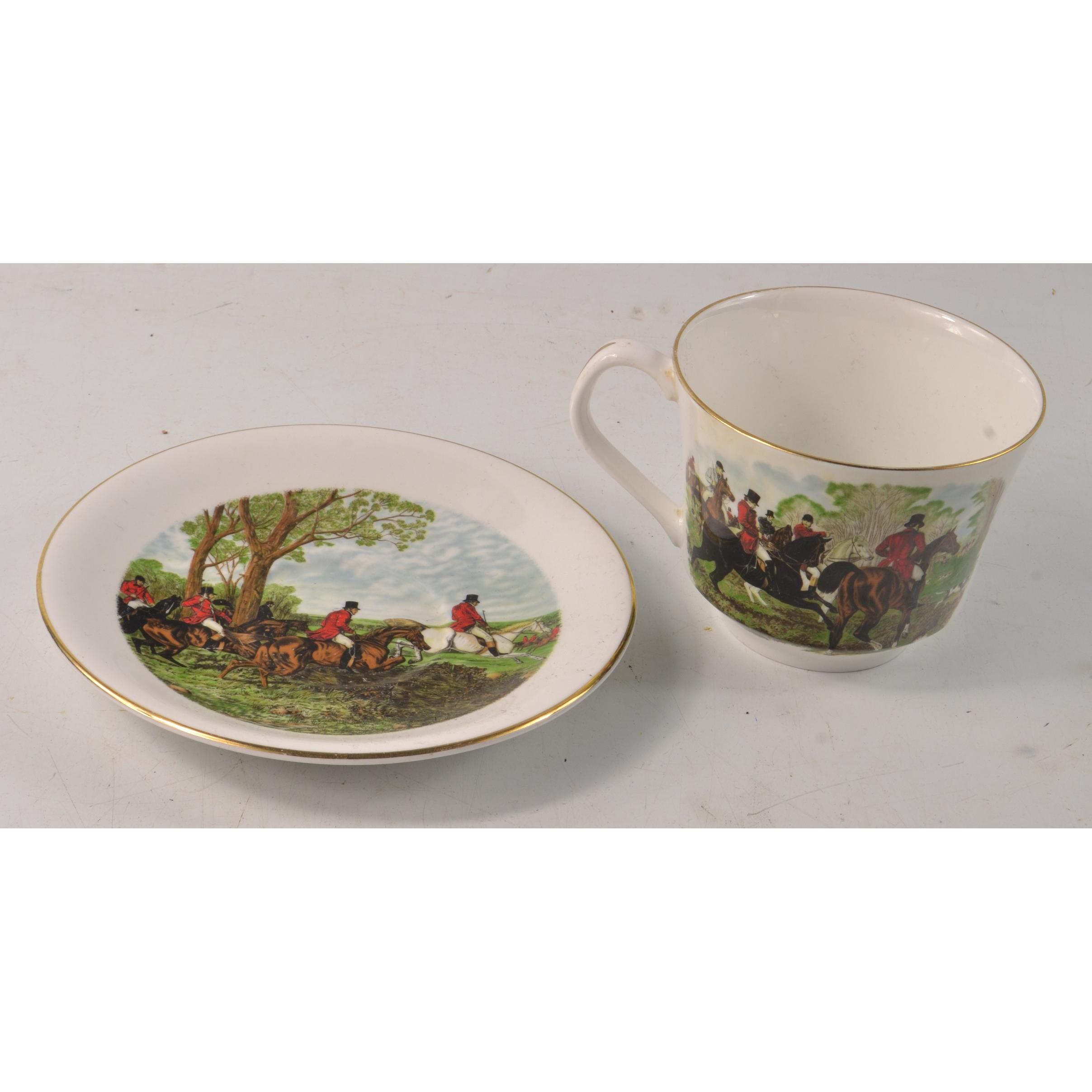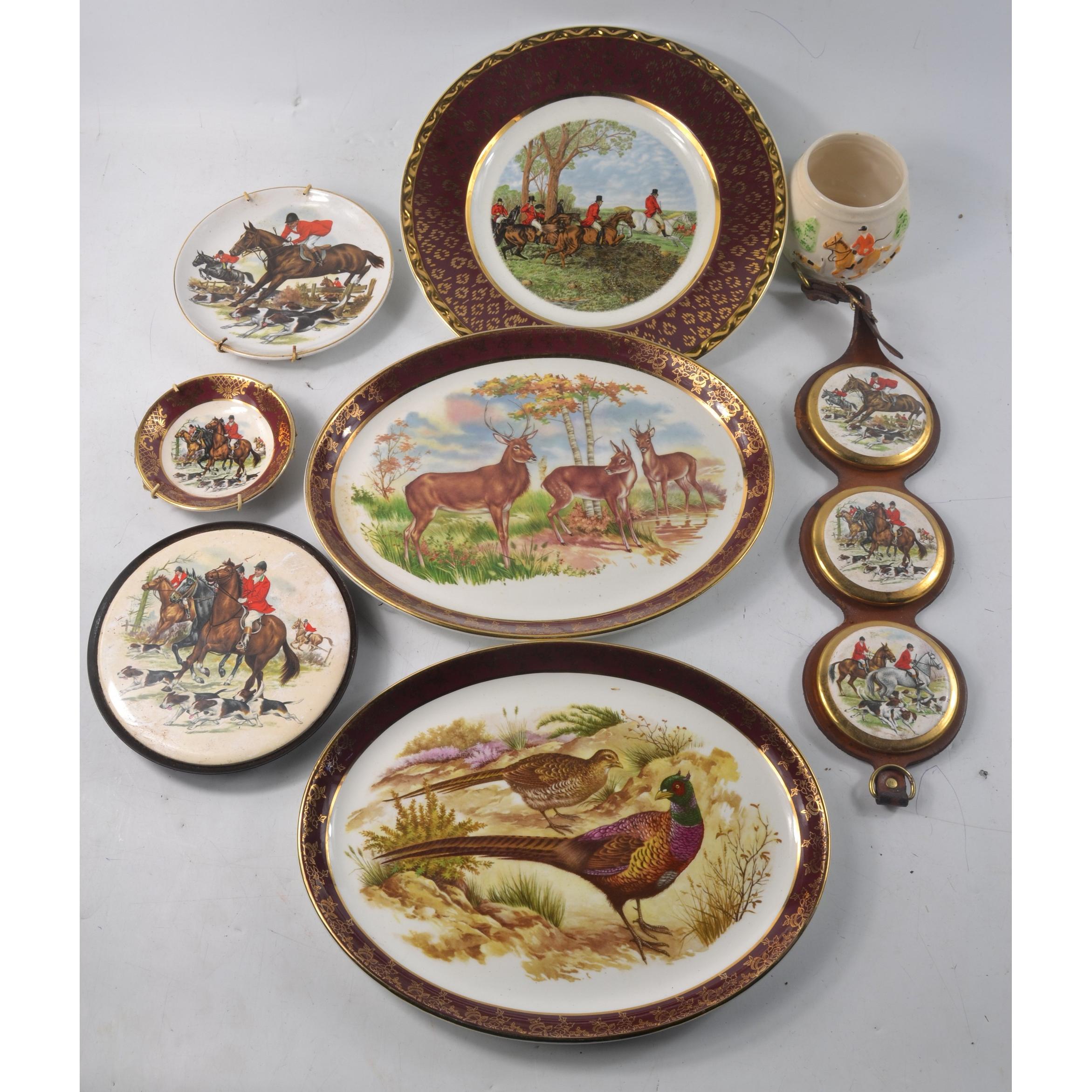 A HUNTING THEME LOT! to include ceramic plates and a nice ELIZABETHEAN cup and saucer with two nice oval plates by WEATHERBY ROYAL FALCON etc