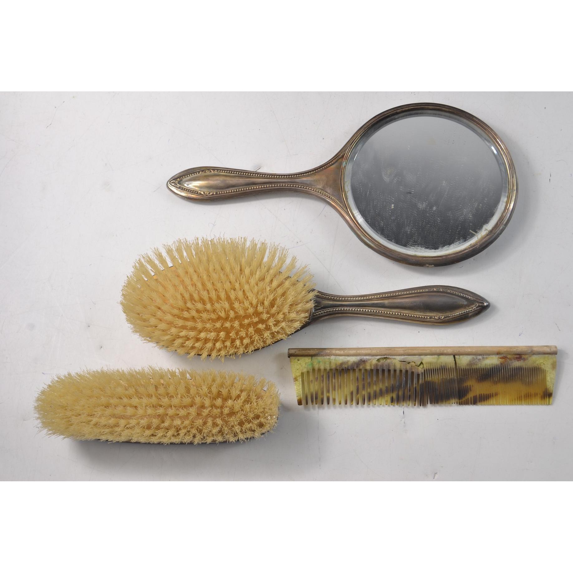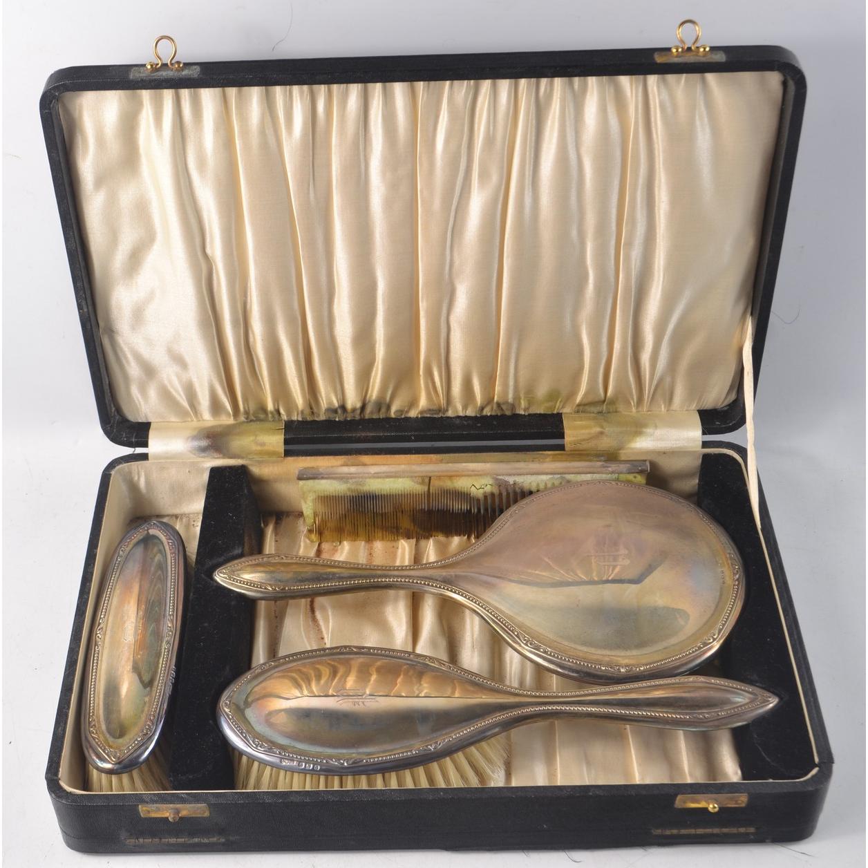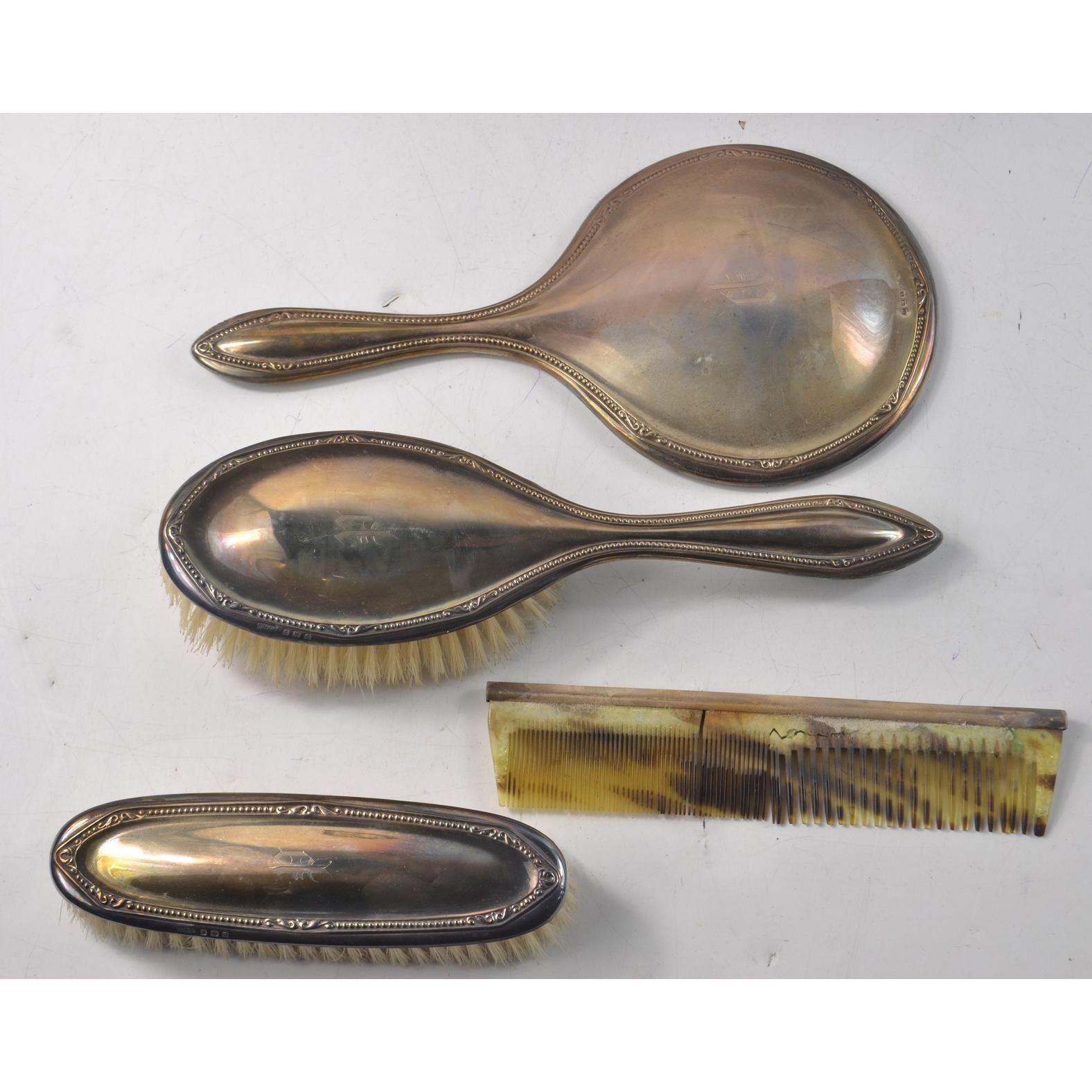 VINTAGE BIRMINGHAM Hallmarked 1938 silver ladies dressing table set with a fragile TORTOISESHELL comb 594g gross still within original Jewellers presentation caseGross weight approx 594g