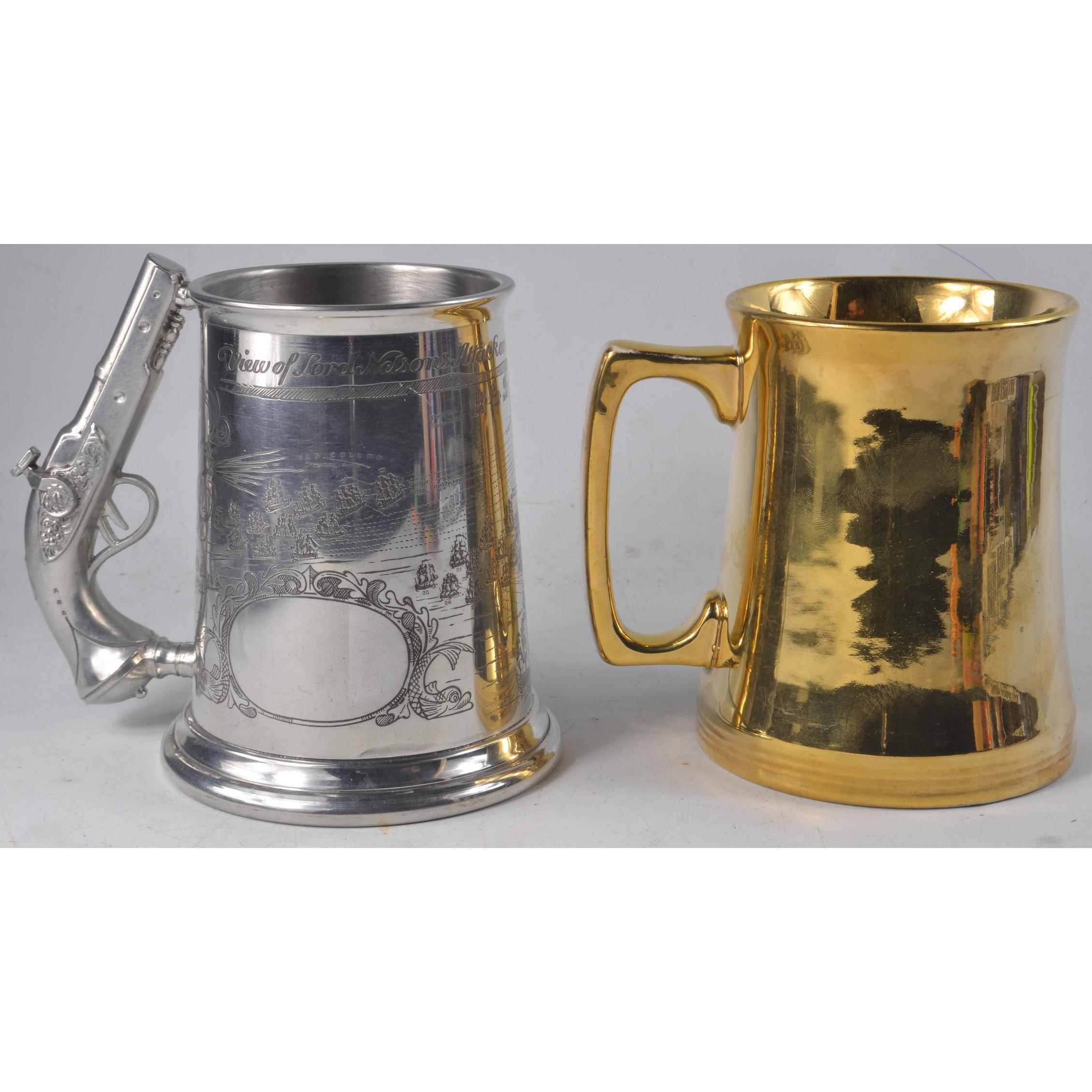 Two interesting TANKARDS, one a golden paint finish ROYAL WINTON 12cm High x 8.5 diameter And the other a Sheffield made Commemorative View Of The Attack Of The Fleet Of Lord Nelson Of Trafalgar 1805 12.5cm height x 8 cm diameter approx