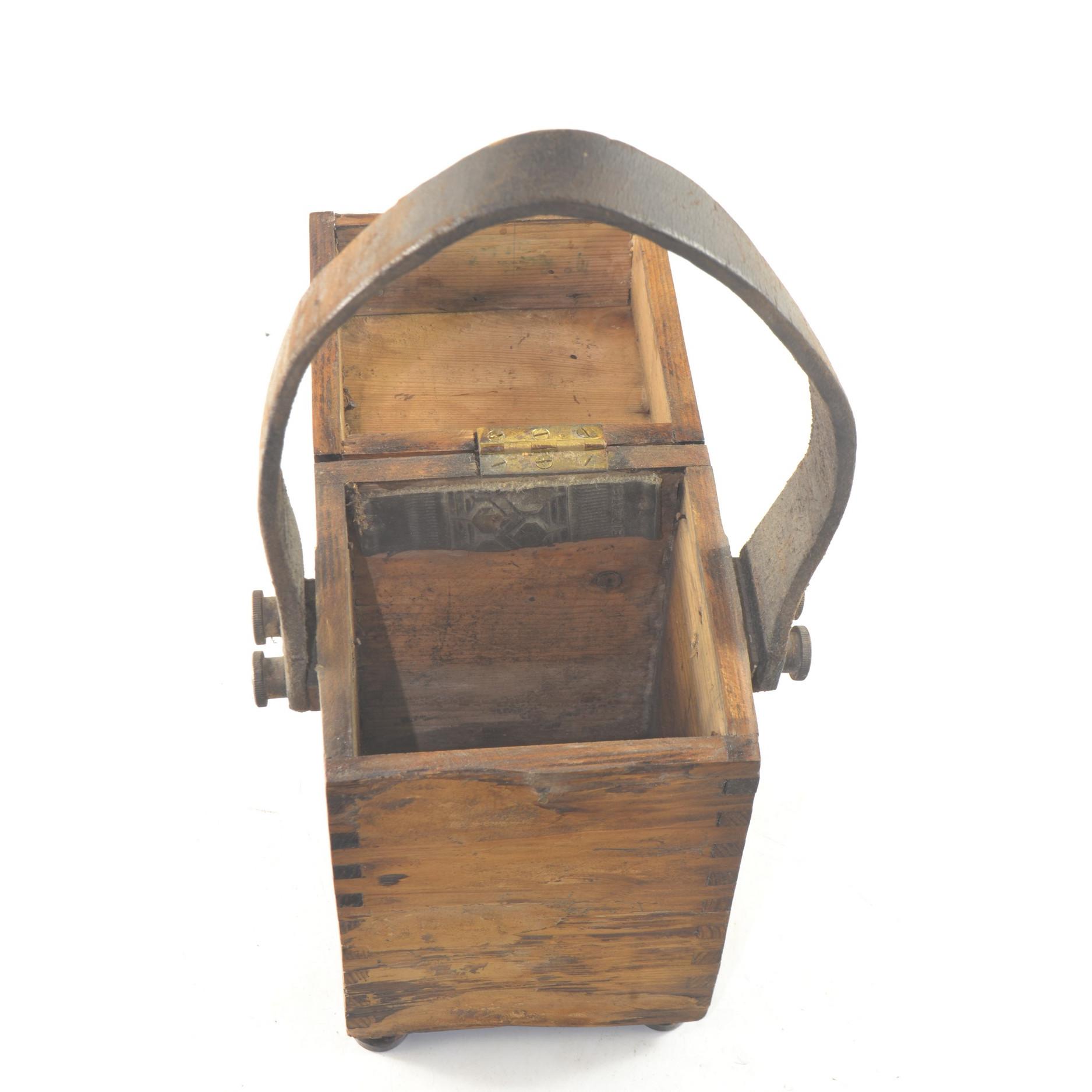 A small vintage wooden carry box with leather handle