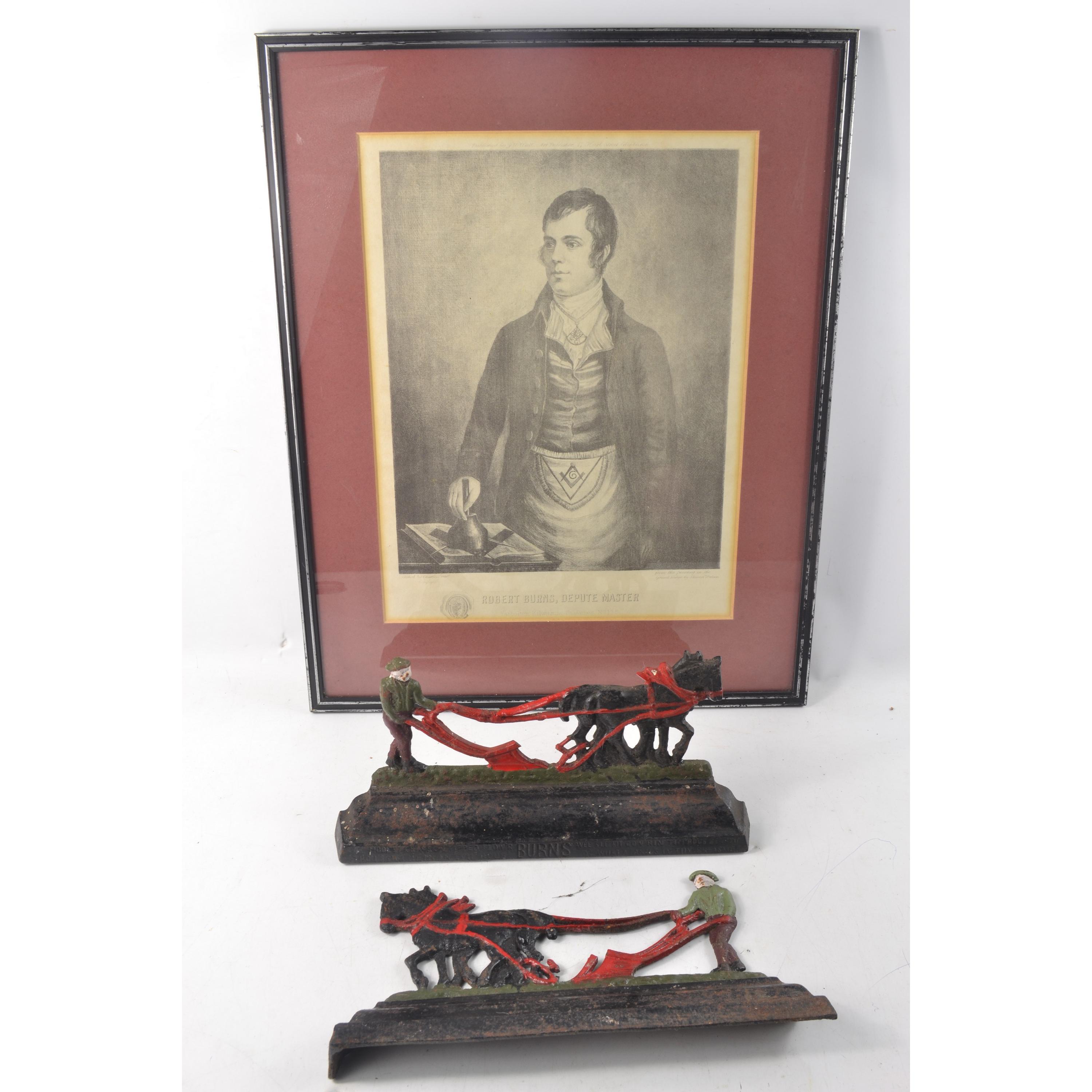 A pair of Antique ROBERT BURNS ploughman’s cast iron door stops and a framed vintage engraving of BURNS as Depute MASTER OF FREEMASONSApprox 3 pieces