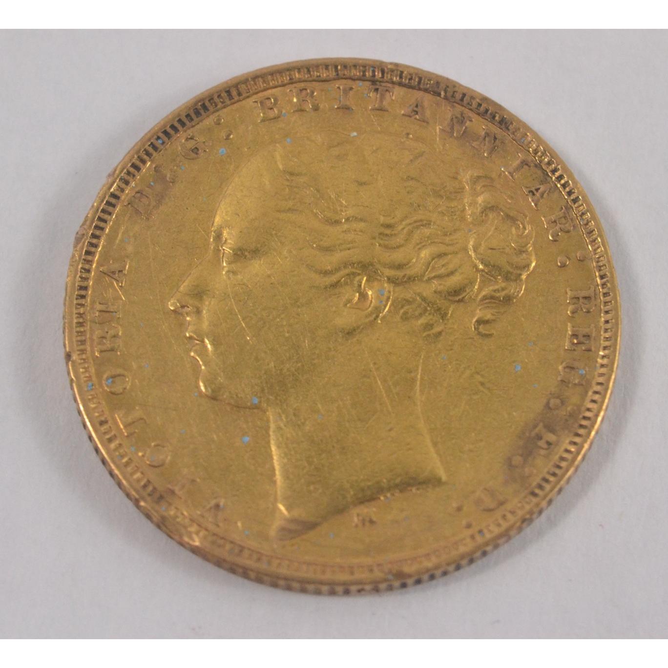 A Queen Victoria Gold Sovereign from 1879 with the Young Head design by William Wyon. The reverse features the traditional George and Dragon design. The M mintmark denotes the Melbourne Mint in Australia. 7.98grms
