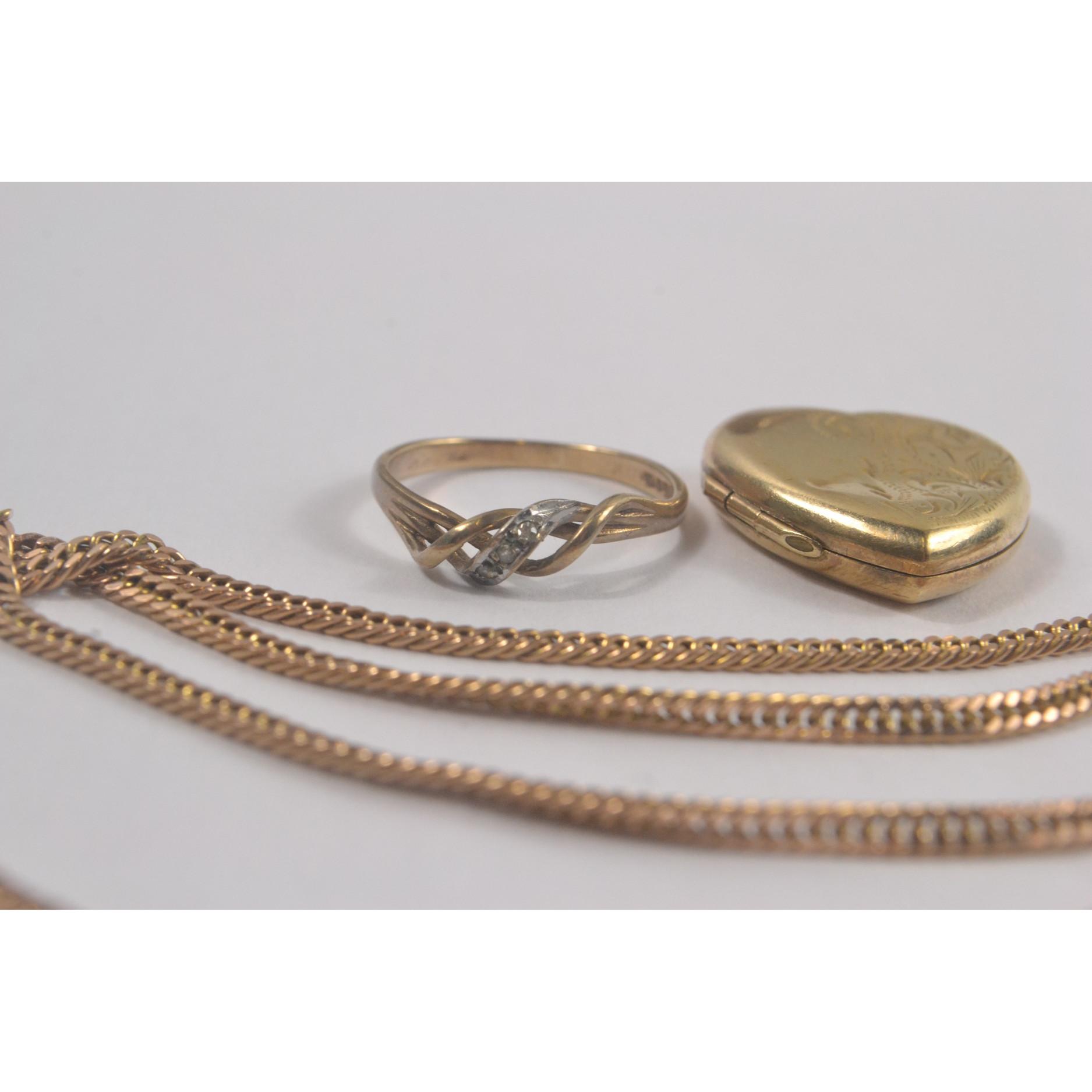 9ct Stamped back and front heart shaped locket and 9ct stamped yellow gold chain [ L41cm ] and small 9ct ring [sizeL] Gross weight approx 10.5 grms