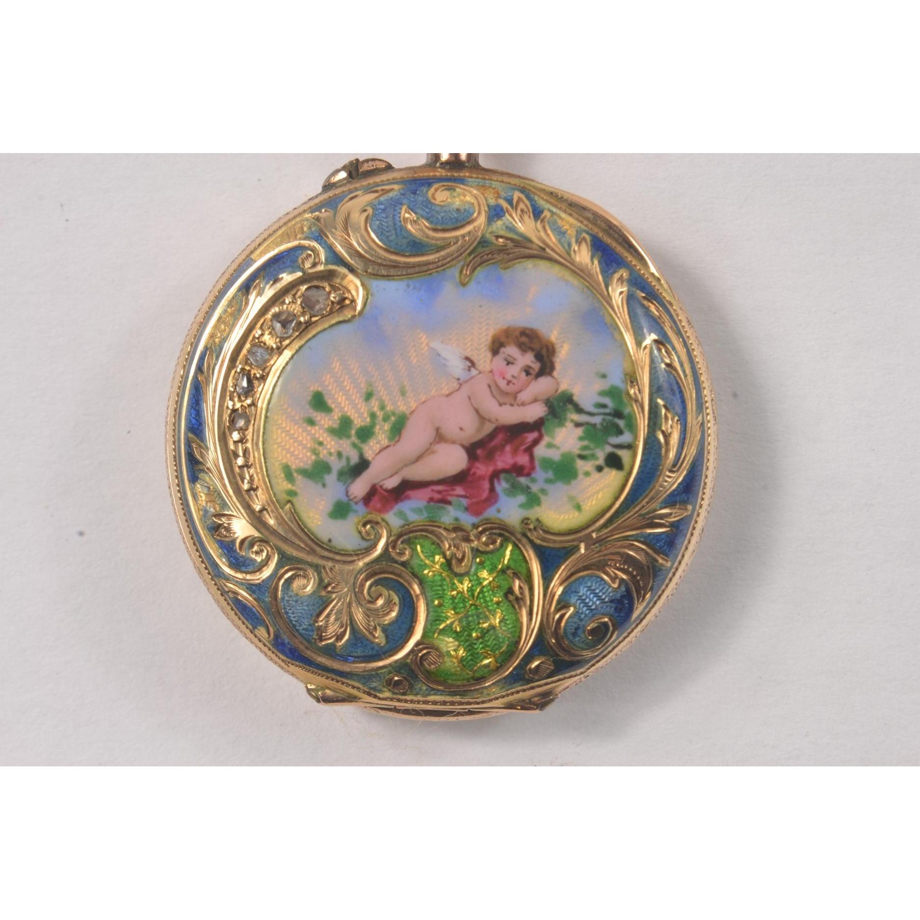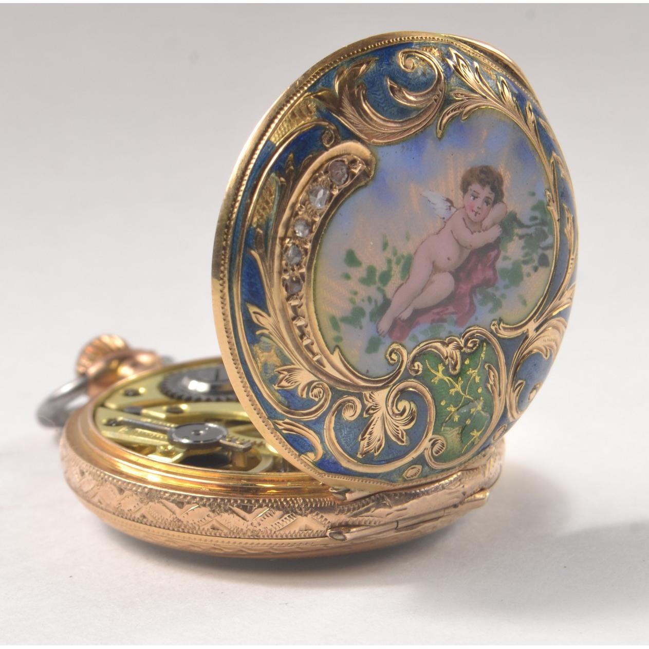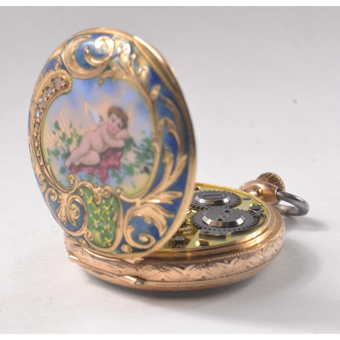 LOVELY! 585 Stamped enameled pocket watch [ 3cm ] the enamel depicting an Angel reclining, and set with FIVE very small old cut diamonds. [Slight damage/wear to outside enamel but none to main picture]