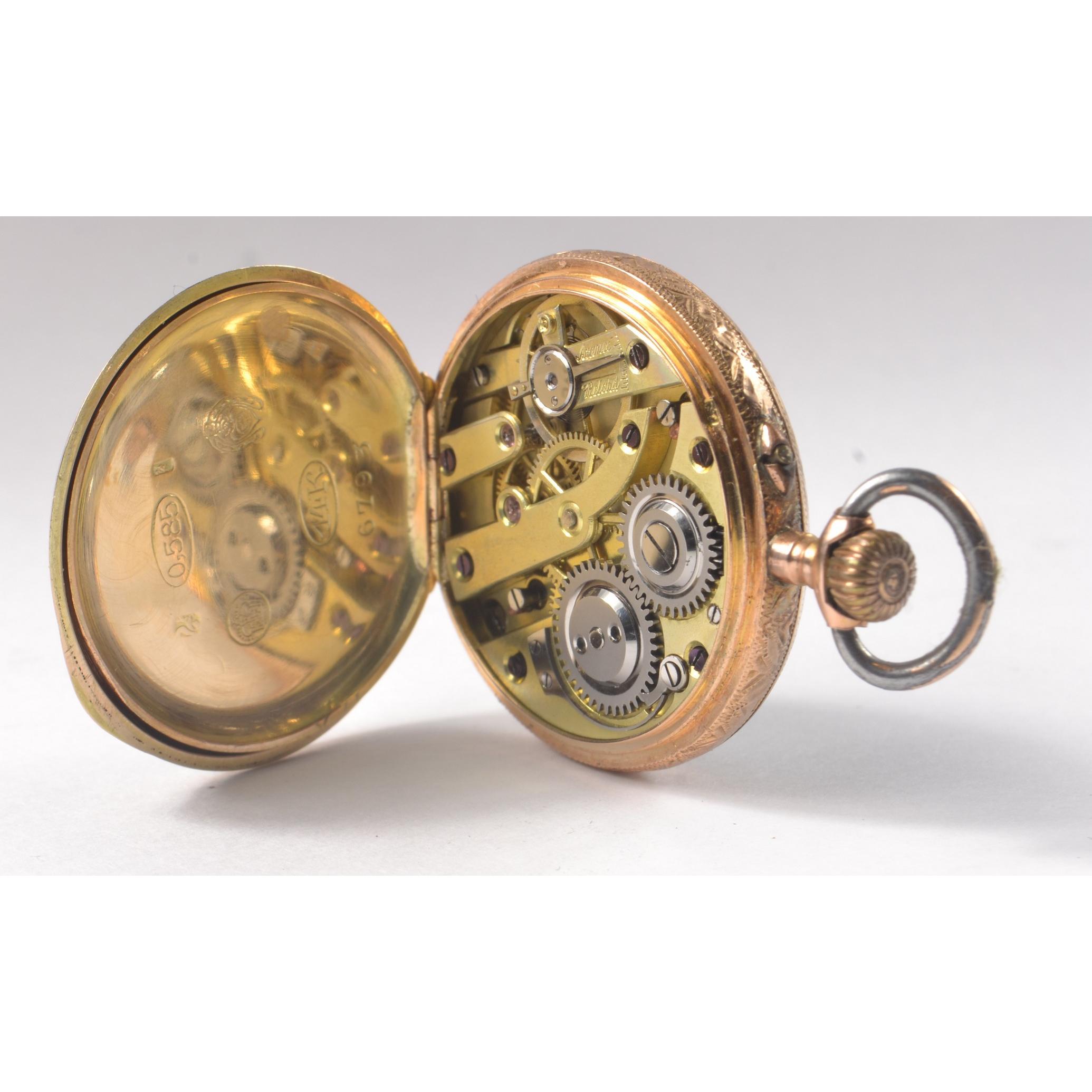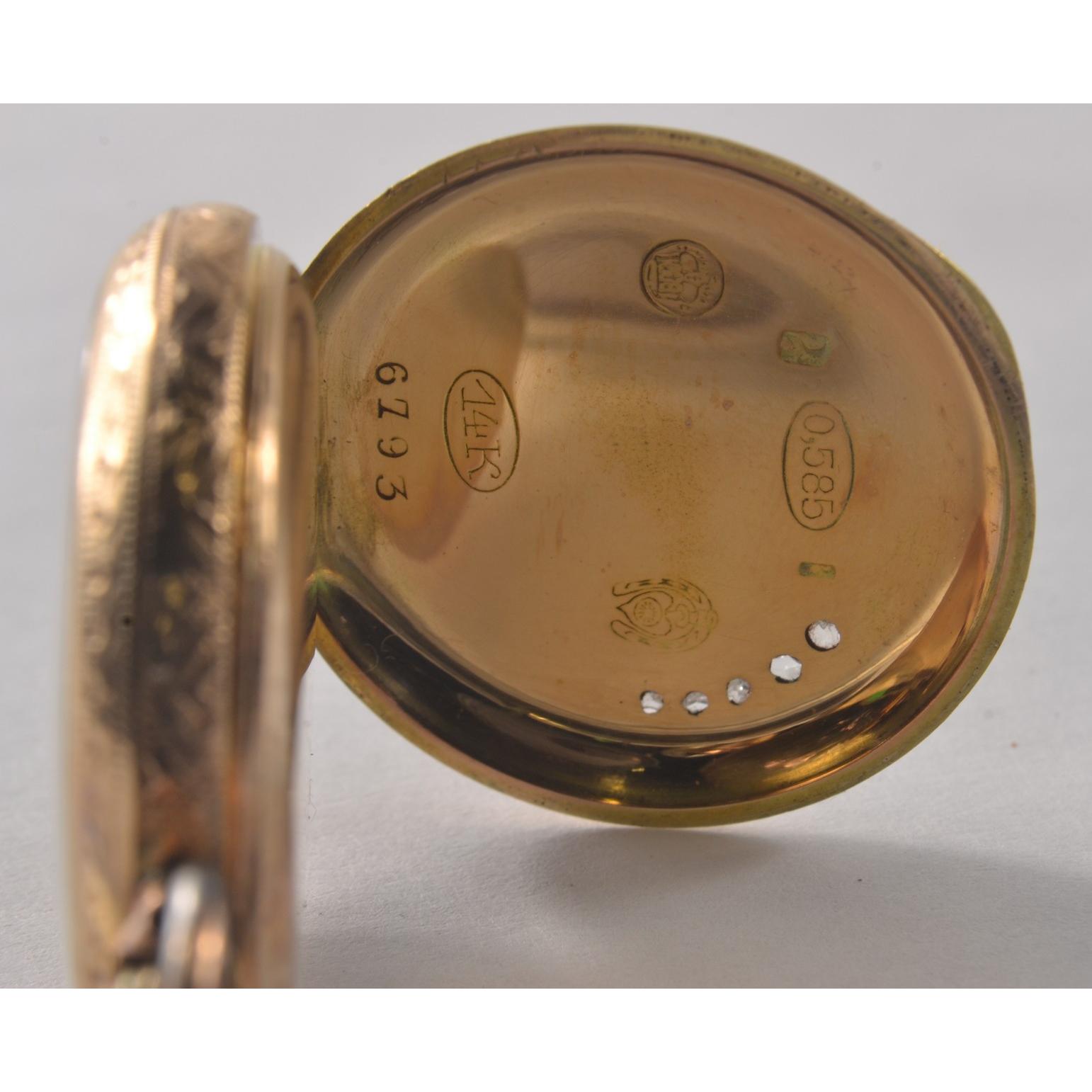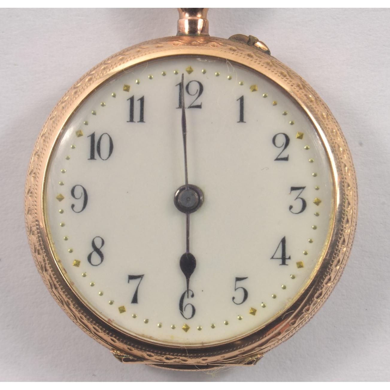 LOVELY! 585 Stamped enameled pocket watch [ 3cm ] the enamel depicting an Angel reclining, and set with FIVE very small old cut diamonds. [Slight damage/wear to outside enamel but none to main picture]