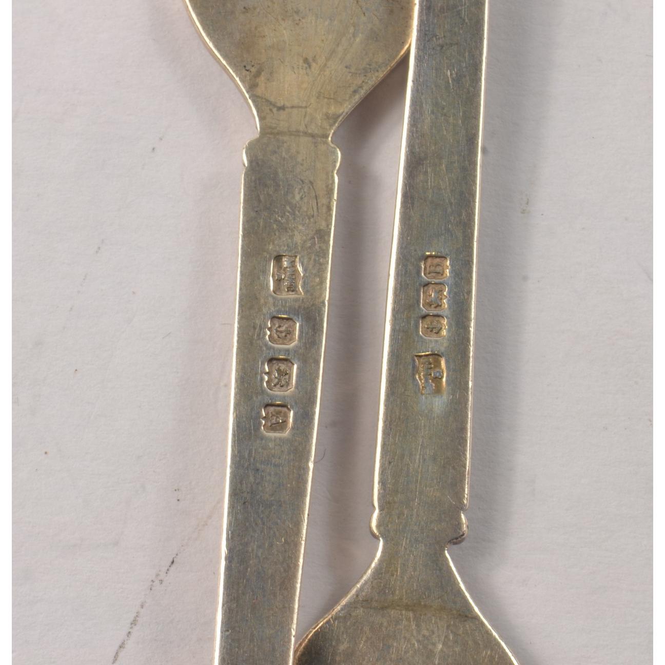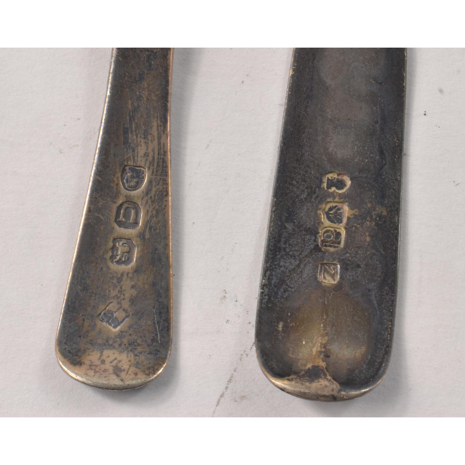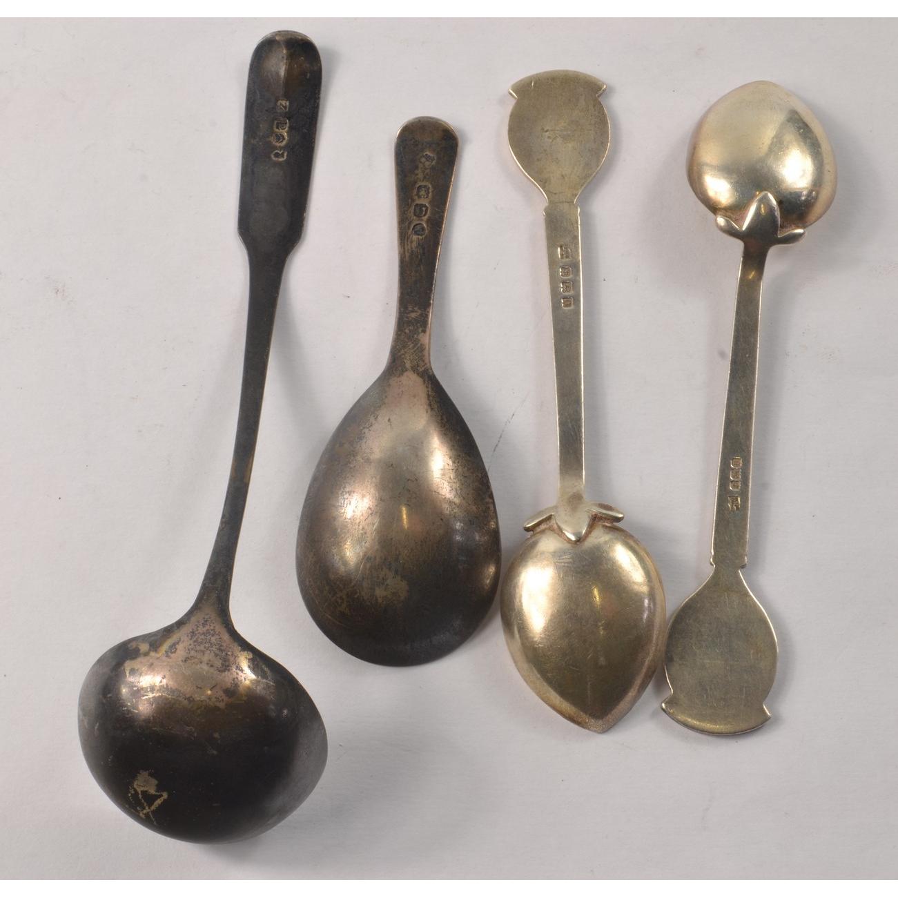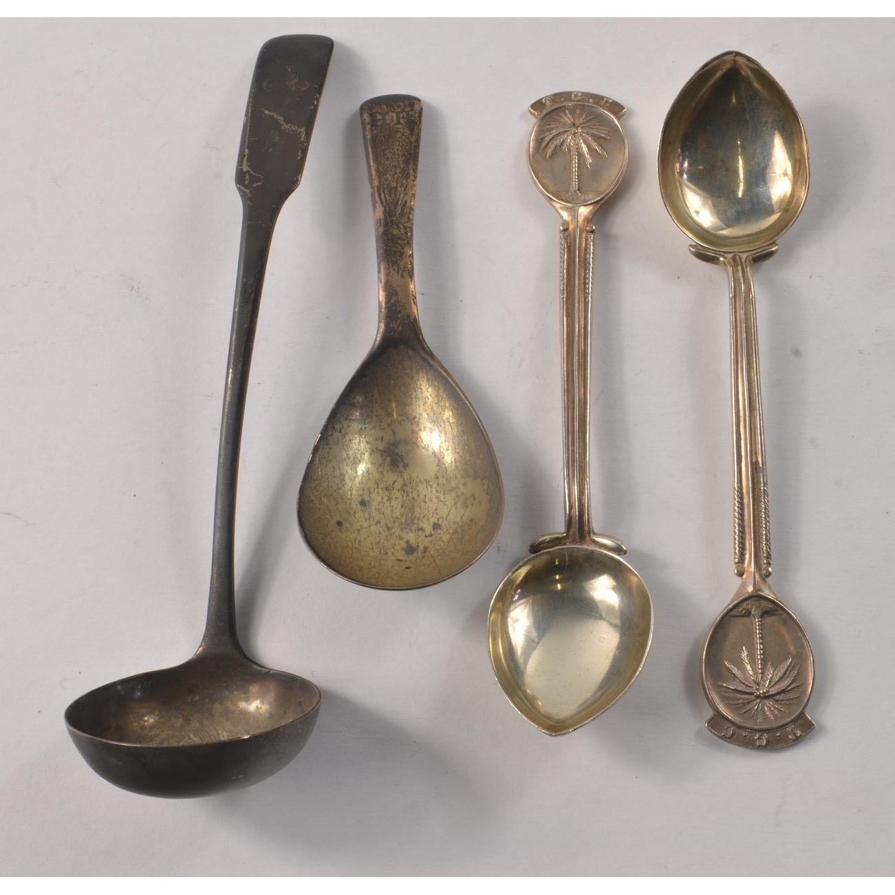 A small white metal vintage THISTLE marked ladle 21g, a small short handled silver spoon with HH engraved on the handle, 12.5g approx, two Hallmarked Birmingham silver jam spoons 1925 and 1926 stamped with a nice palm tree motif with letters T G C 42.5g for both