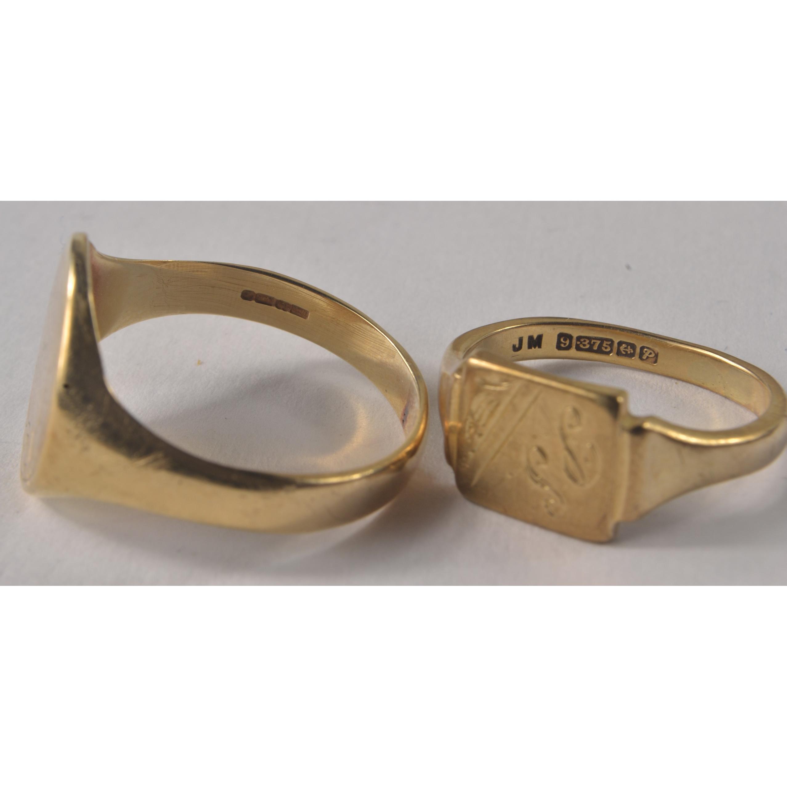 Two 375 stamped yellow gold signet rings, larger ring size V, smaller size L total weight 8.02gApprox 2 pieces
