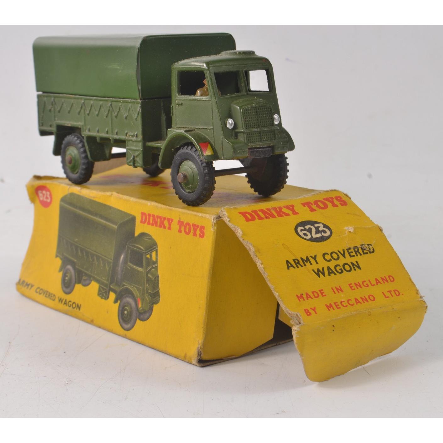 DINKY TOYS ORIGINAL ARMY COVERED WAGON No 623 the box is almost intact but haslost the end flap and inner flap of the box over the years, the Army Covered wagon only has minor small dent on one side, paint work is very good with no known chips noted, but otherwise very well looked after and cherished by the vendor as a child from Edinburgh.