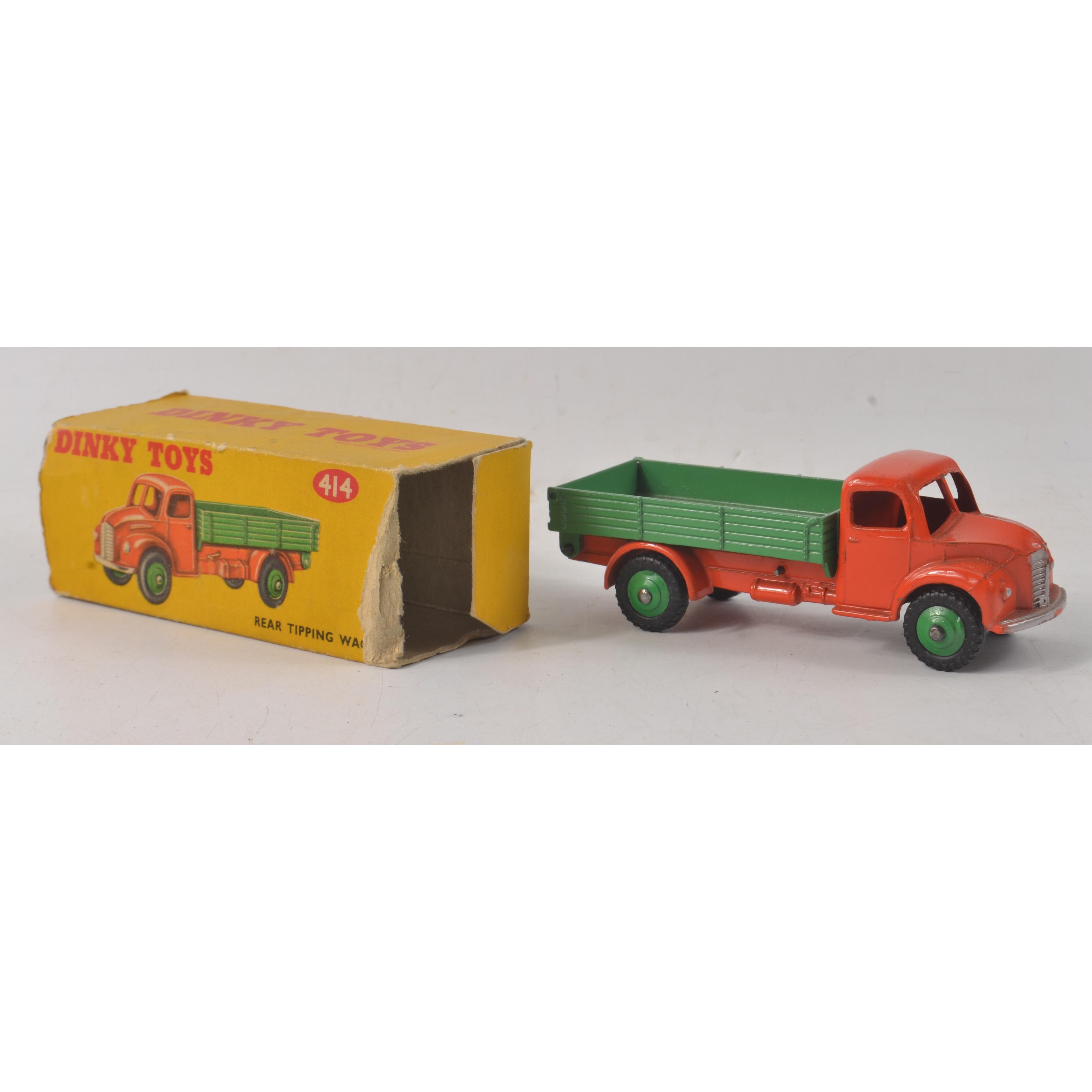 DINKY TOYS ORIGINAL BOXED REAR TIPPING WAGON 414 orange and green in minor play-worn condition, paint work is good with only a few tiny chips noted, but otherwise very well looked after and cherished by the vendor as a child from Edinburgh.