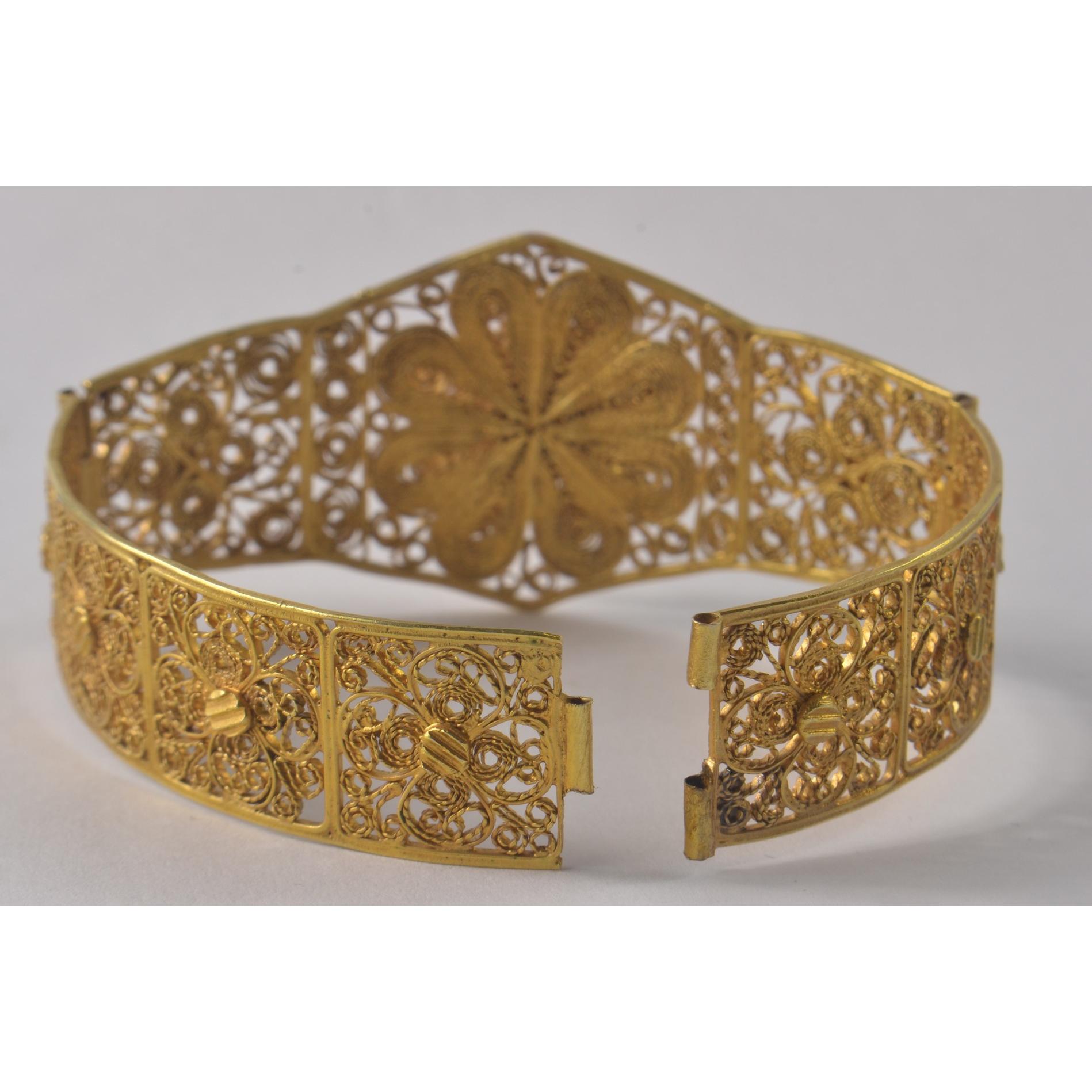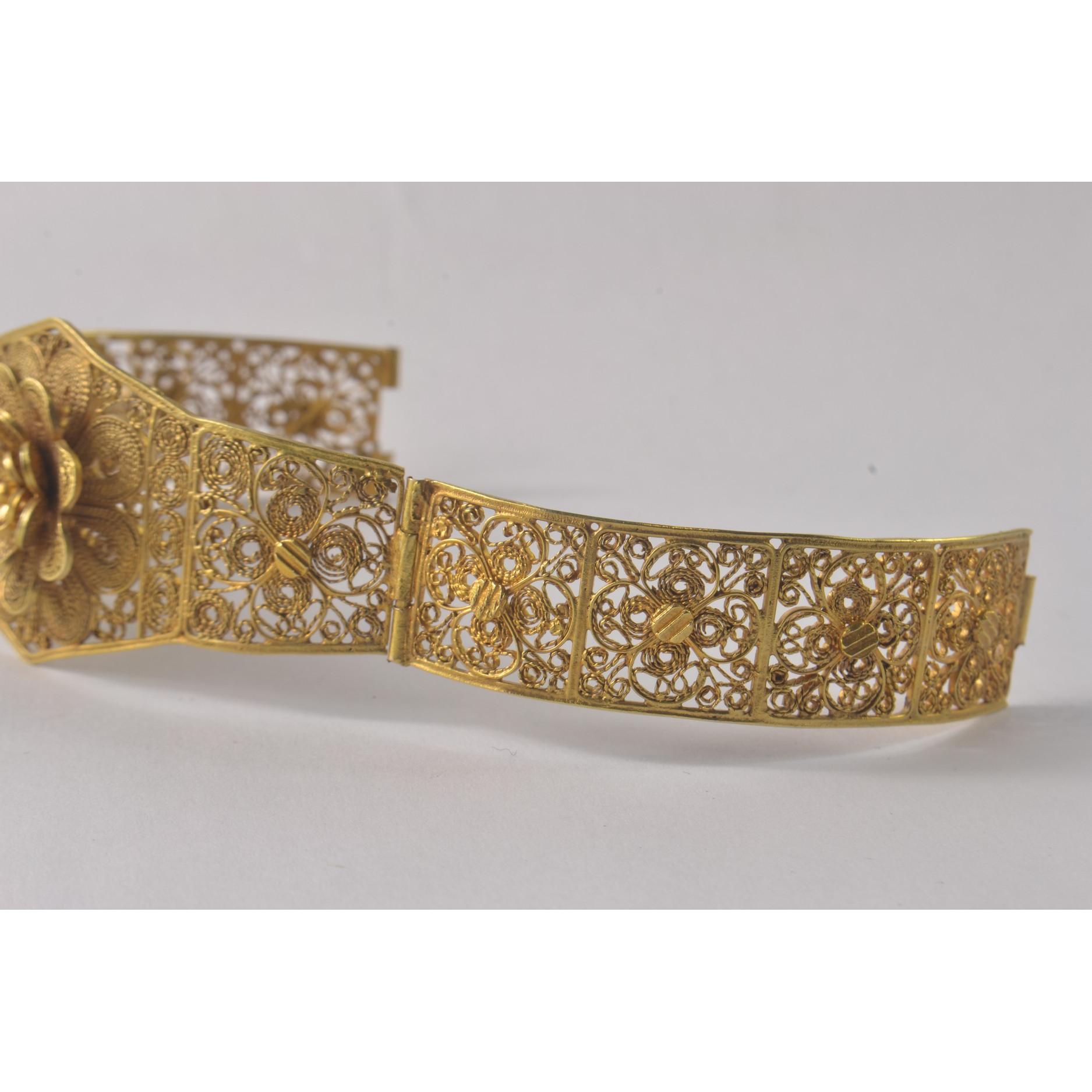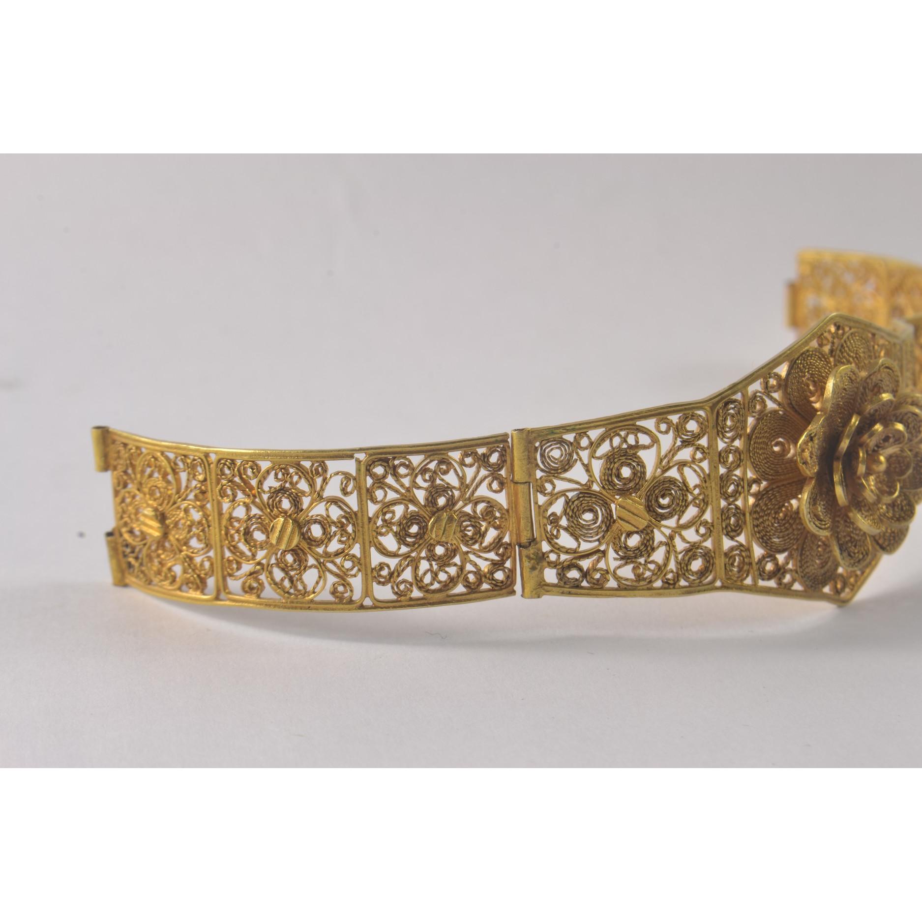 TRULY MAGNIFICIENT CRAFTMANSHIP! A Venezuelan14ct Tested Yellow Gold Filigree design triple bracelet with a central decorative flower form [L 15cm ]Gross weight approx 19.80 grms