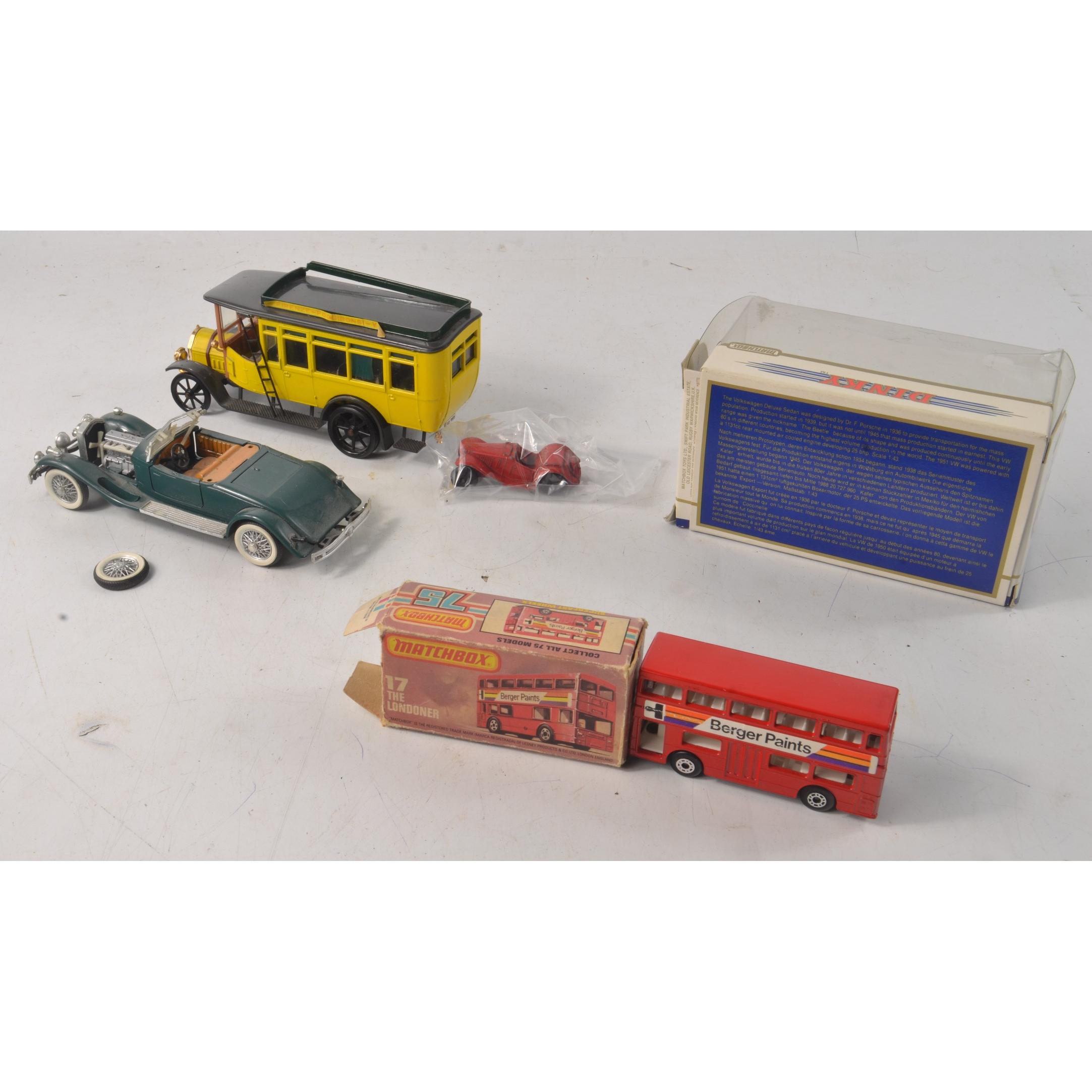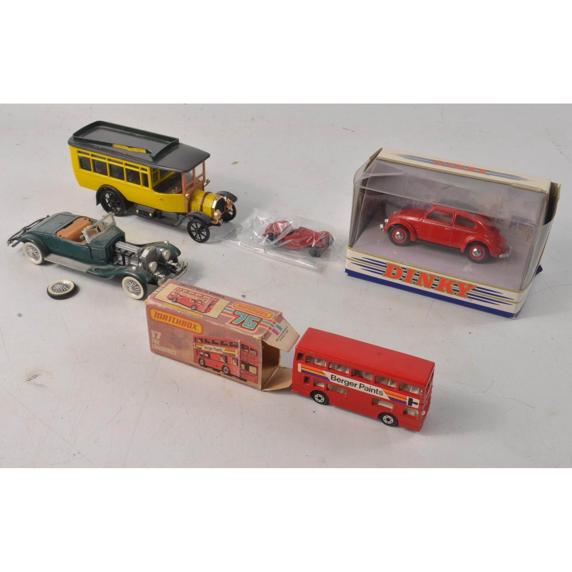 DINKY Volkswagen 1951 BEETLE in red still in original packaging, unused item, A MATCHBOX THE LONDONER 17 Double Decker Bus in original box with end flap missing, otherwise intact, A RIO branded FIAT OMNIBUS unboxed, A RIO ROLLS ROYCE 1931 with bits missing, and a tiny DINKY RM Model Kit 184475 in red