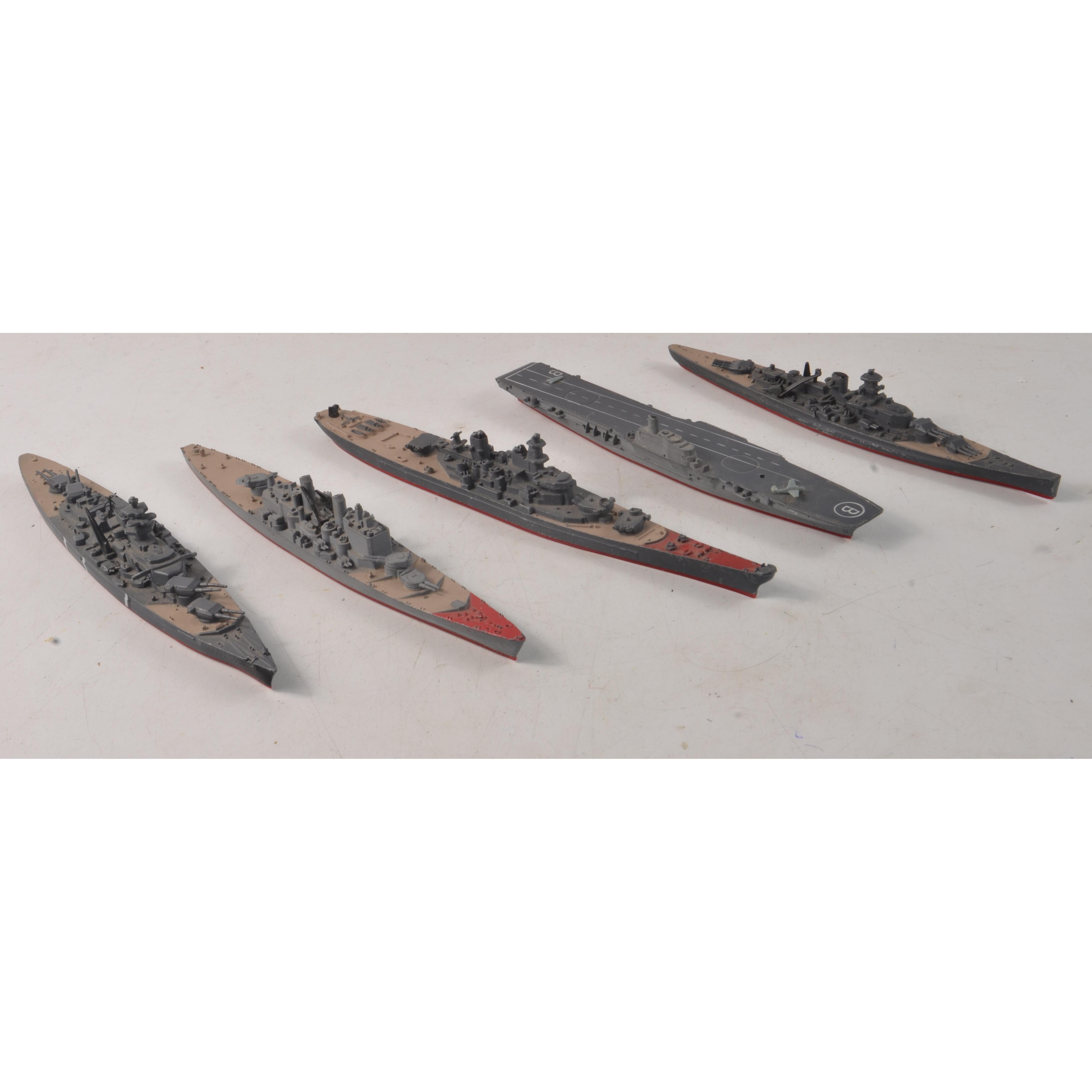 Five model die-cast ships to include The BISMARK M74, THE VANGUARD, The SCHARNHORST M745, THE MISSOURI M743 and HMS BULWARK M751 model ship air craft carrier, largest length 18.5cm Approx 5 pieces