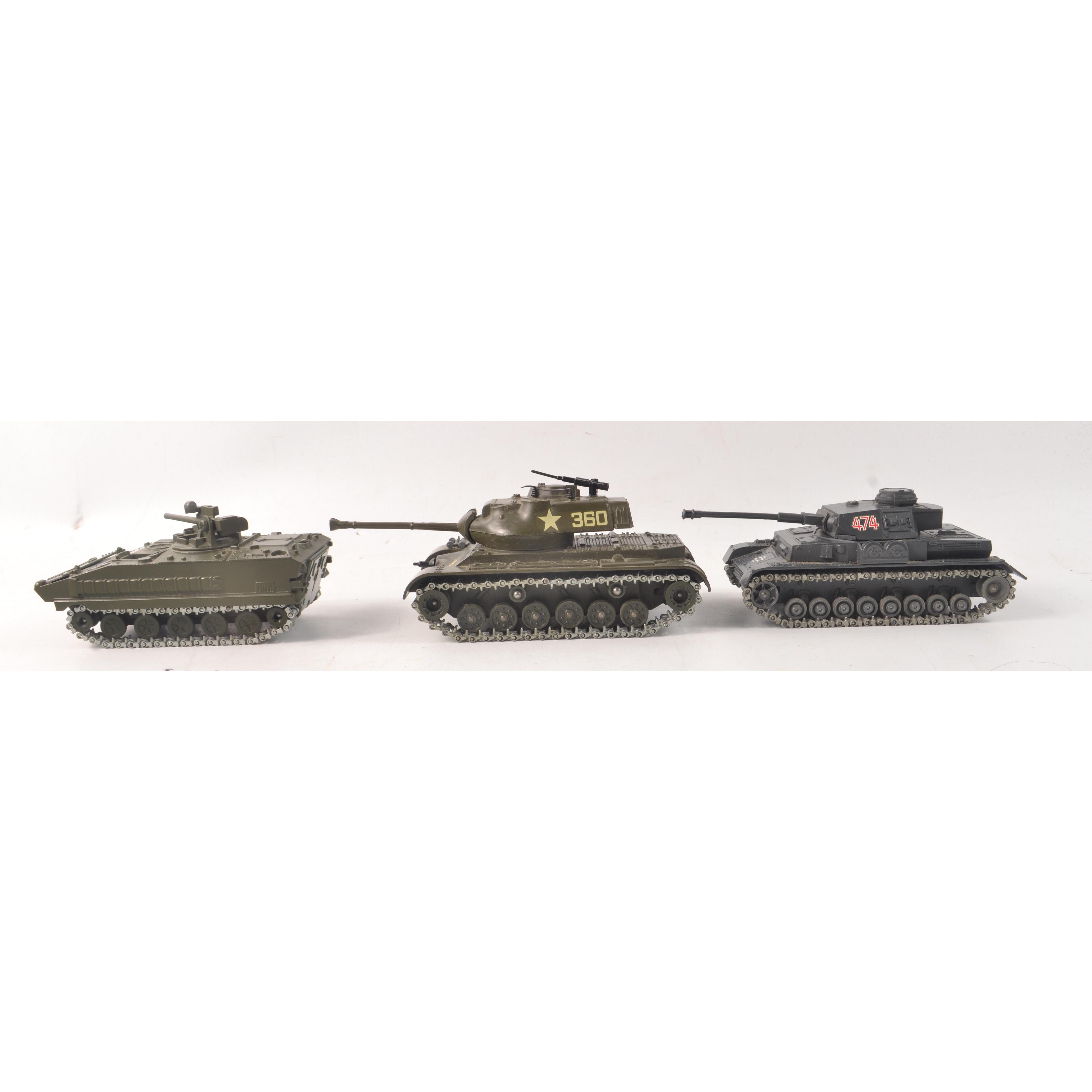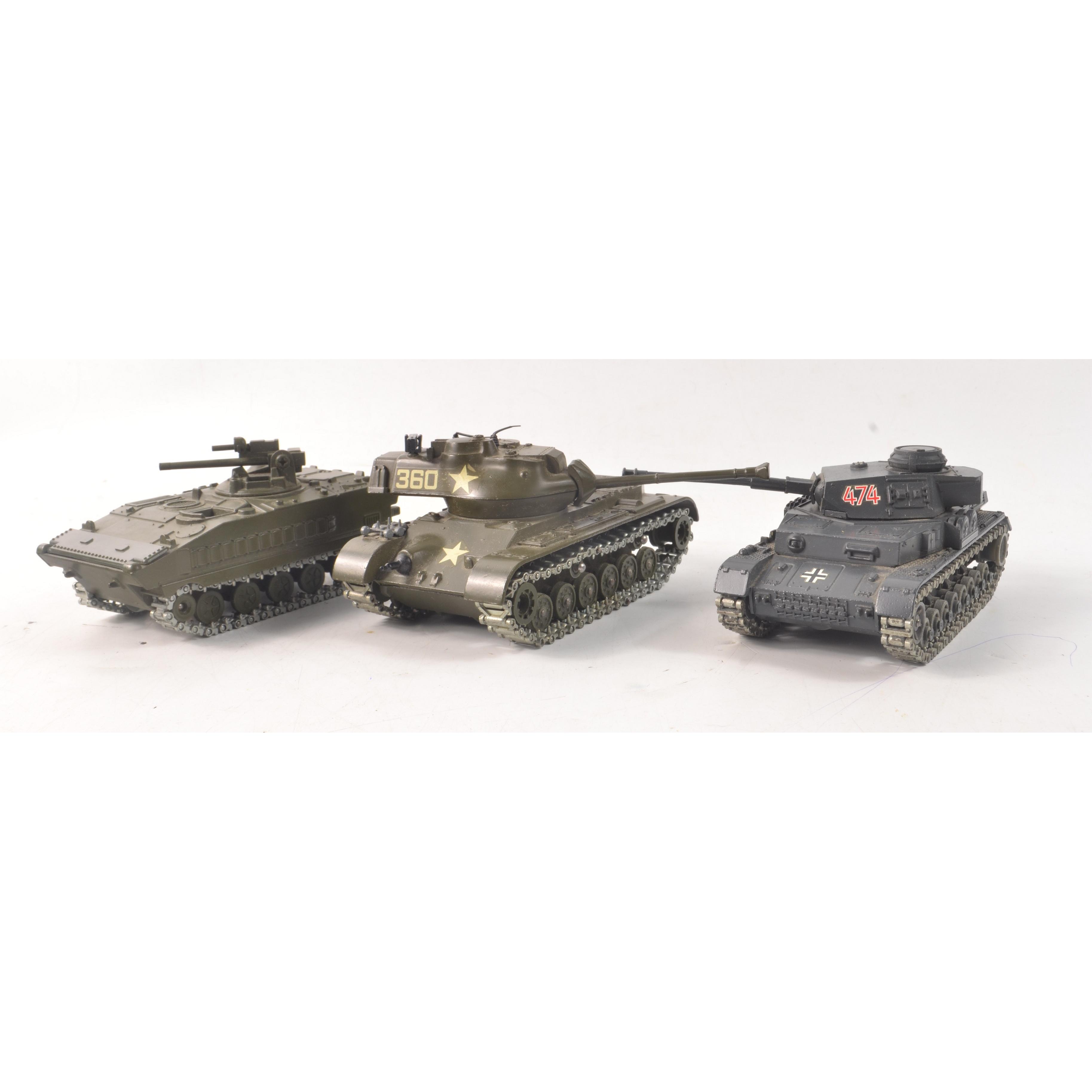 SOLIDO maker CHAR BLINDE GENERAL PATTON M-47 model tank with 360 and American star logo, also with a SOLIDO maker AMX 10 P No254, additional info the AMX-10P is a French amphibious infantry fighting vehicle, a piece appears to be missing from the top of the tank, a soldier head?, and lastly a SOLEDO PZ 1V No 237 German Tank 474 logo all tanks have tracks intact.