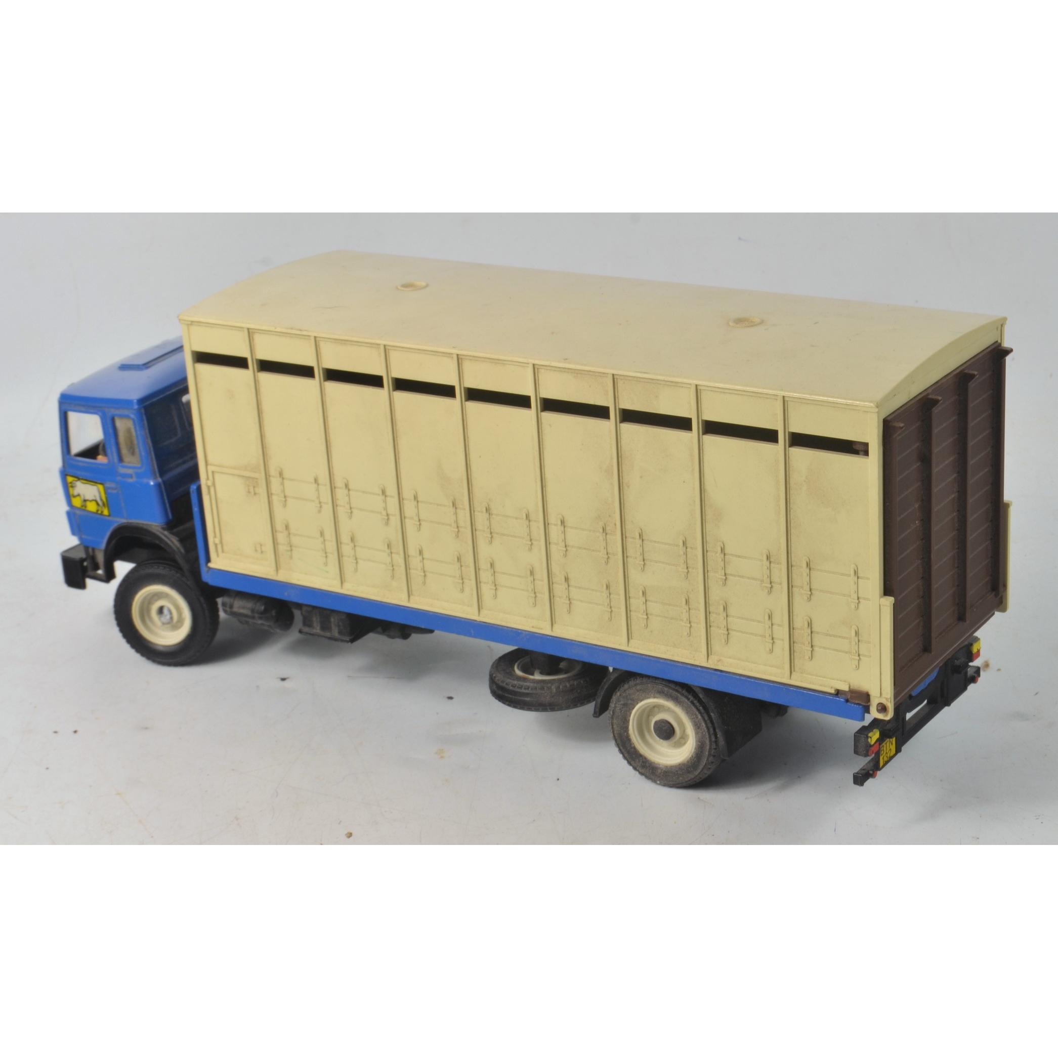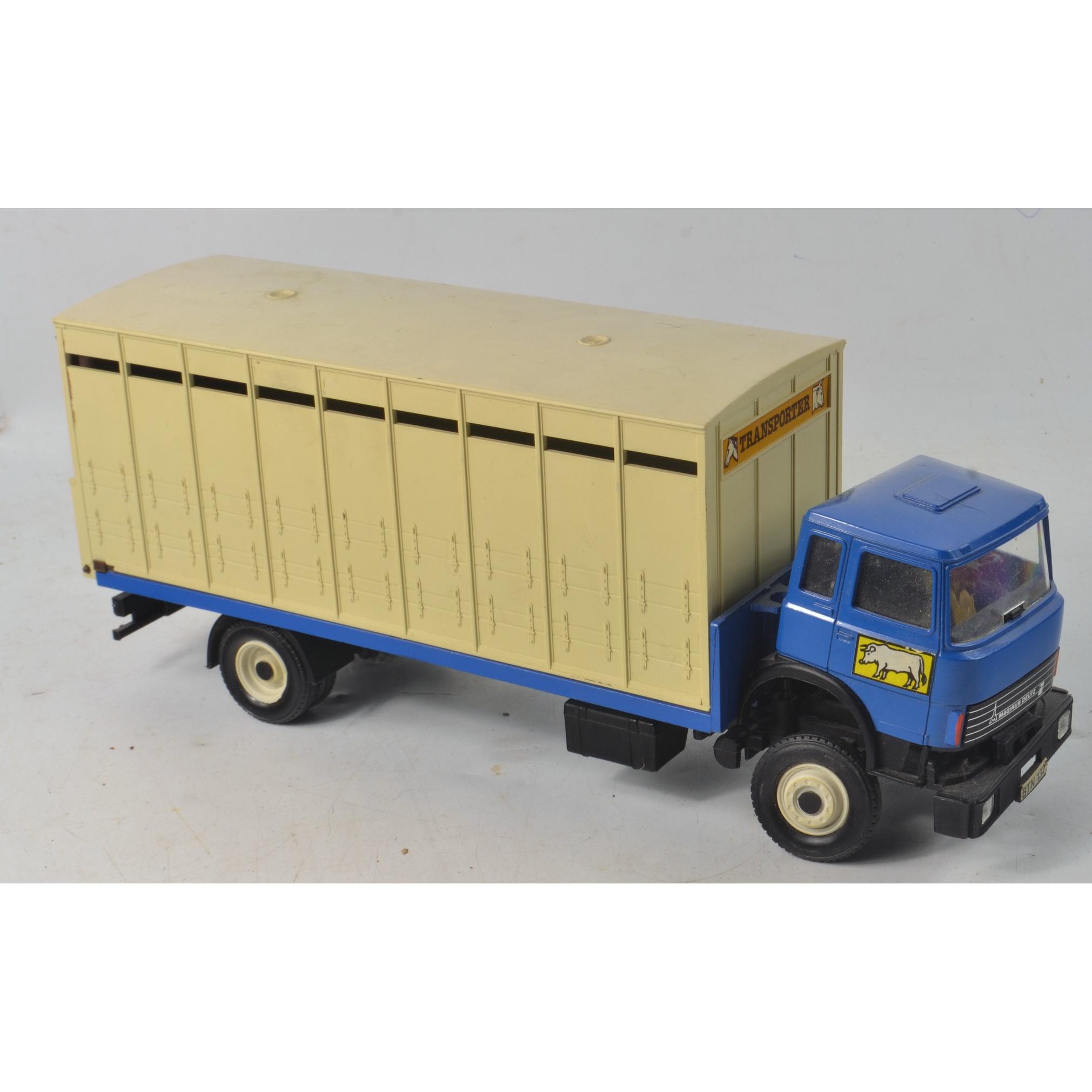 A LARGE Britains Farm Magirus Deutz IVECO Animal Transporter Lorry Truck 9580 1:32 Scale 1989, one of the wheel hubs is missing, otherwise in good conditionL: 27cm approx H: 11cm approx