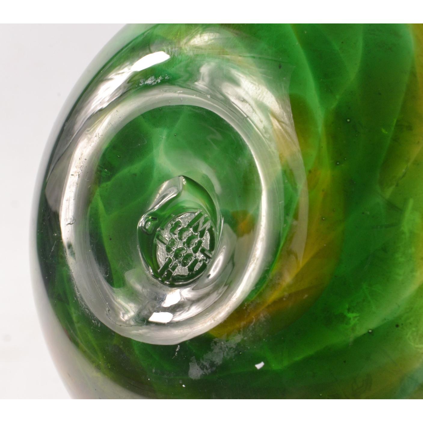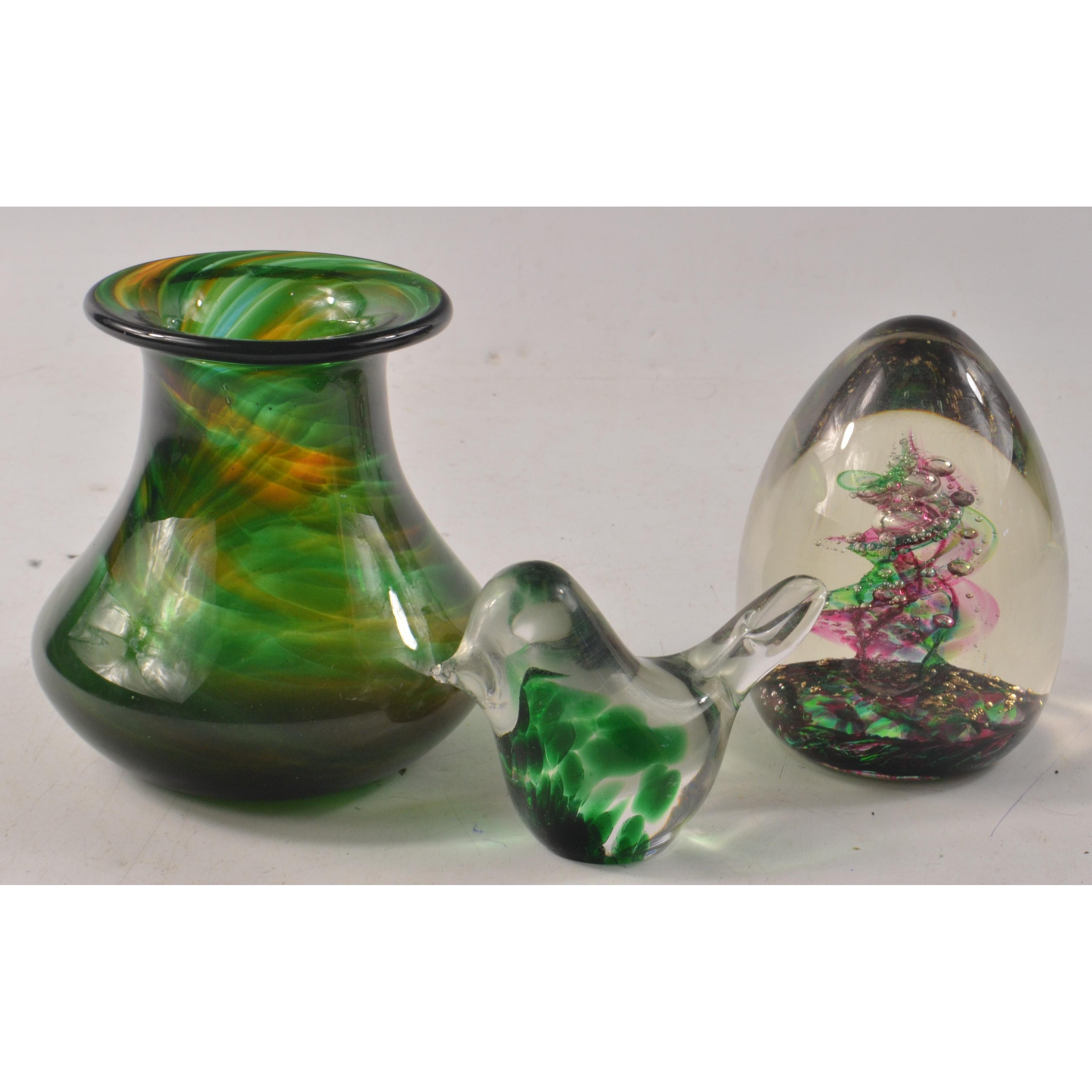 A NICE SELKIRK signed paperweight 8cm height with a HARTLEY WOOD & CO mouth blown glass small vase 9cm tall approx with certificate with also a small glass wild bird paperweight 5cm tall approx