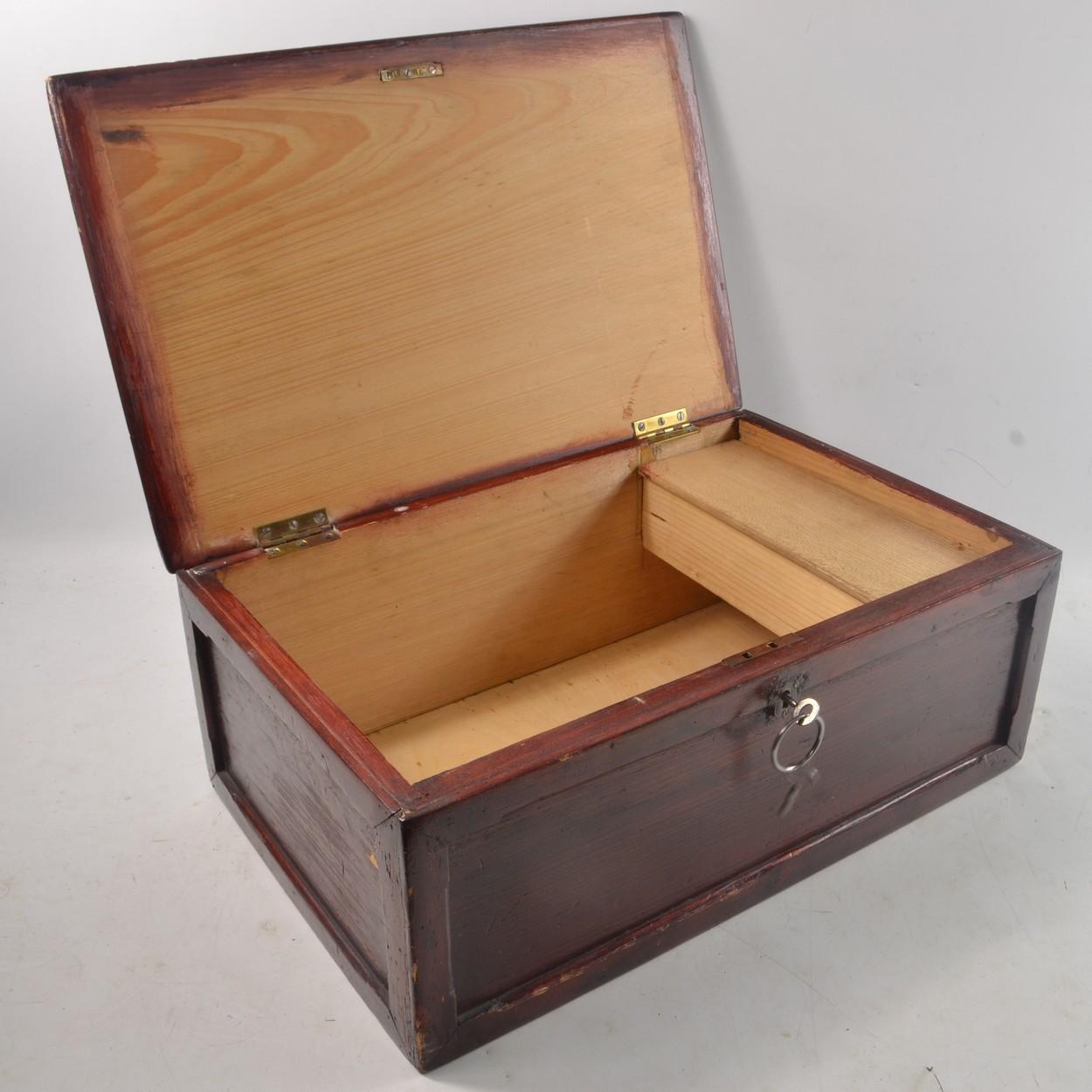 A wooden storage box with key