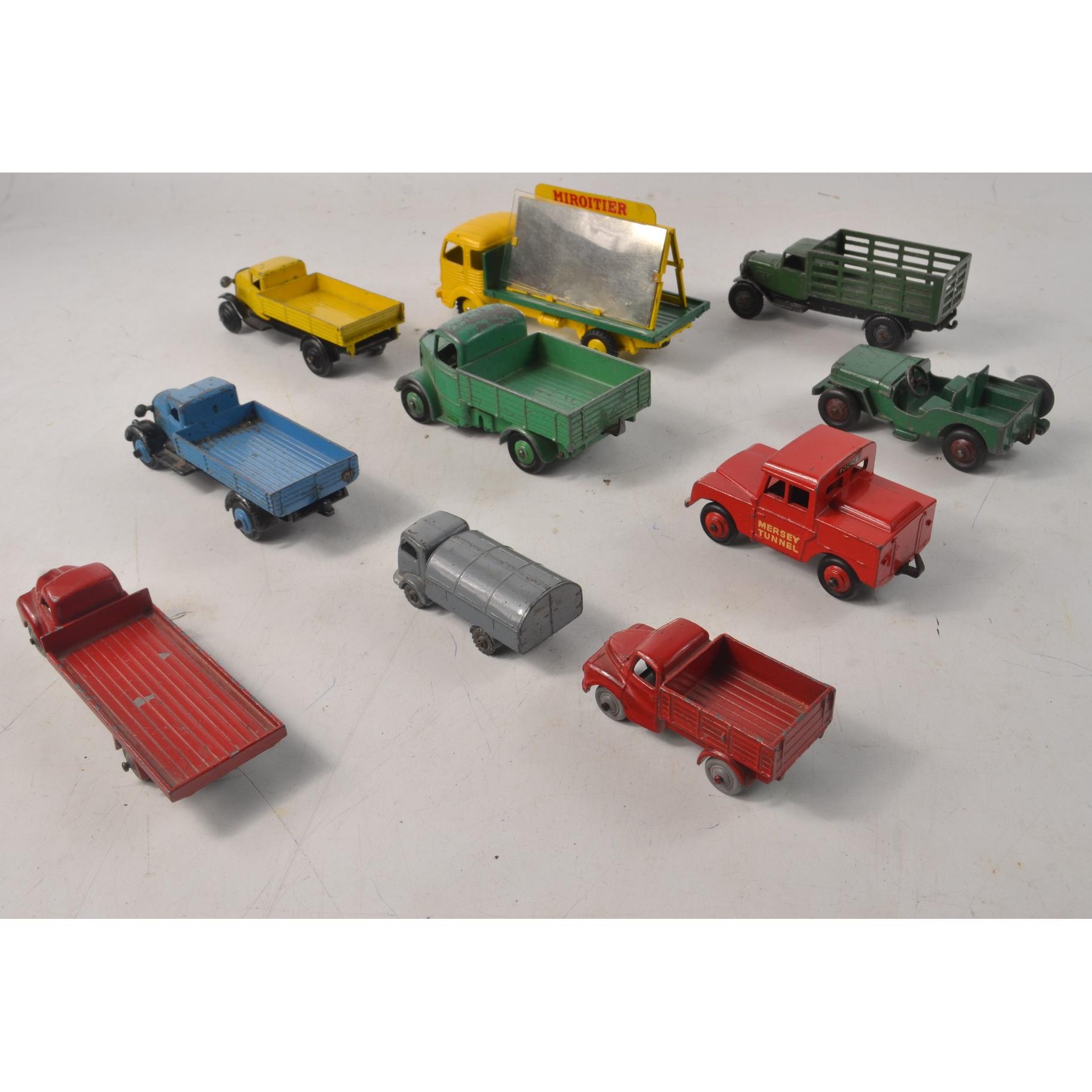 NICE COLLECTION OF DINKY - Mainly vintage DINKY trucks and UNBOXED , to include a Dinky Toys No 25y Jeep, front windscreen missing, light play-worn, also a 1950's Dinky Toys 411 Bedford Fixed Bed Truck in Mid Green in light play-worn condition, also a DINKY Original 1948 25f MARKET GARDENER truck in light play-worn condition, also an ORIGINAL Dinky Toys No 30J Austin Lorry again in Light play-worn condition, aloso a Dinky 255, Mersey Tunnel Police Land Rover 1955-61in good condition, a more modern Dinky Simca Cargo No33 (made in France), two c1950's original Dinky Dublo lorries a BEDFORD flatbed in red 10cm length, and an AUSTIN smaller Dinky Dublo both in light play-worn condition, another Dinky Toys