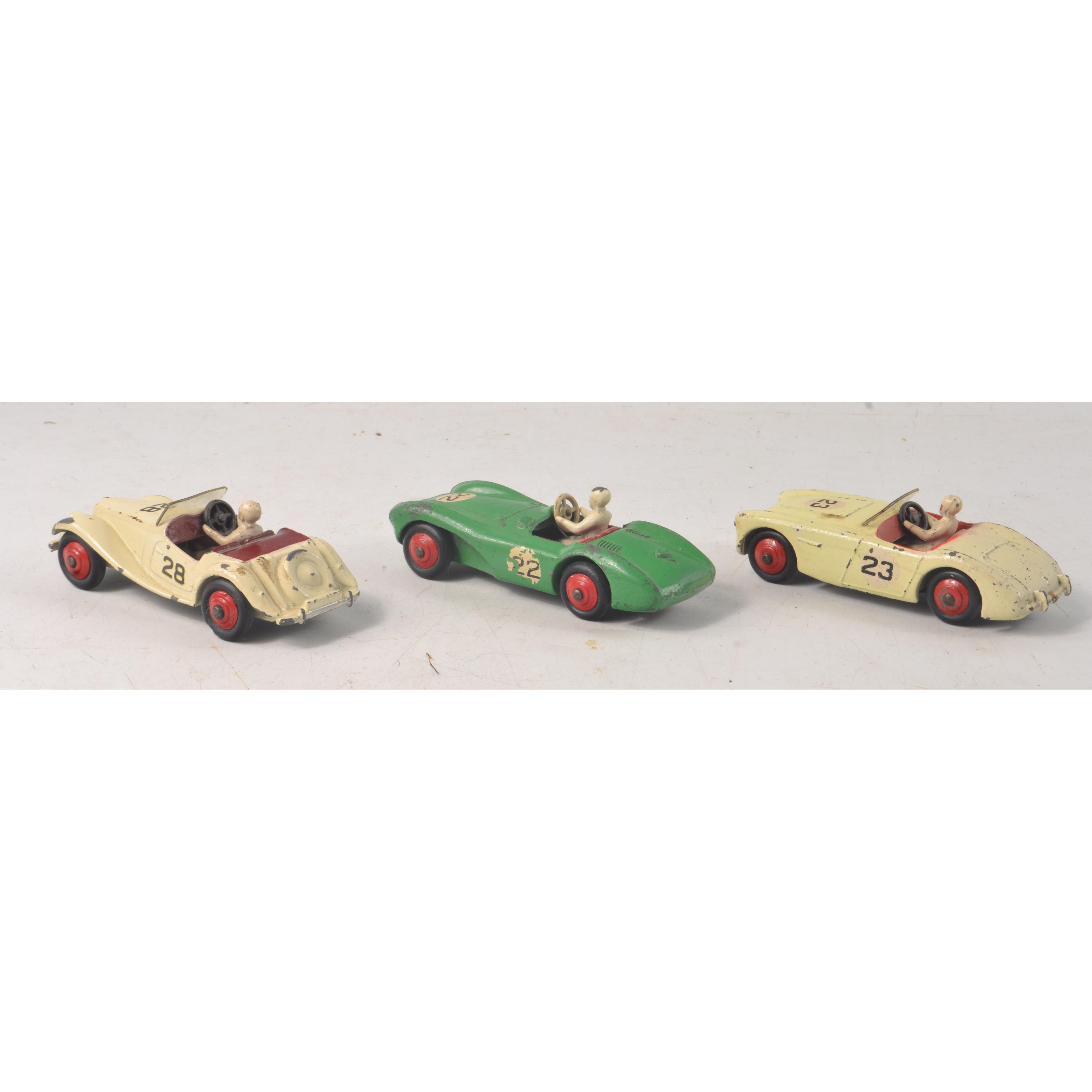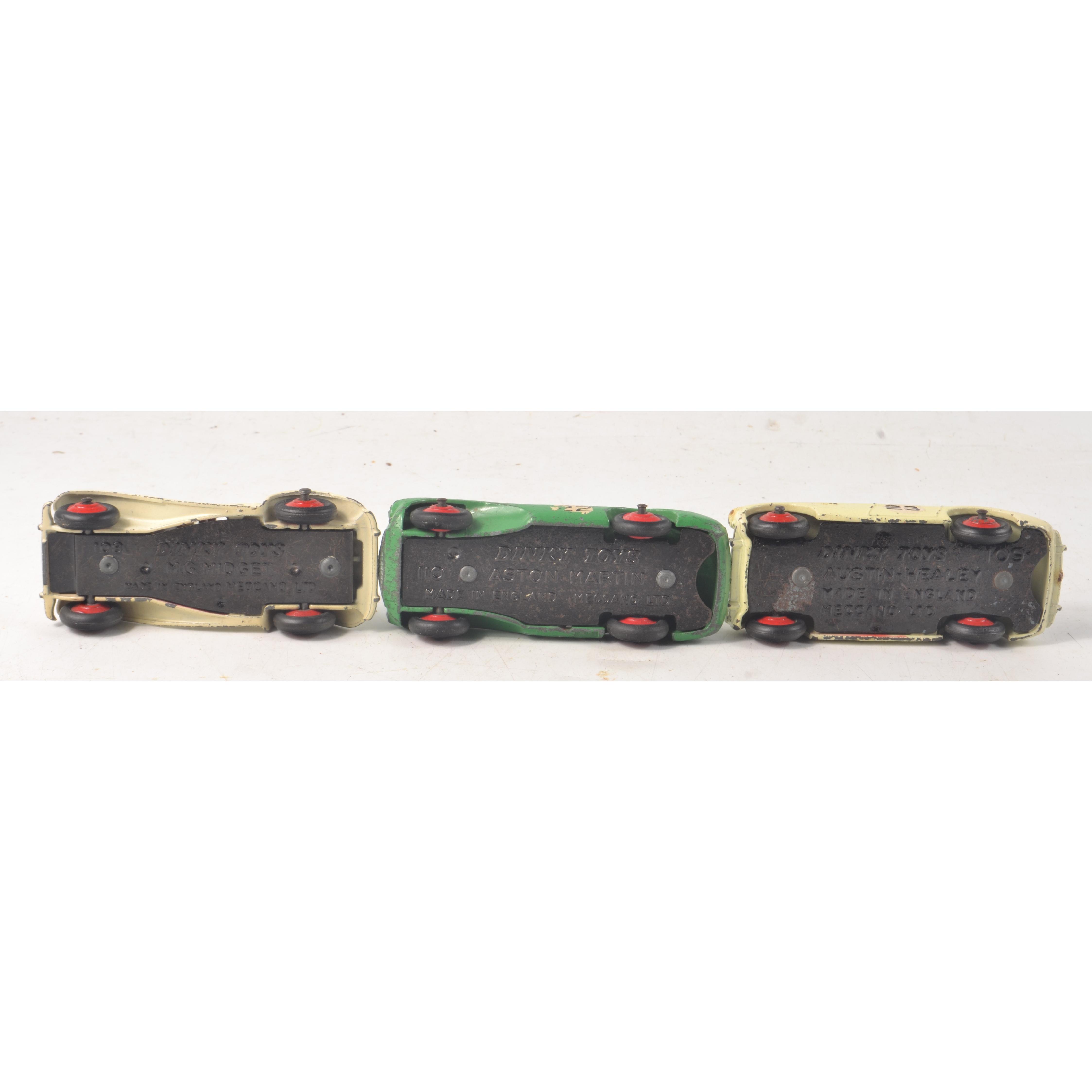 A DINKY TOYS RACING TRIO LEGEND No's 108 109 & 110!!! DINKY TOYS ASTON MARTIN 110 Meccano England 22 Racing Car No110 in light play-worn condition AND a Dinky AUSTIN HEALEY Racing Car 23 No 109 in light play-worn condition, AND a Dinky MG MIDGET racing car 28 No 108, again in light play-worn condition