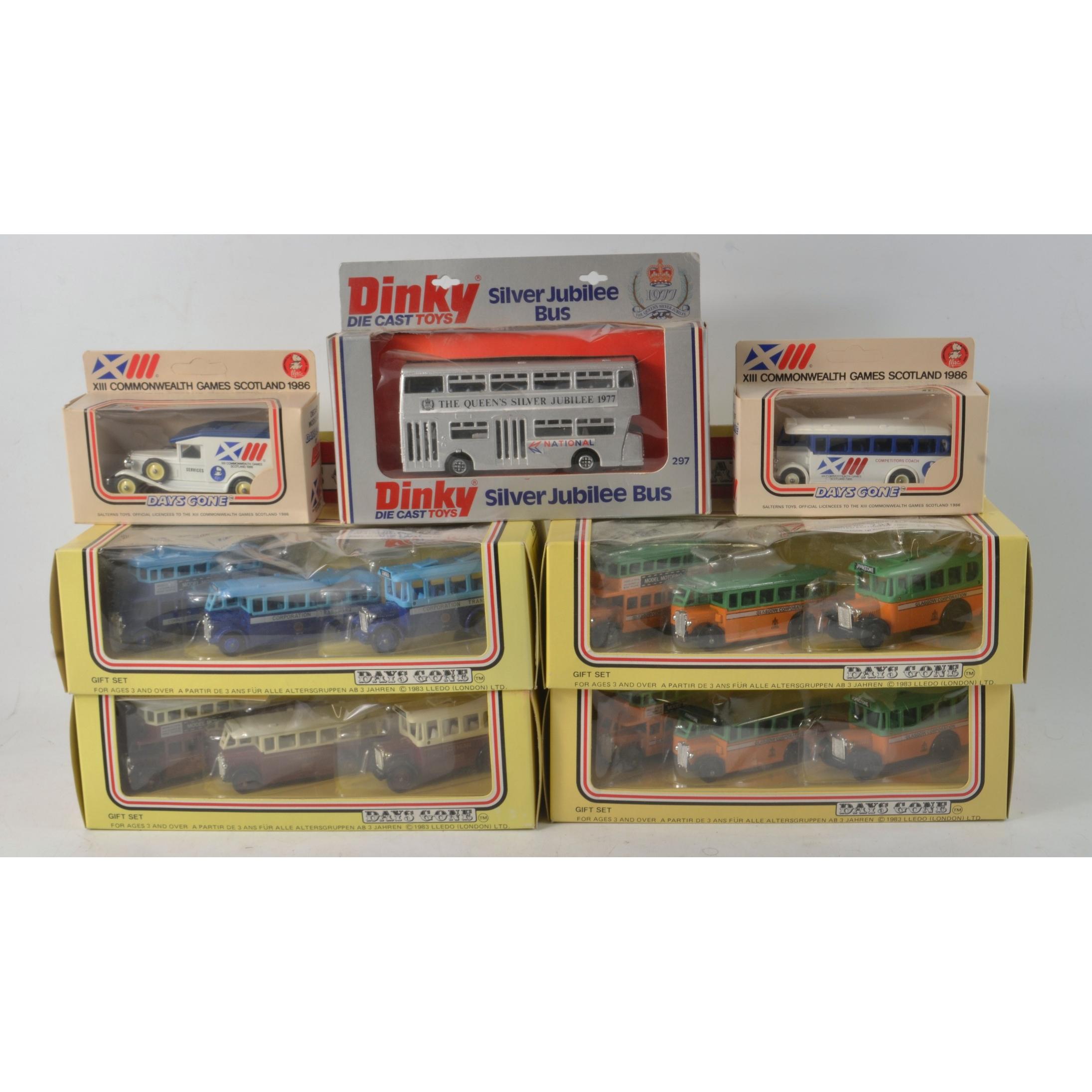 A collection of seven DAYS GONE mainly buses, all boxed to include Edinburgh Bus Gift Set , 2 x Glasgow bus gift set, 2 x qty diecast models of Commonwealth Games Scotland Commemorative buses 1986, Dundee bus gift set, a DINKY boxed Silver Jubilee Bus, `