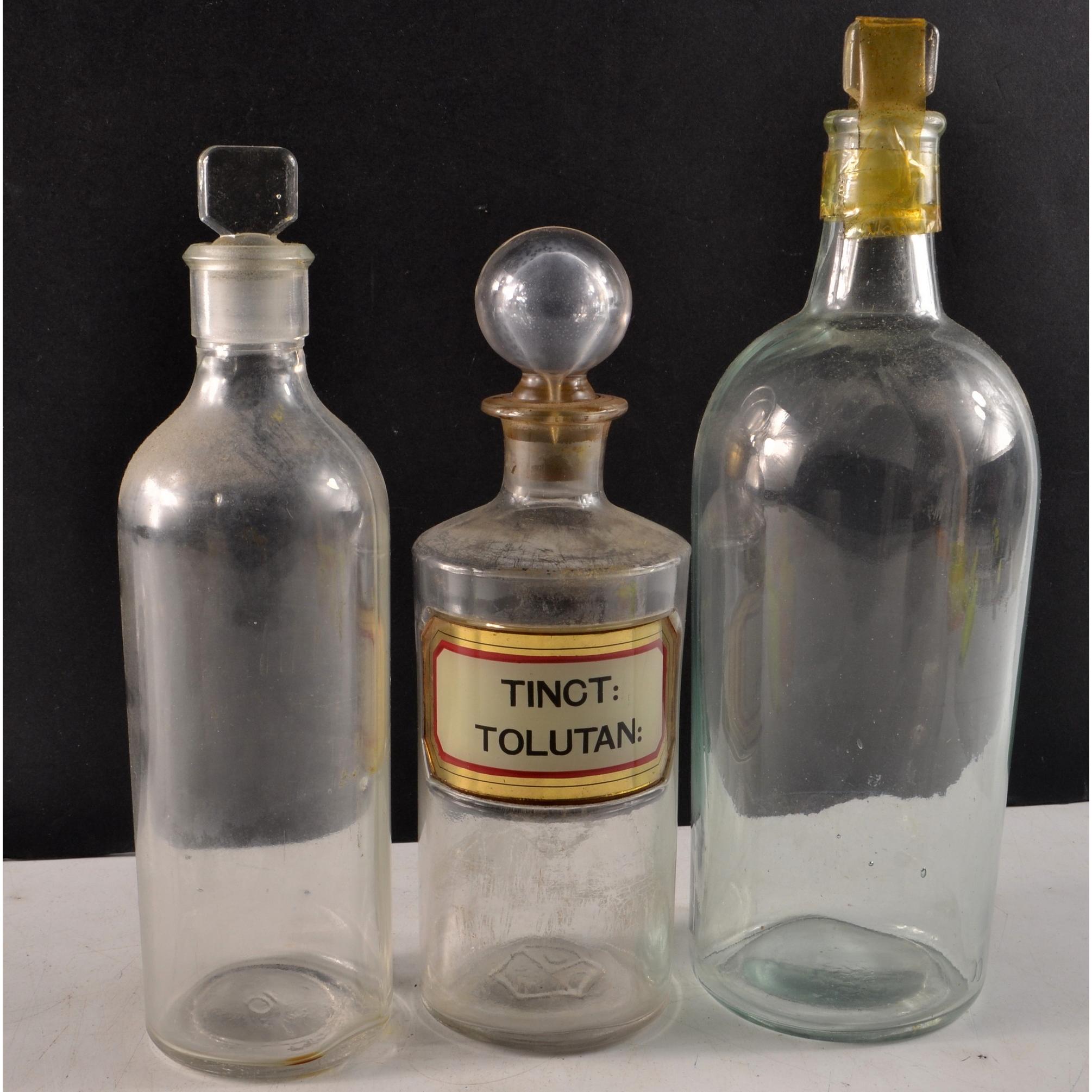 Three Antique Apothecary Bottles Collection Clear ground glass stoppers one with gold foil label in good condition the larger 24cm height the medium sized one 20.5cm, the smaller one 19cm approx Approx 3 pieces