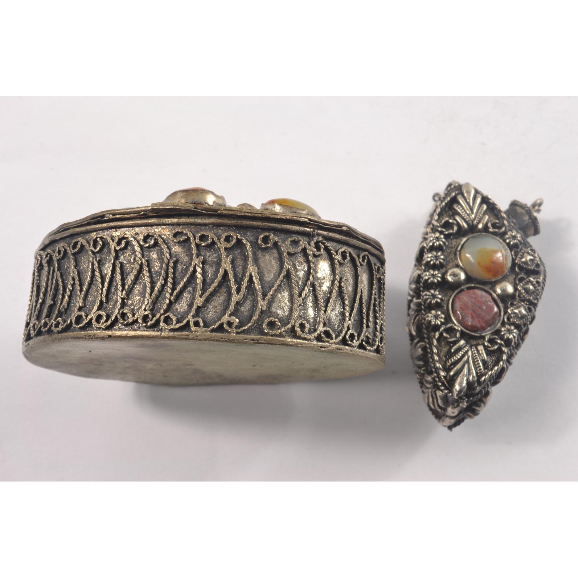 2 Pieces white metal work, 1 oval tin set with 7 different coloured stones, the second is a snuff/scent container complete with small dipper, and also decorated with multi coloured stones.