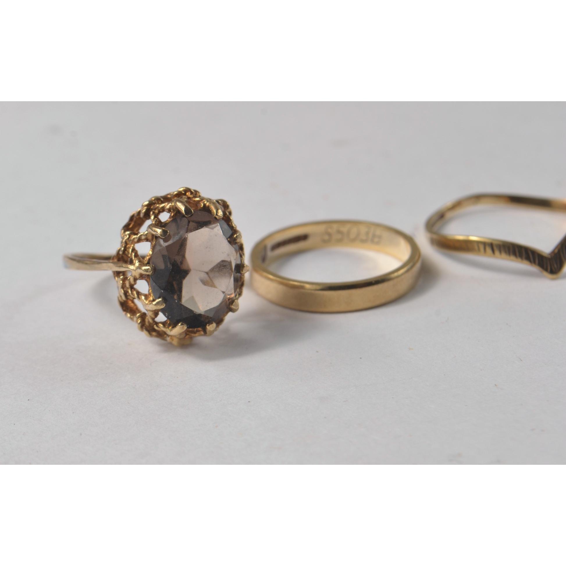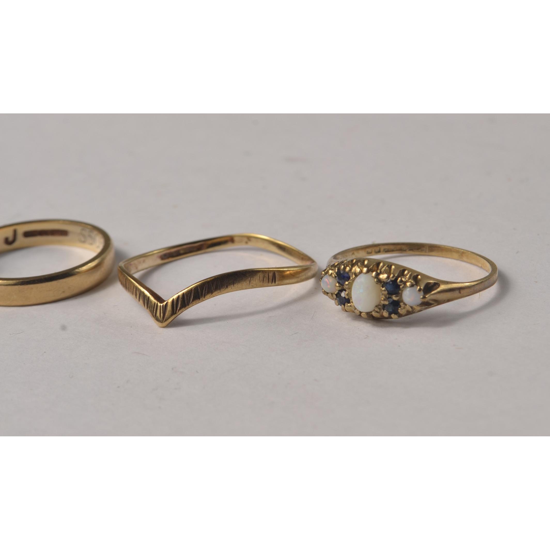 A 375 stamped yellow gold wedding band size J/K weight 1.80g, a nice dress ring with white opals and small blue stones 1.05g weight size K, another 375 stamped yellow gold dress ring size O(slightly mis-shapen) weight 0.85g, and lastly a 375 stamped yellow gold dress ring with a large smokey quartz inset weight 2.50g gross size K.