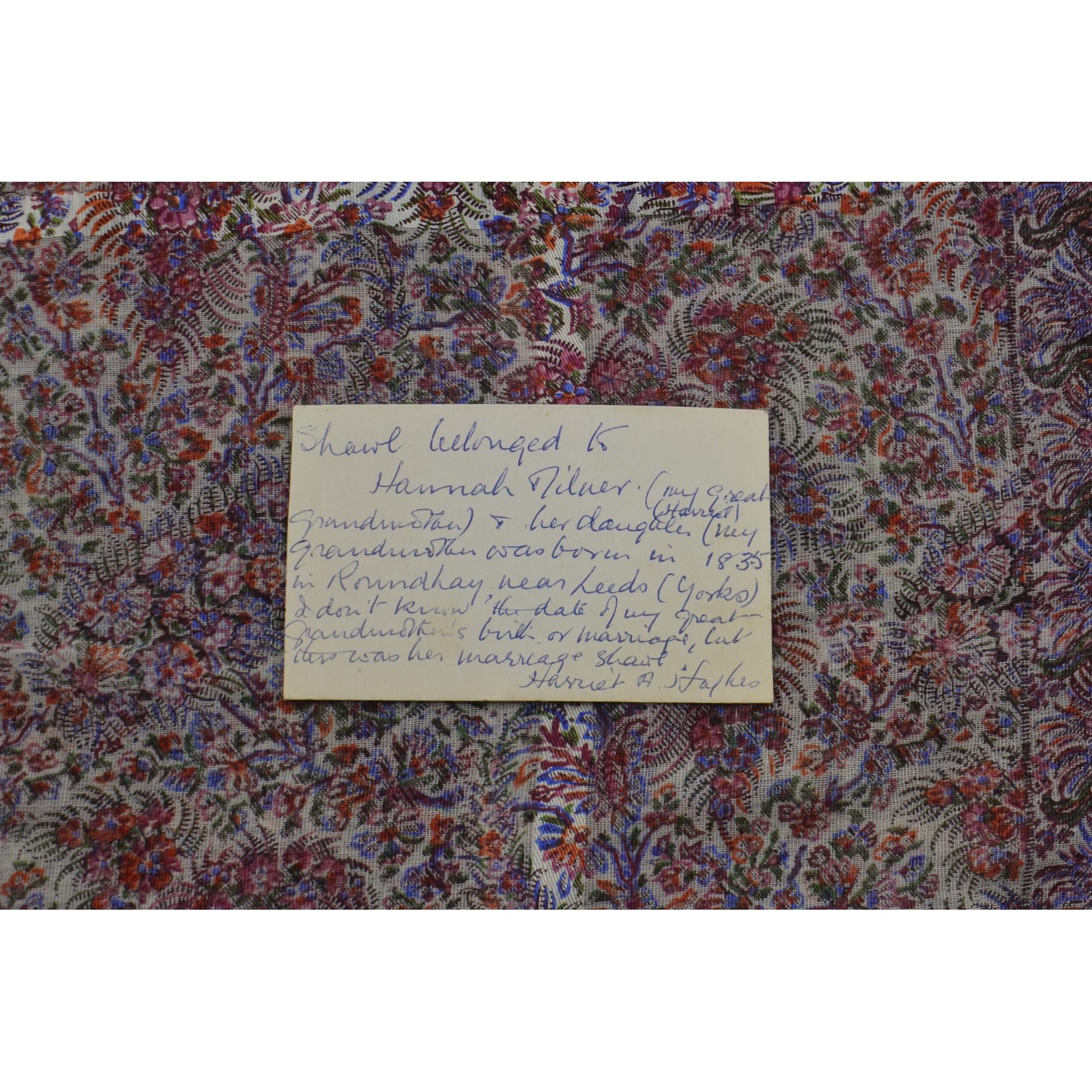 BEAUTIFUL SHAWL!! C1830 WEDDING SHAWL HANDED DOWN FROM GENERATION TO GENERATION by Hannah/Milner with a small note of provenance L: 11ft approx W: 6ft approx
