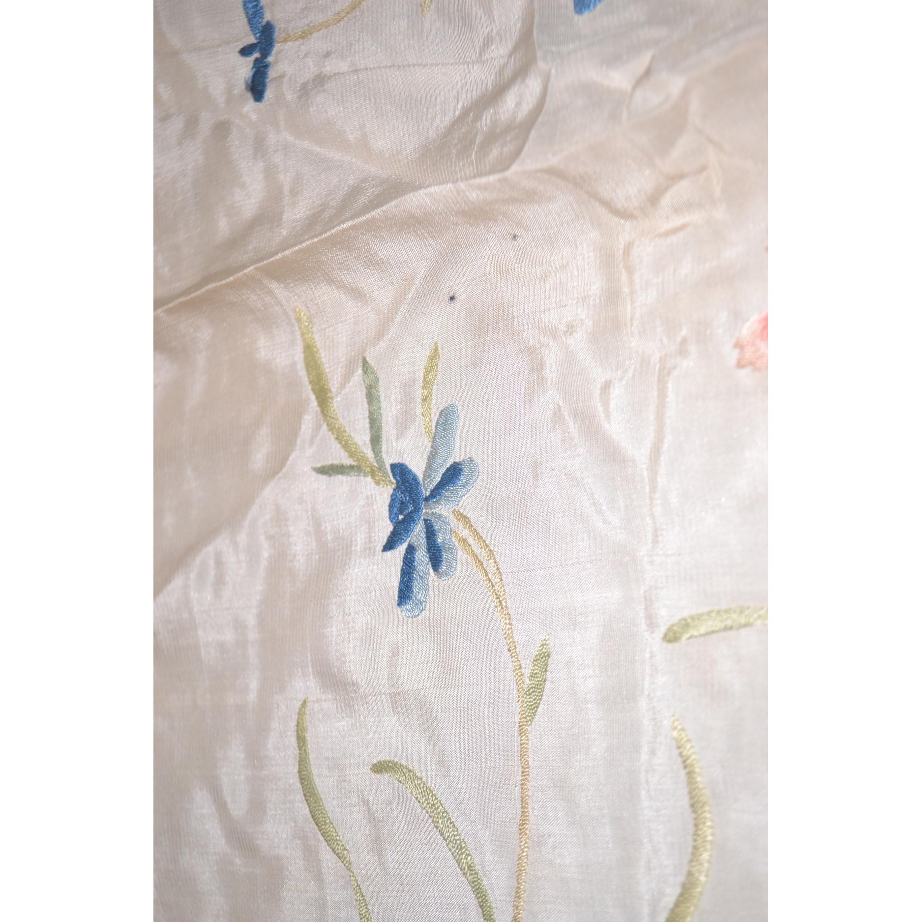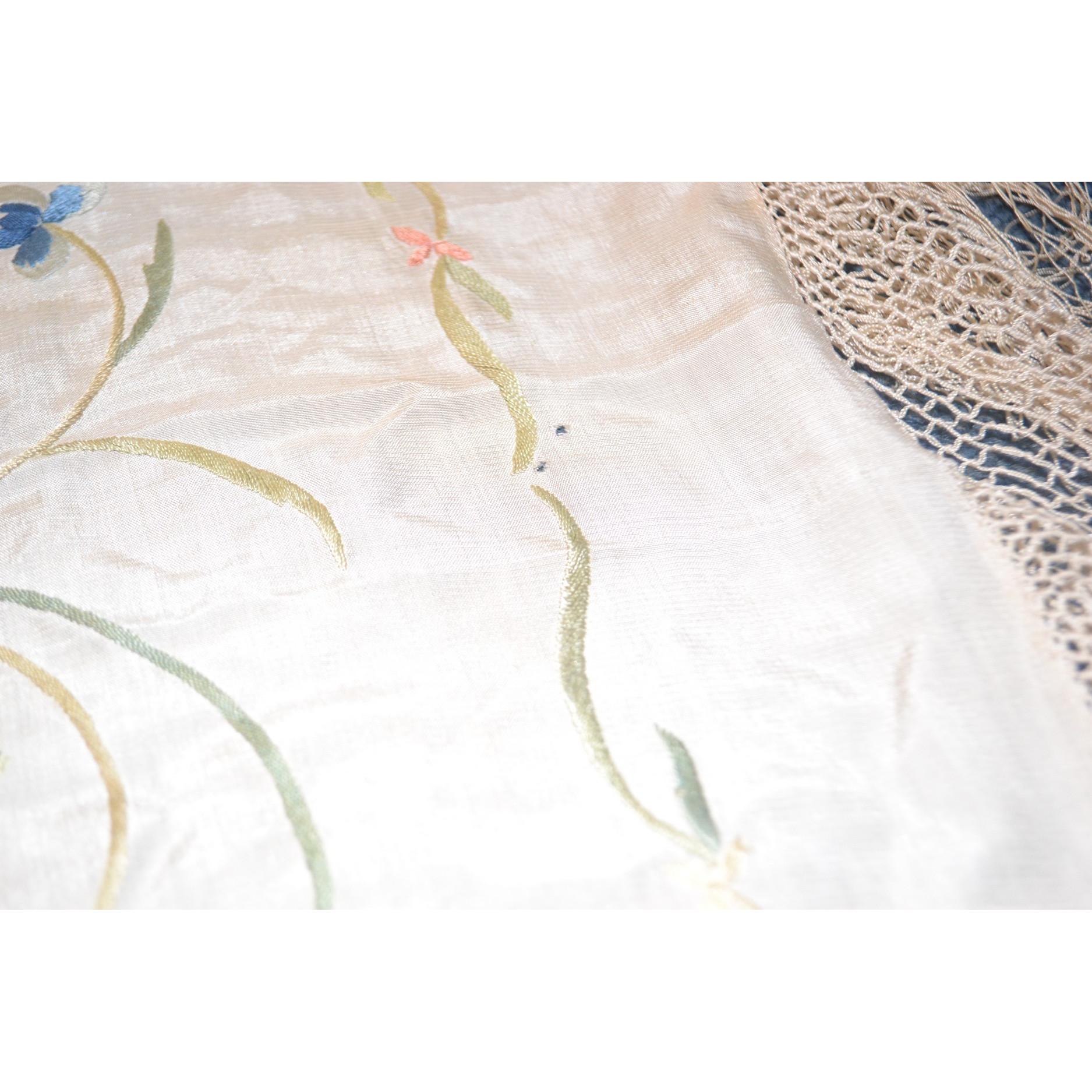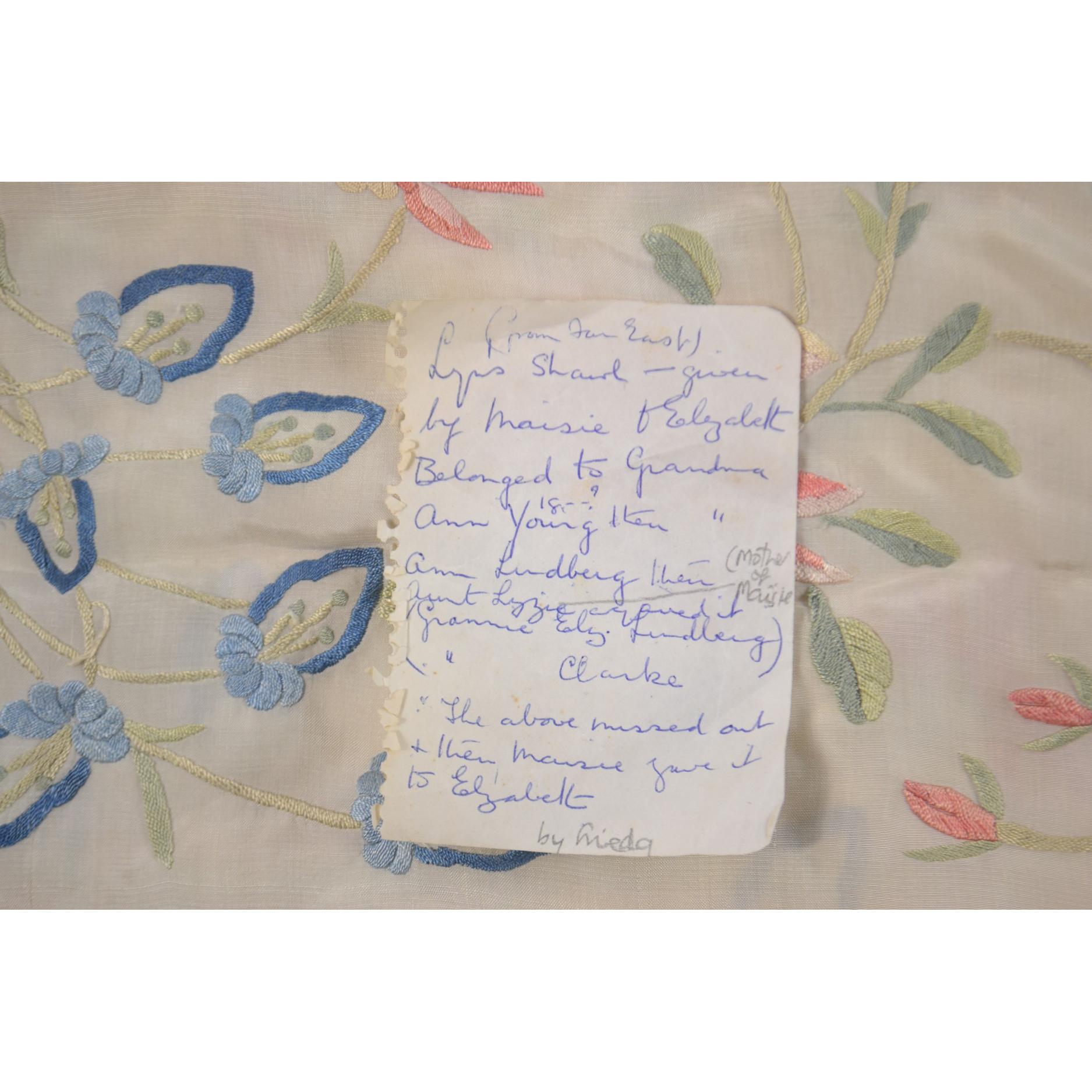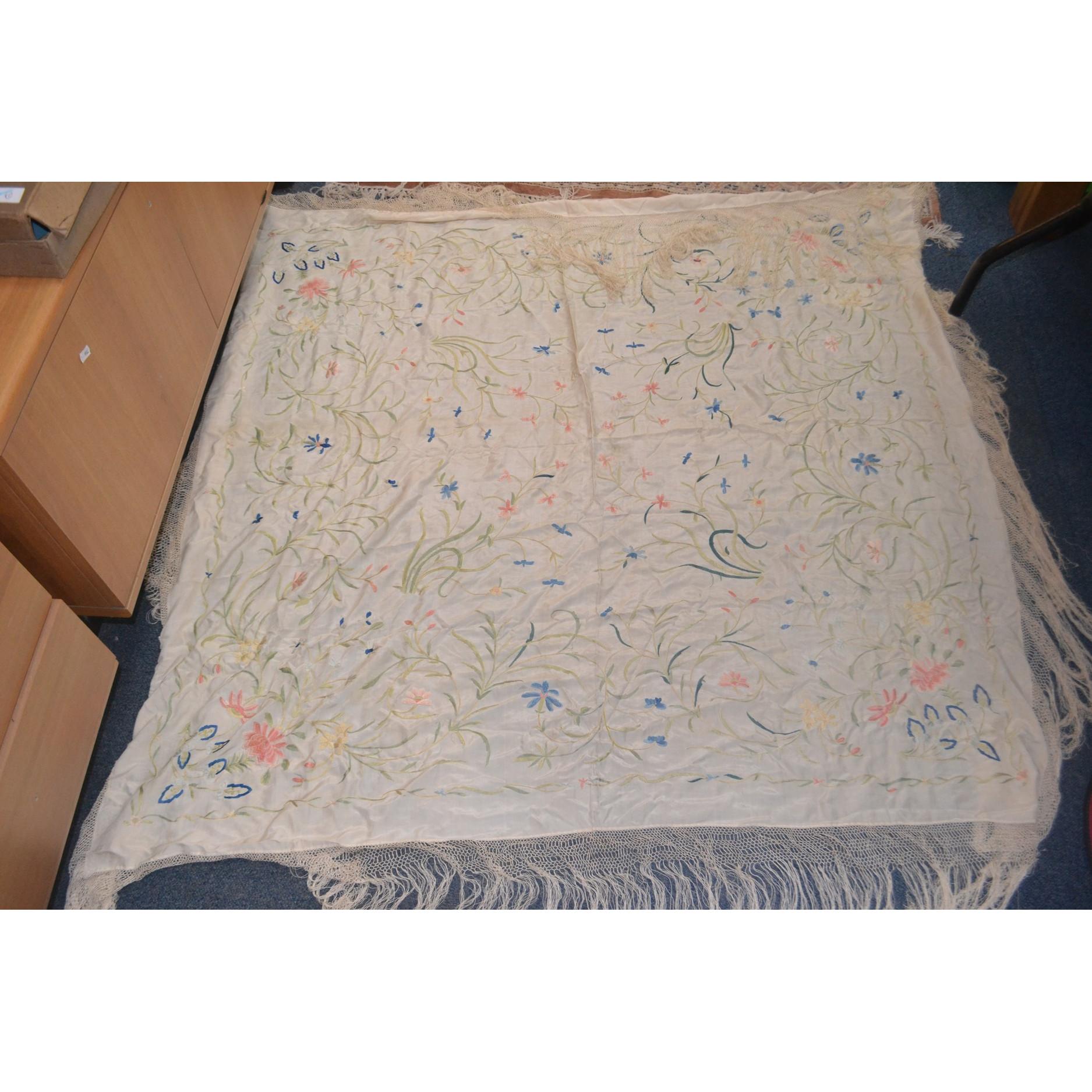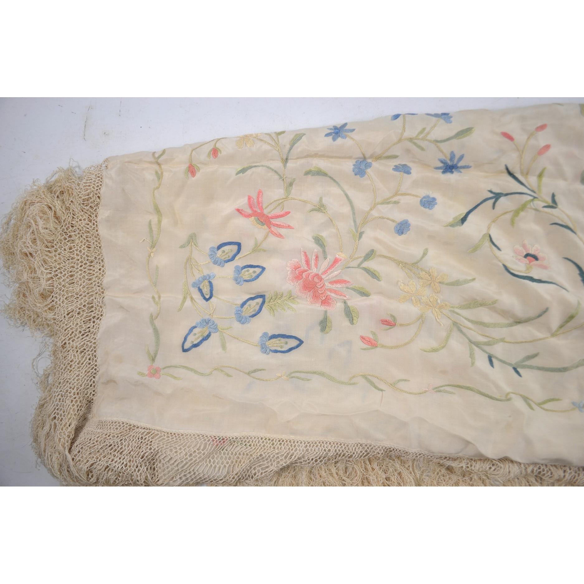 Vintage silk ( from the Far East) Wedding shawl All floral stitched handmade passed through the generations from one Family Lindbergs ( Sweden)L: 4.5ft approx W: 4.5ft approx