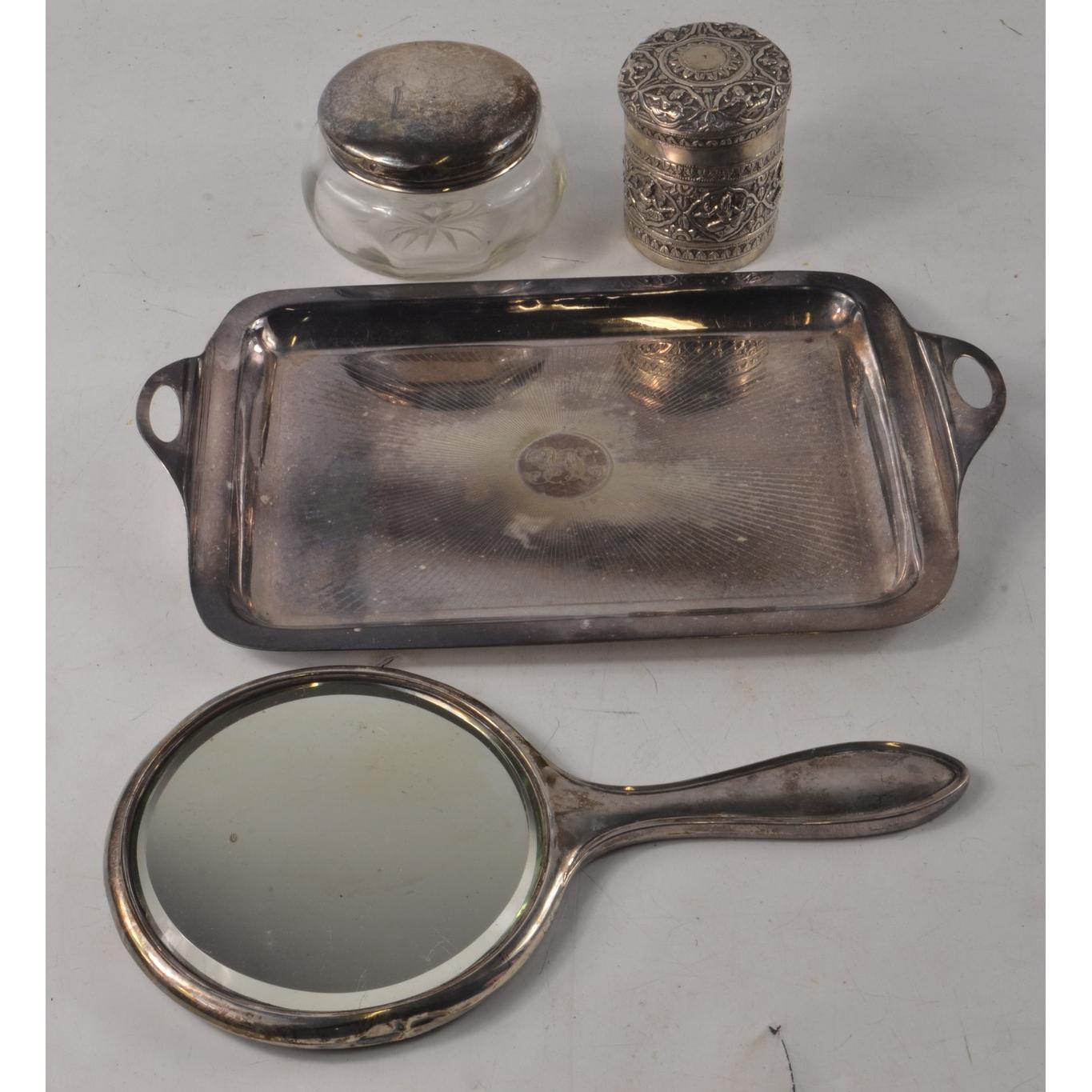 A Vintage silver hallmarked hand held mirror, hallmark is well rubbedd but still visible 26cm length 360g weight approx, with an INDIAN Silver lidded pot 7.5cm Height x 6cm dimeter weight 101g, and also a silver Hallmarked Birmingham lidded jar for the boudoir, silver lid weighs 22g and lastly an plated small twin handled tray 29cm long x 19cm wide approx