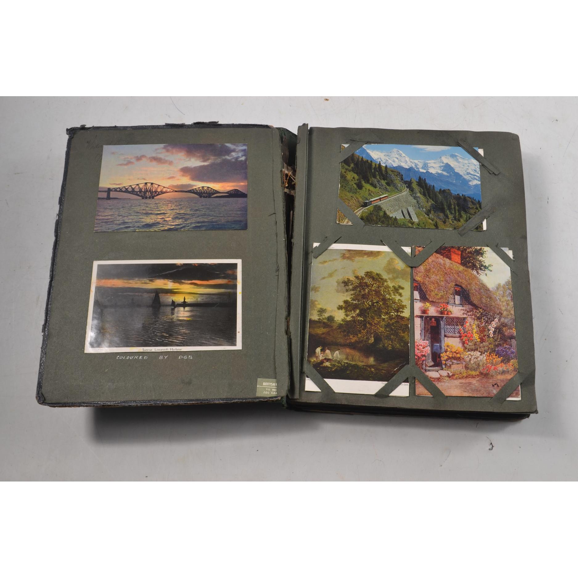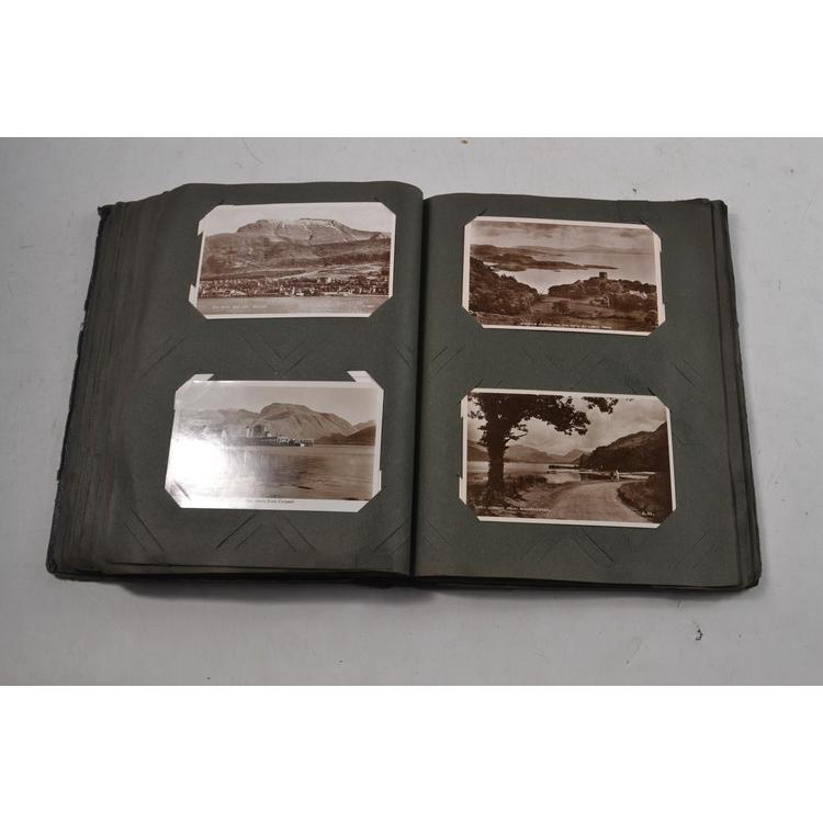 HISTORICAL INTEREST!! A medium sized vintage photographic/Old Photographs album subjects to include early BRITISH ISLES, also vintage Tall Ships like The Brittania, Gauntlett, Lowestoft Drifters, SCAPA FLOW? Naval postcards, The ROYAL MAURITANIA docked at Rosyth, SCOTTISH INTEREST MAINLY Dumbarton Castle, An Early black and white postcard of NEIDPATH CASTLE, Perthshire, Bonnington falls, The Teviot at Hawick, Views of Oban, Largs Golf Course and The Island, Grassmere etc etc